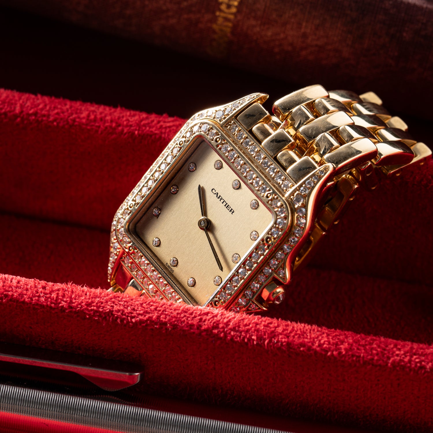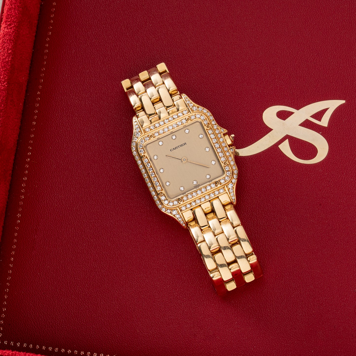 Over a century later, the Panthère line is still a fixture in the Cartier catalog, and the big cat motif appears frequently on watches, jewelry, and more. This particular Panthère de Cartier is a ladies’ or mens’ staple, fashioned in yellow gold with a gorgeous correct 18K yellow gold bracelet. This piece features a sunburst champagne dial with diamond indices and a matching diamond bezel and lugs.