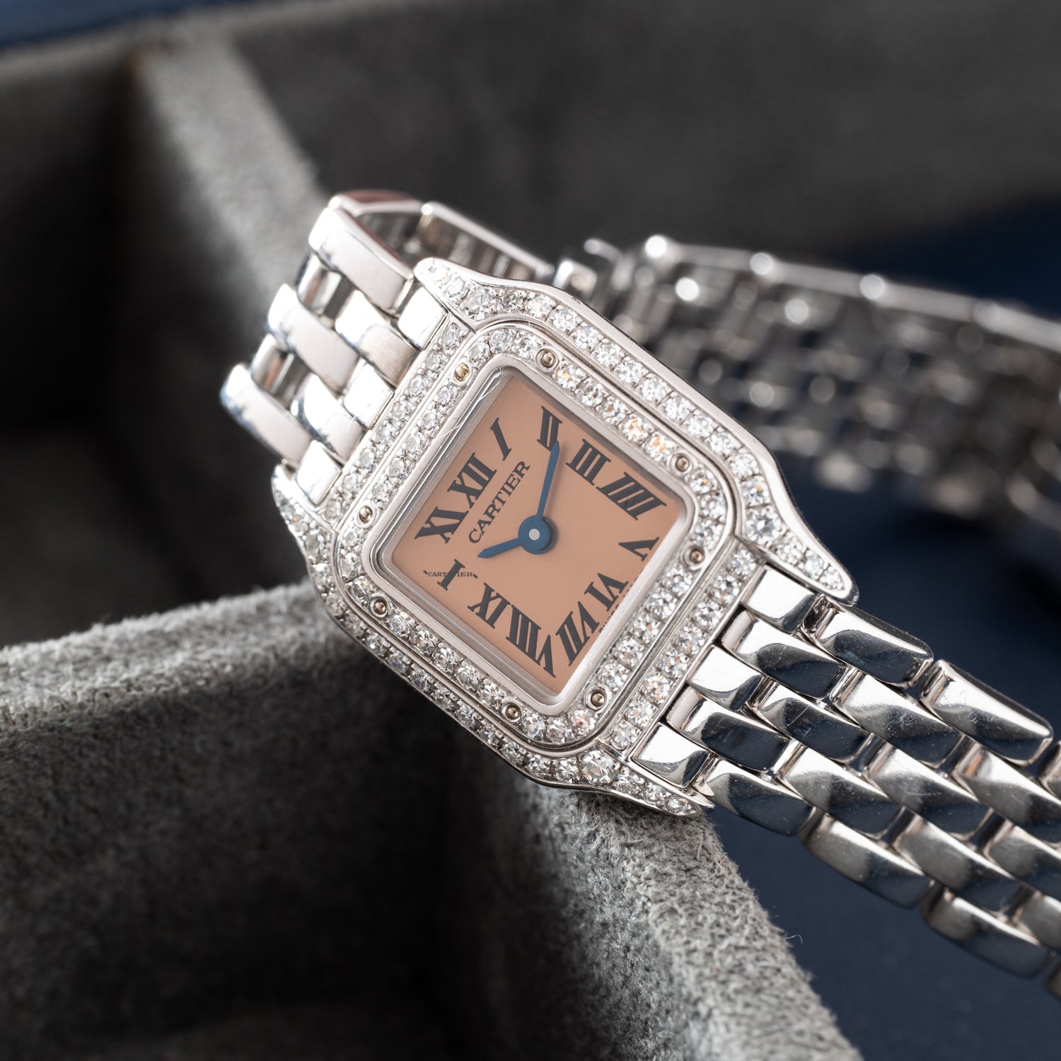 Over a century later, the Panthère line is still a fixture in the Cartier catalog, and the big cat motif appears frequently on watches, jewelry, and more. This particular Panthère de Cartier is a ladies’ wristwatch in the brand’s 'mini’ size. Housed in a 17mm x 23mm 18K white gold case, a sapphire crystal, and a stepped, smooth bezel with decorative rivets, it features a rare salmon Roman dial with a diamond-set bezel, and a matching blued-steel ‘sword’ handset.