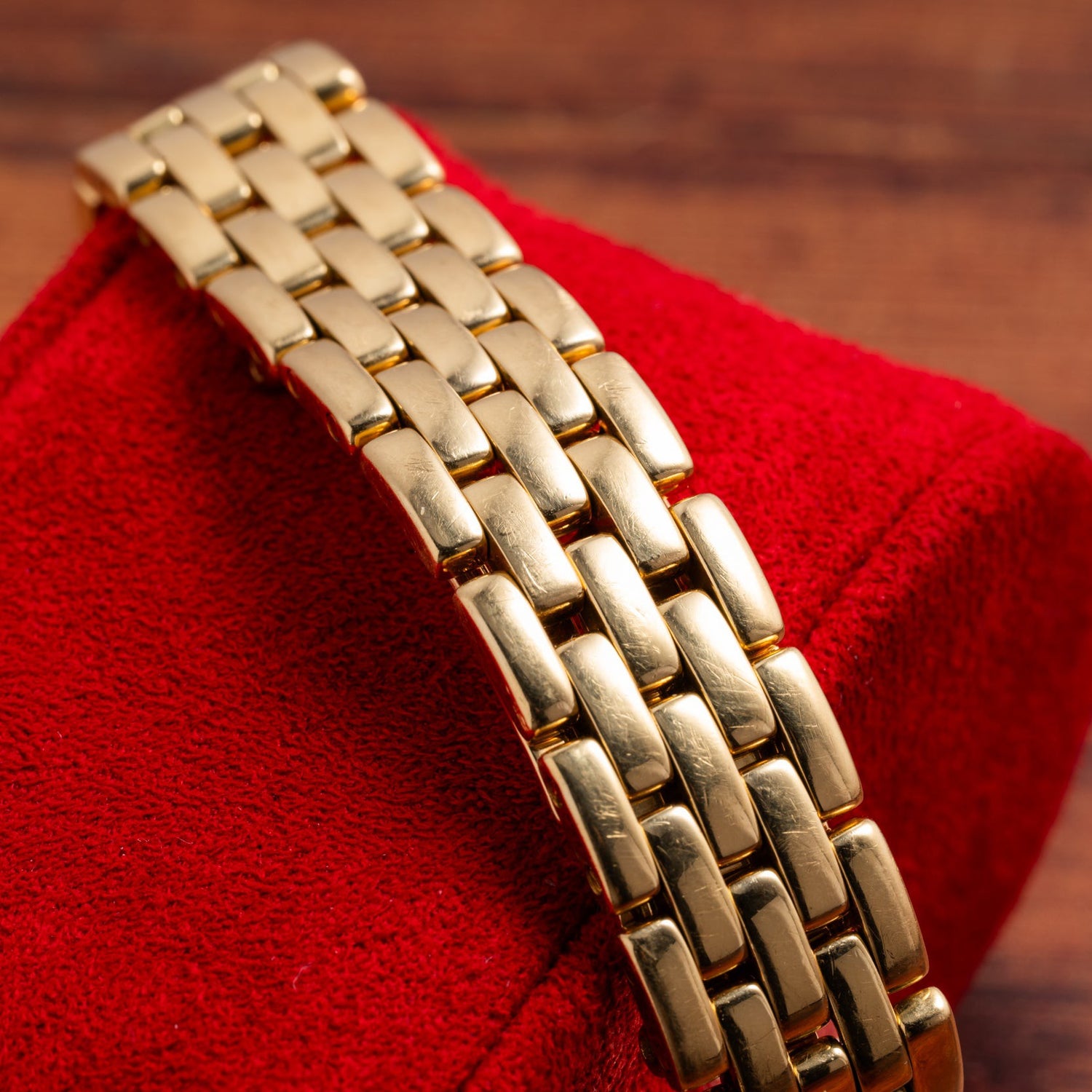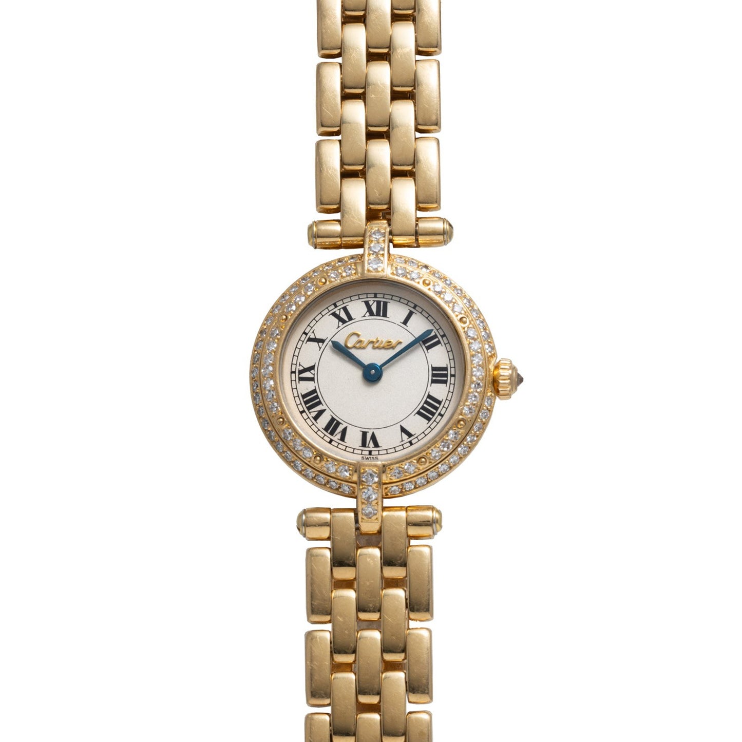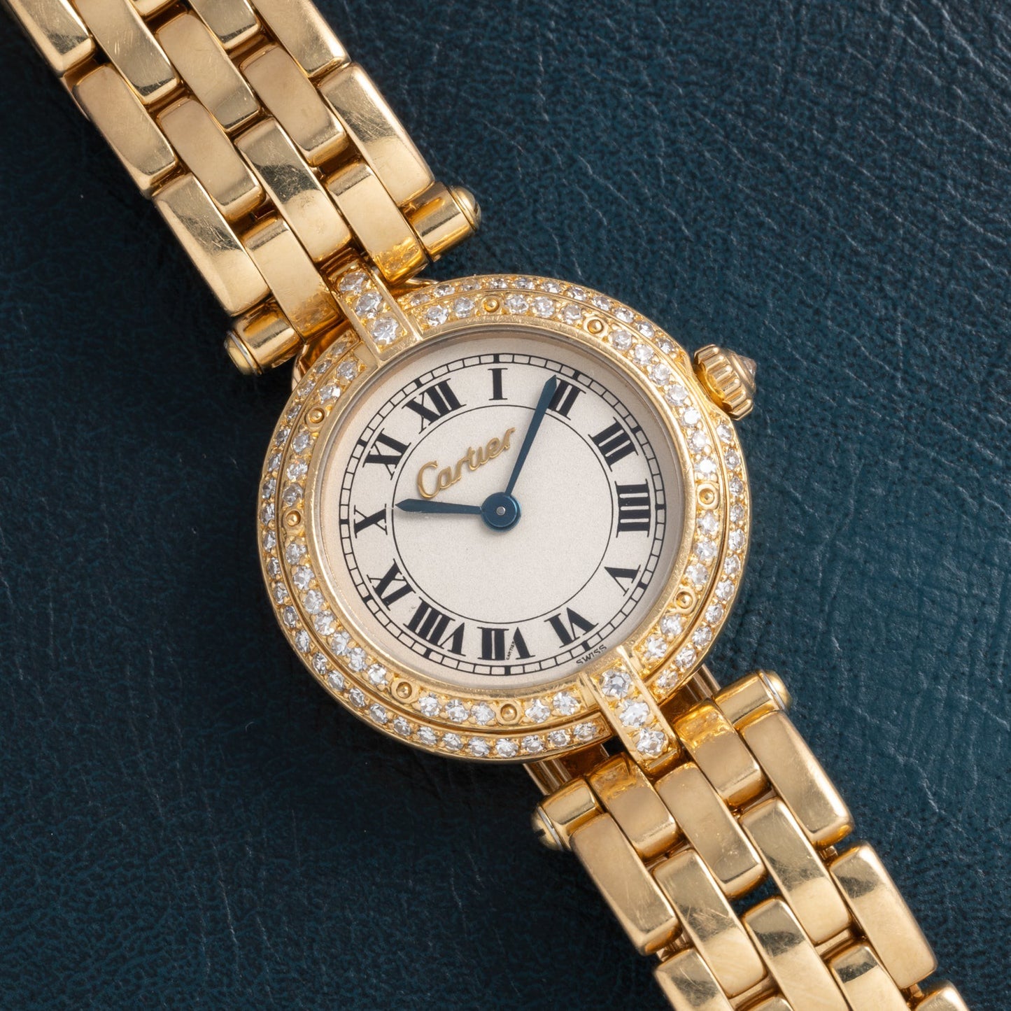 Take this 24mm 18K yellow gold Cartier Panthere Ronde, for example. Classy– no doubt— but packing far more interest than your run of the mill ladies offering. A textured silvery dial with applique Cartier logo, factory-set double-stepped diamond bezel and distinct lug-bracelet connecting system, petite handset, and a gorgeous 18K yellow gold multi link bracelet, this piece is beautiful and tasteful, but it is anything but boring. That’s the effortless balance we look for in high-quality ladies watches.