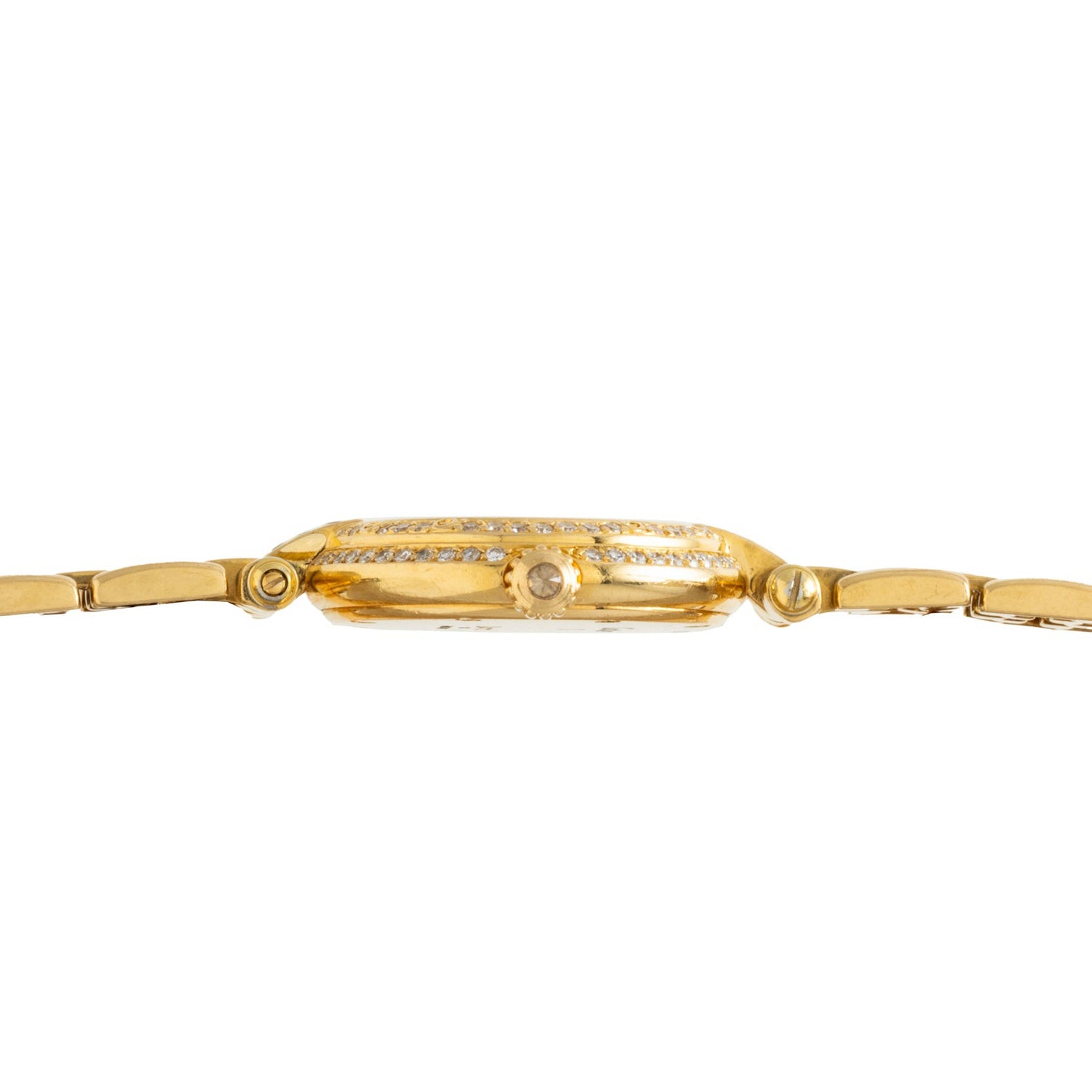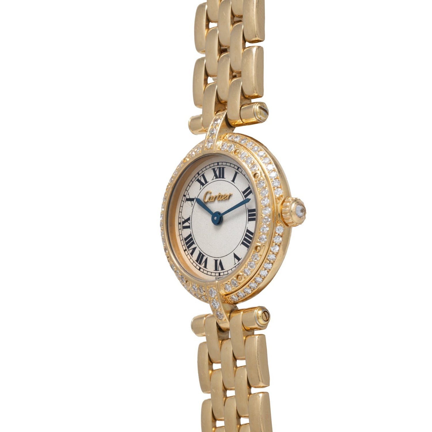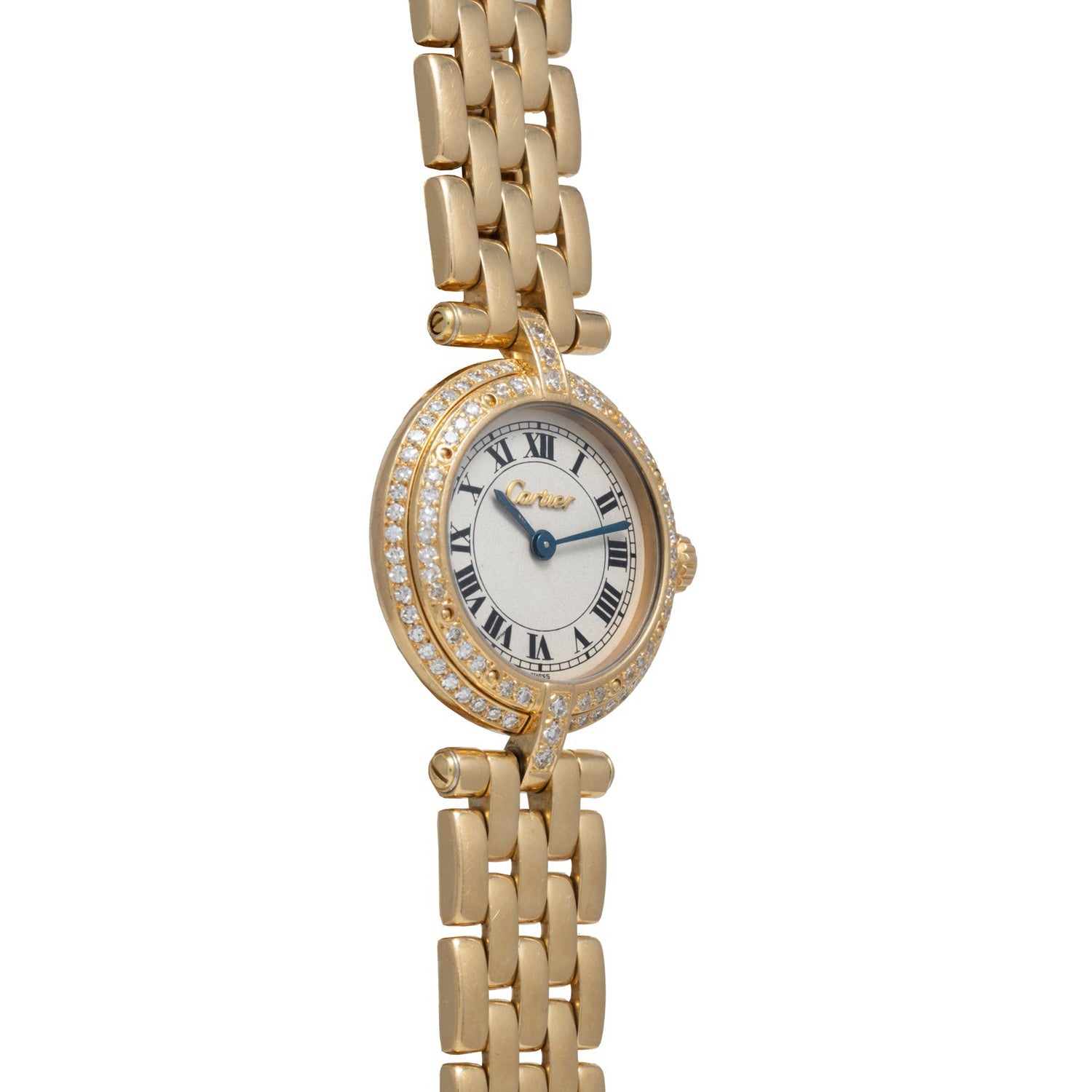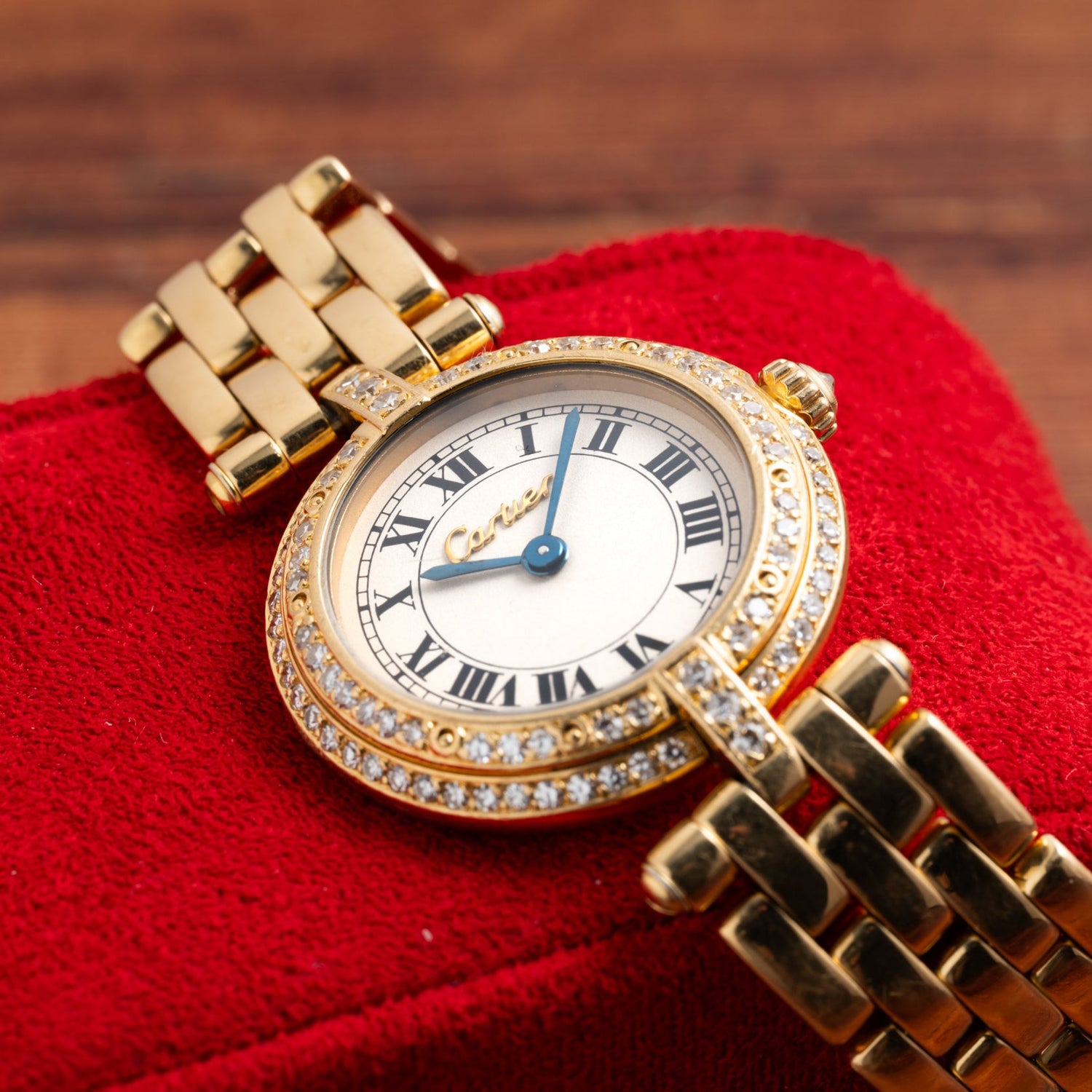 Take this 24mm 18K yellow gold Cartier Panthere Ronde, for example. Classy– no doubt— but packing far more interest than your run of the mill ladies offering. A textured silvery dial with applique Cartier logo, factory-set double-stepped diamond bezel and distinct lug-bracelet connecting system, petite handset, and a gorgeous 18K yellow gold multi link bracelet, this piece is beautiful and tasteful, but it is anything but boring. That’s the effortless balance we look for in high-quality ladies watches.