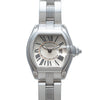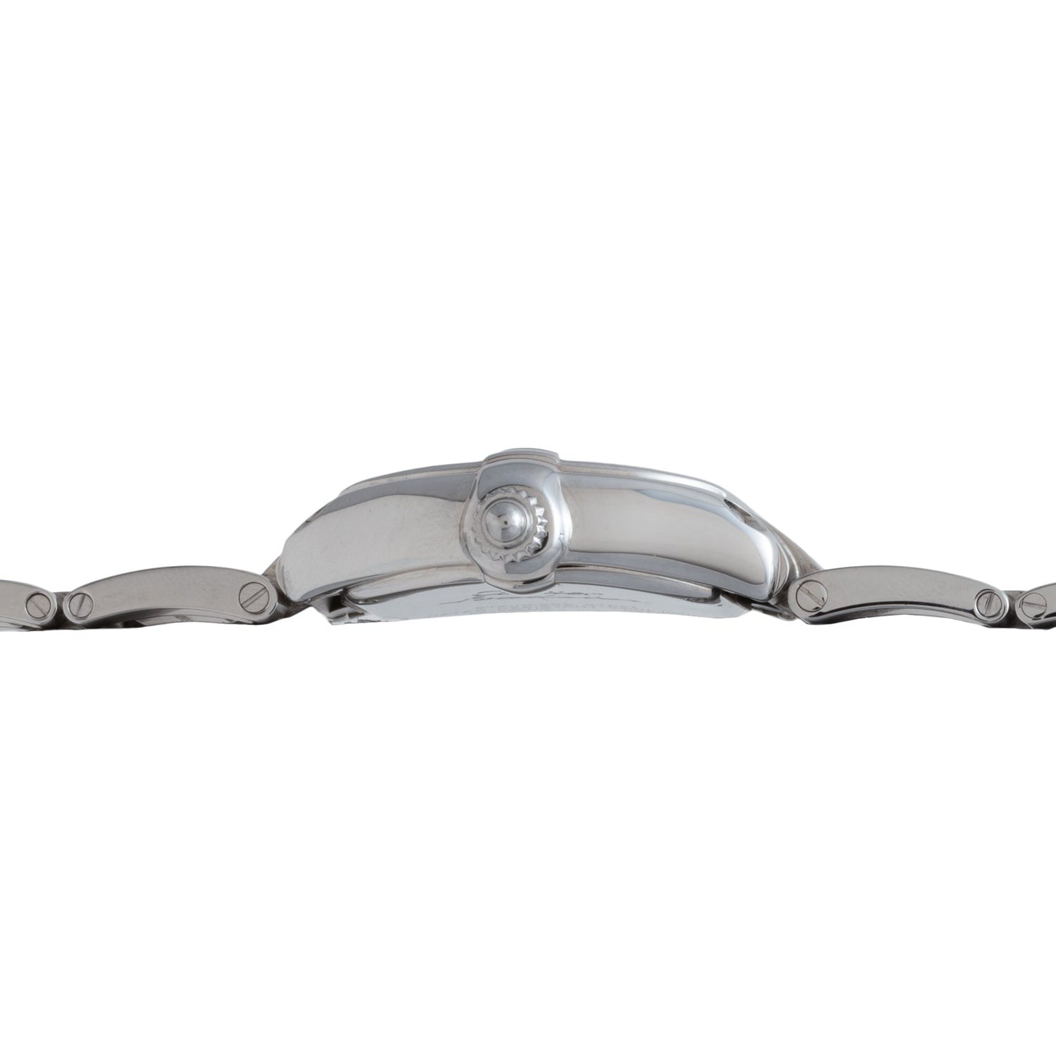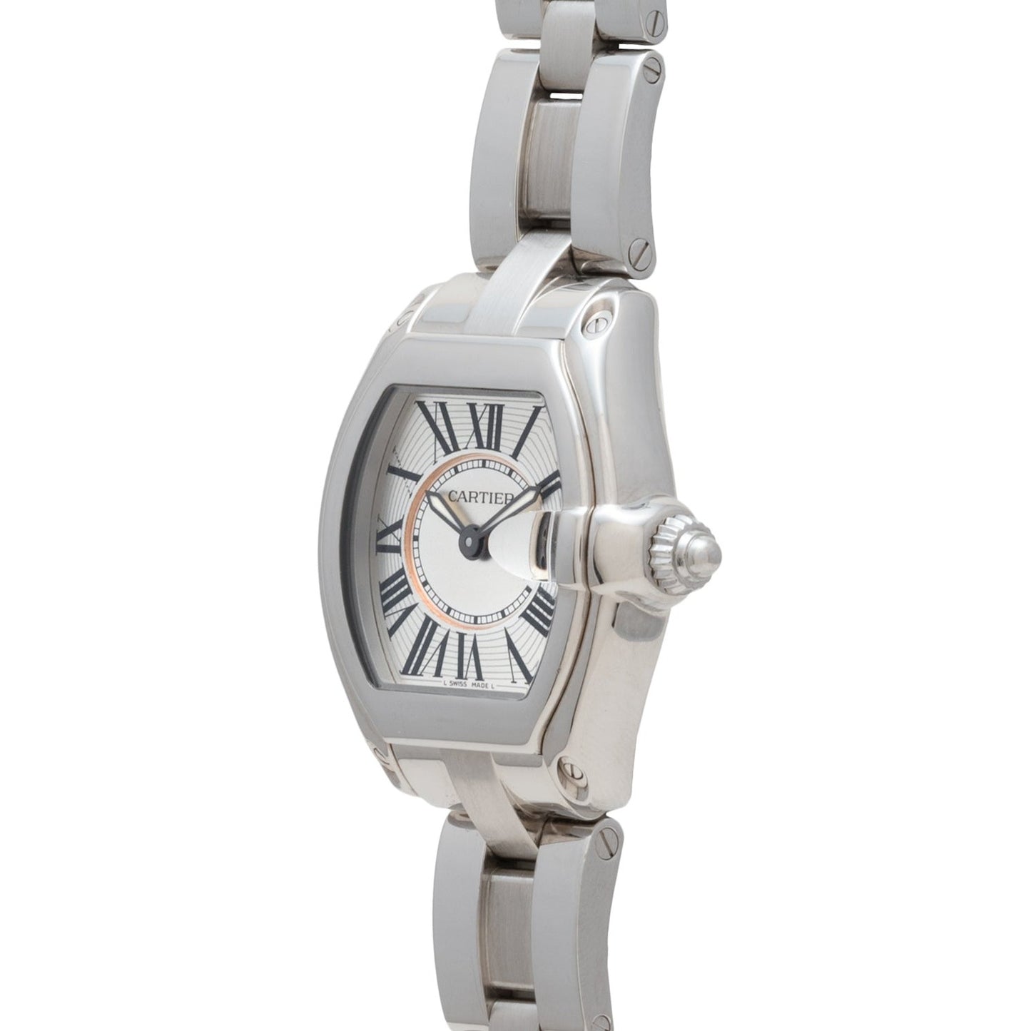 This particular Roadster from circa the 2000s, is housed in a 38mm x 31mm stainless steel case with a magnified sapphire crystal, a cabochon crown, and a smooth polished bezel. It features a well balanced, satin silver dial with printed black Roman indices and a recessed center section, with a matching luminous sword handset, and a matching stainless steel multi-link bracelet with a hidden clasp.