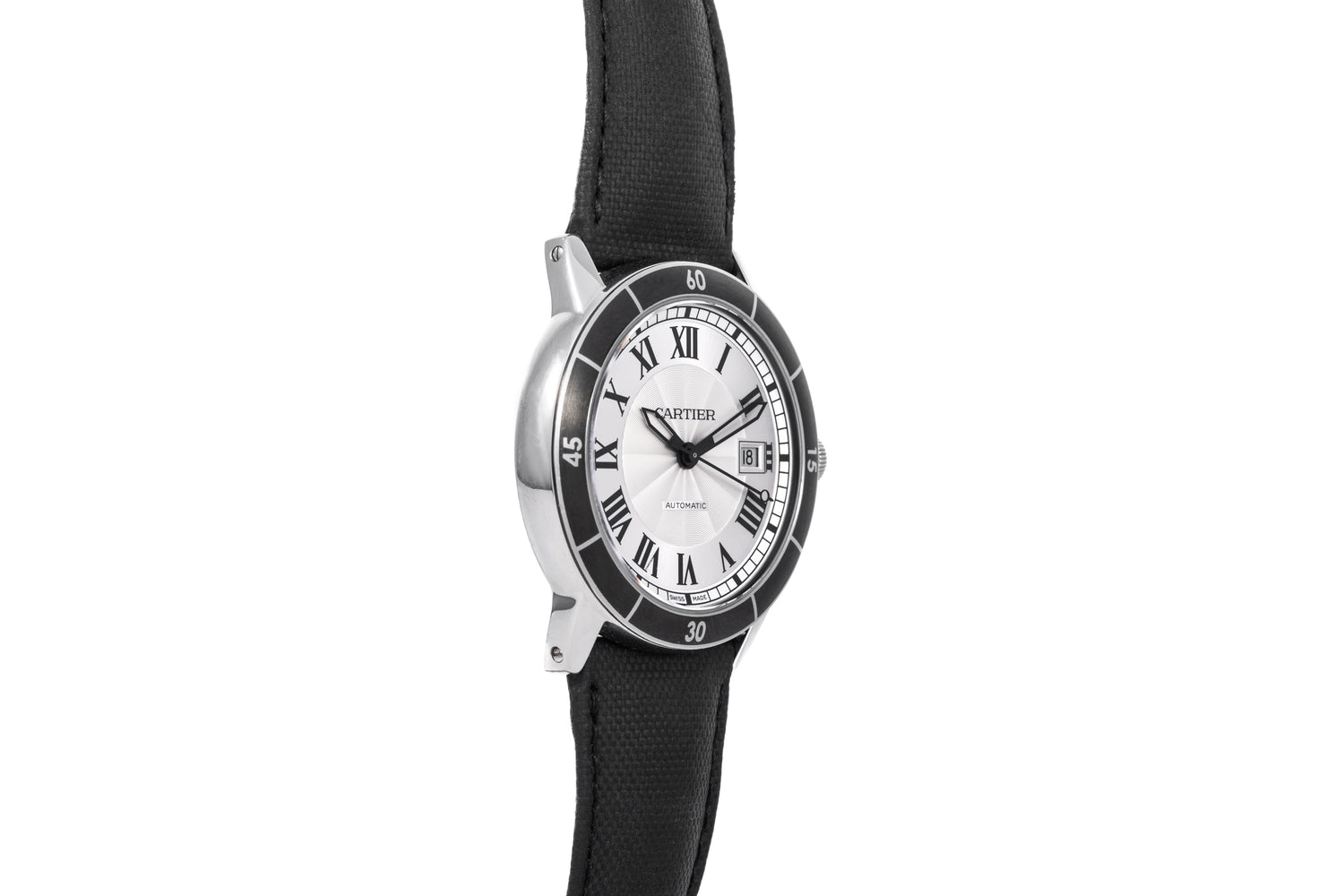This particular Cartier Ronde Croisiere Reference WSRN0002 features a 42mm stainless steel case, a sapphire crystal, a black cabochon crown, a polished, quarter-numbered bezel, a sunburst silver and guilloché dial with Roman numerals, skeleton sword and lollipop hands, and a subtle black leather strap with Cartier deployant clasp. Showing only normal wear throughout, it comes with its inner box, papers, and warranty card dating to the 2010s.