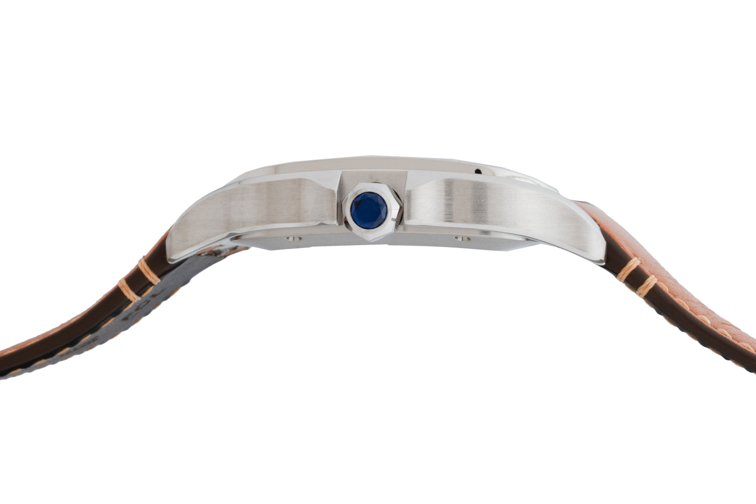 This particular example is one of Cartier’s most modern— sized at 40mm in stainless steel with a softly rounded case. This piece includes all the classic defining hallmarks of the Santos with exposed screws carrying from the bezel down the bracelet. A Roman numeral dial, blued steel hands and blue synthetic spinel that tie the Santos to the other Cartier collections.
