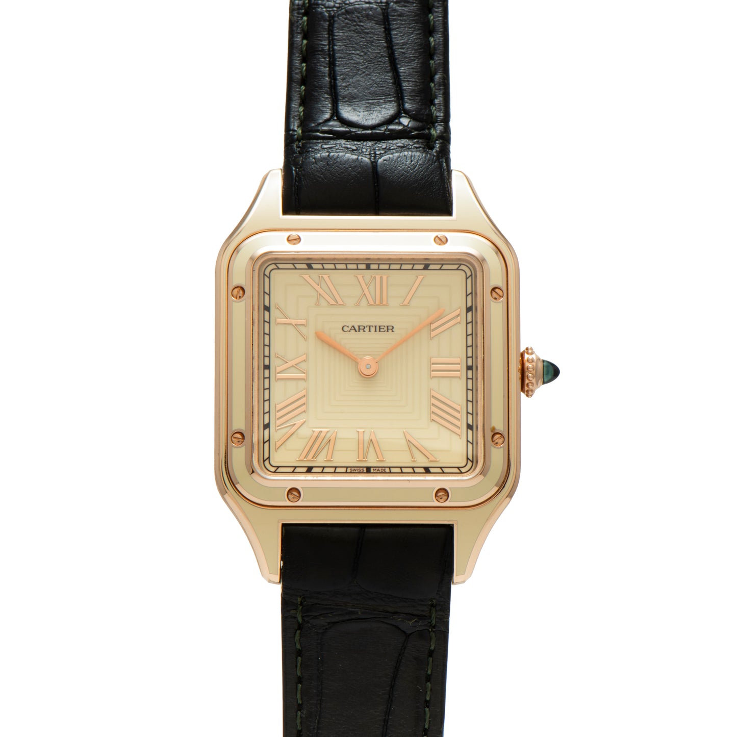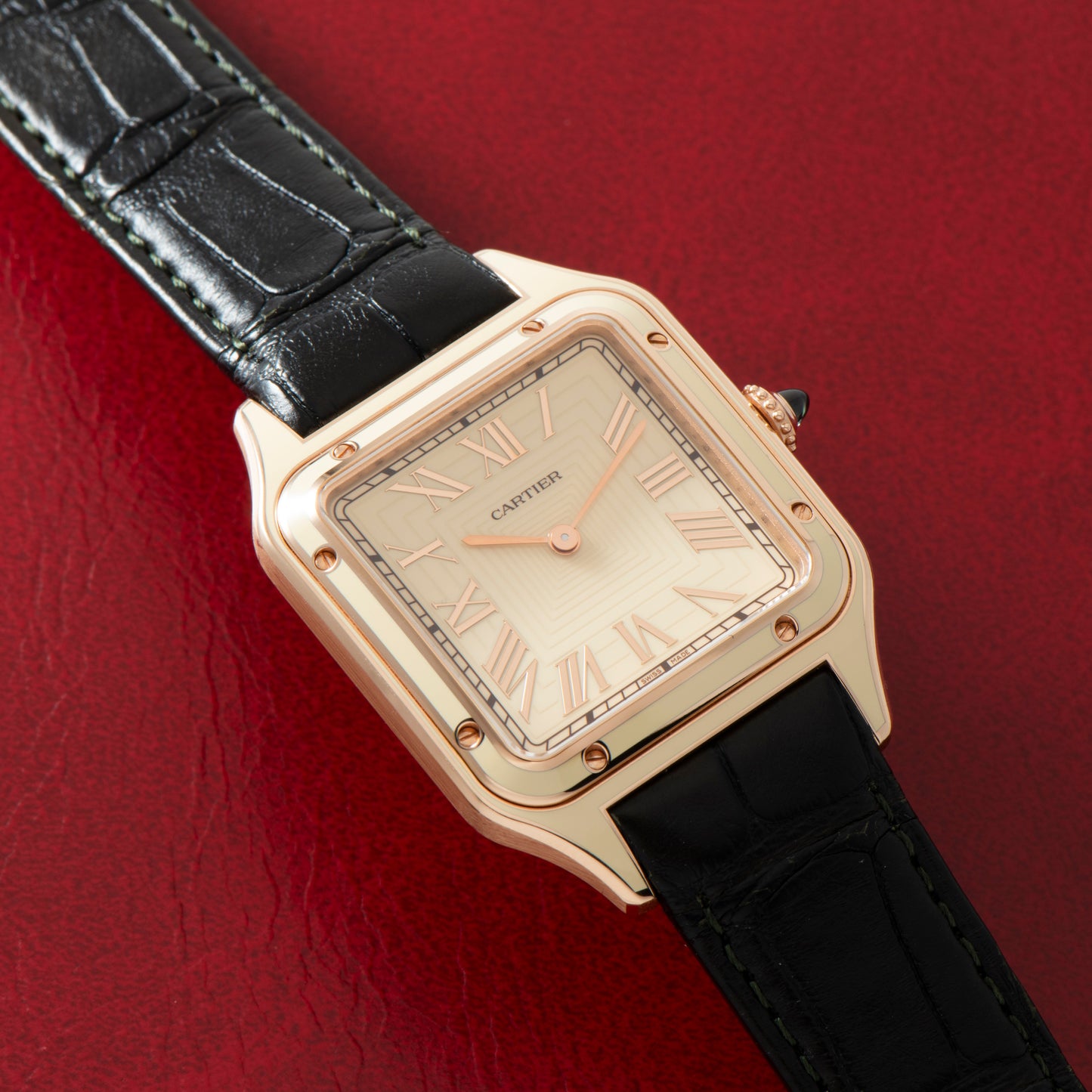 Powered by the hand-wound Cartier Calibre 430 MC movement, this handsome pieces comes paired to a signed black Cartier alligator leather strap with an 18K rose gold ardillon buckle. Accompanied by its inner and outer boxes and its unsigned warranty card, it's a beautiful, highly limited modern take on an important wristwatch model from the early 20th century.