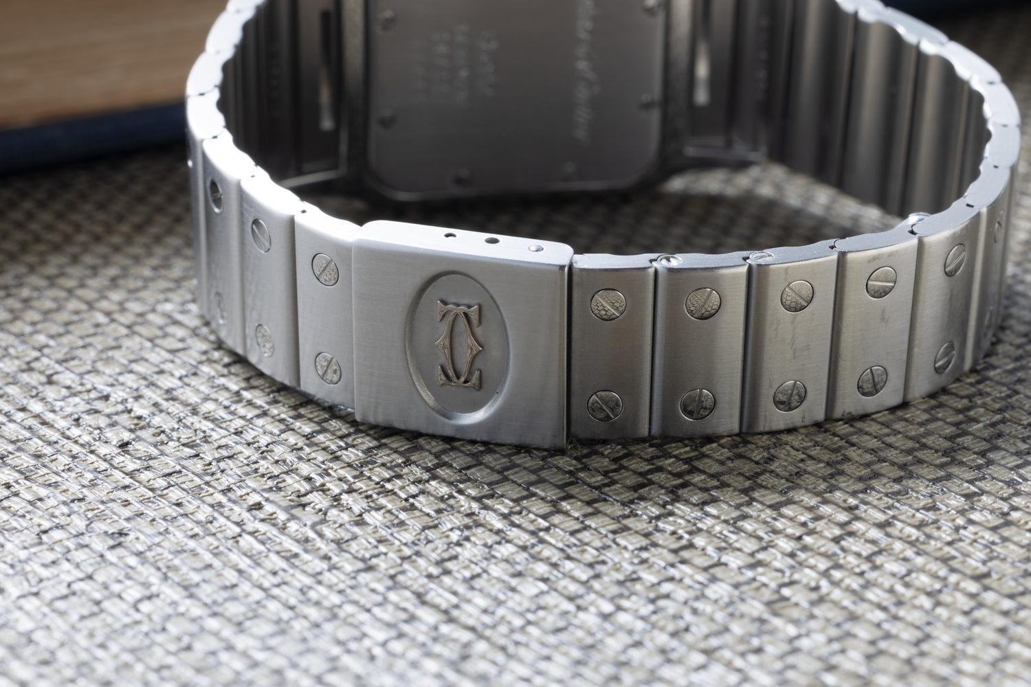 This particular Santos, dating to the 1990s, features a 30mm stainless steel case with an excellent matching bracelet, a sapphire crystal, a sapphire cabochon crown, and a beige dial with printed blue ‘Roman’ indices and a matching blued steel sword handset.