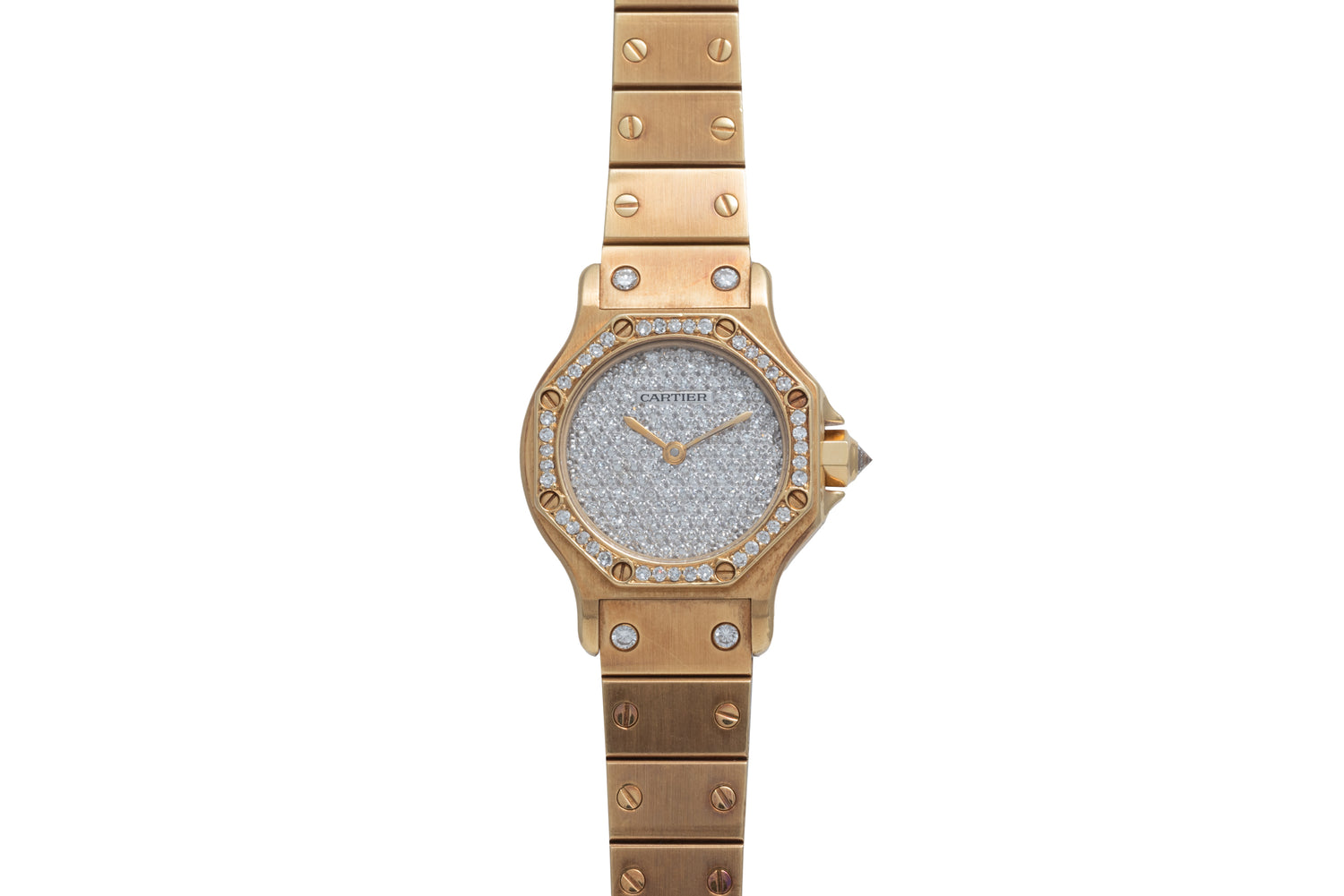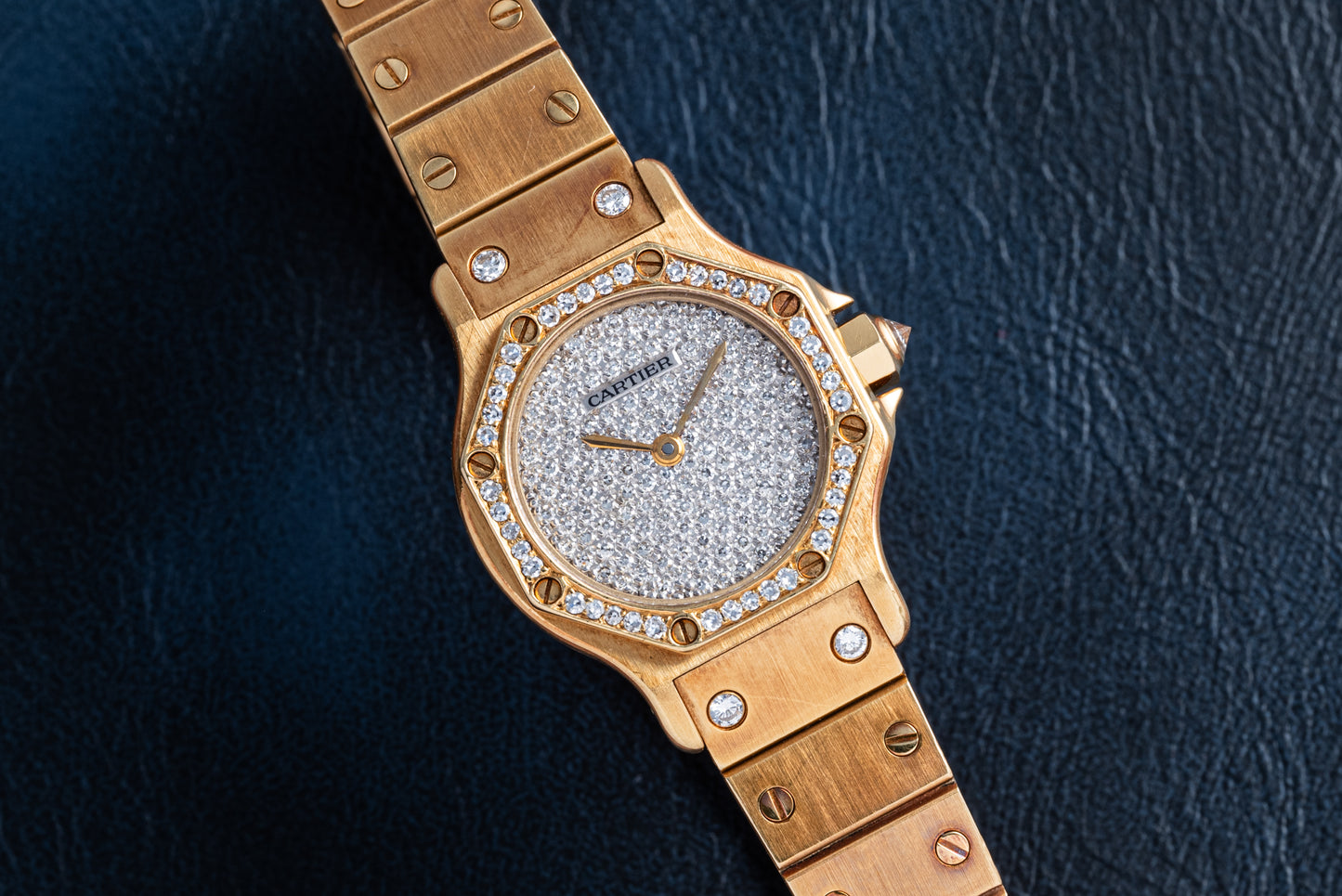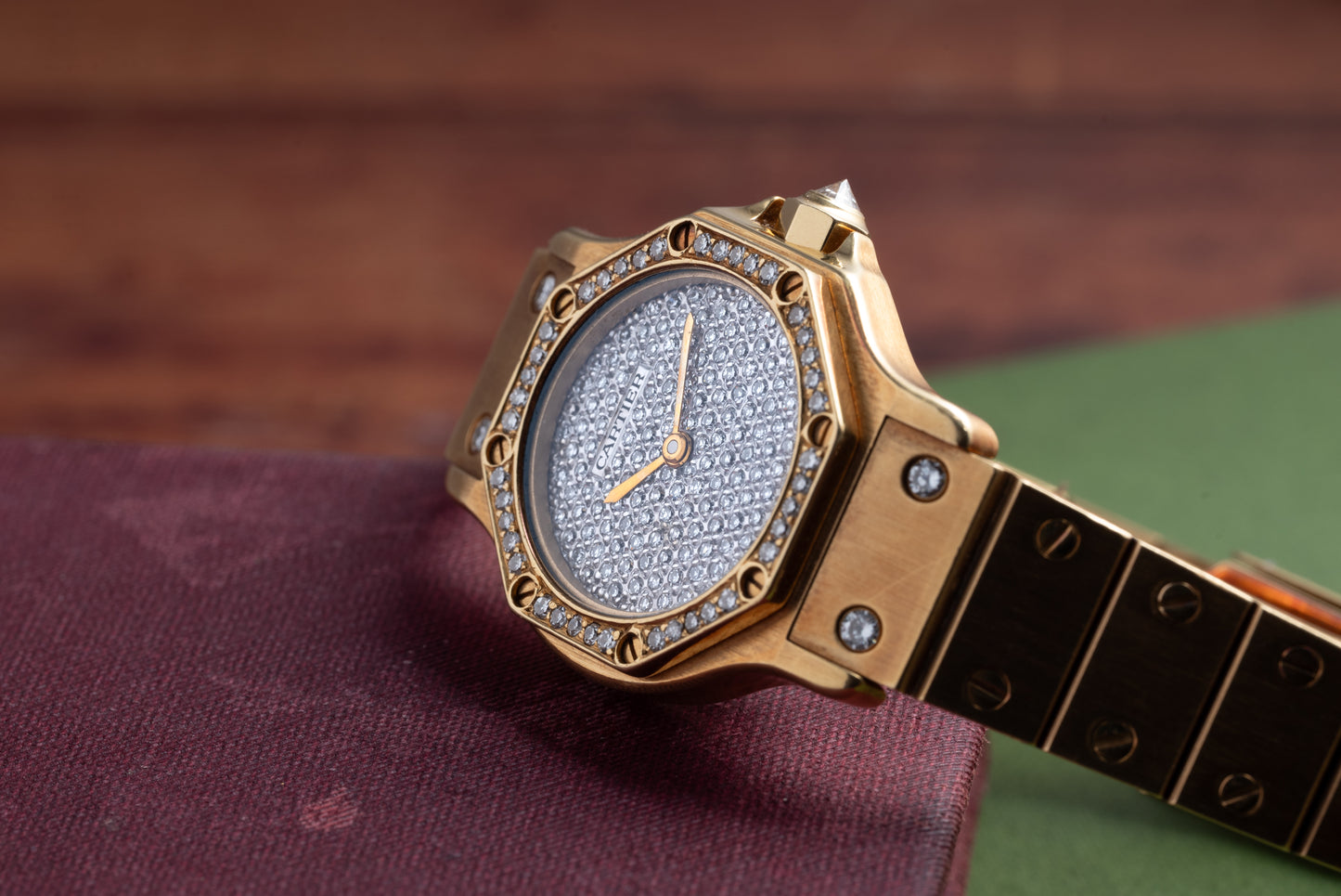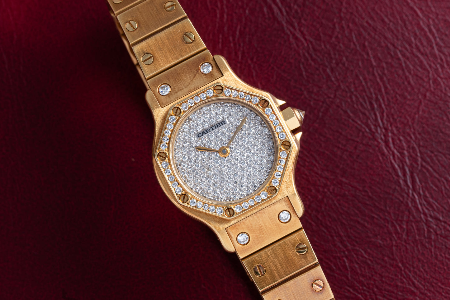 This particular Cartier is a Ronde Automatic dating to the 1990s. Housed in a 24mm yellow gold case, it features a sapphire crystal, sapphire cabochon crown, a glittering diamond-set bezel with visible screws, a stunning diamond-set dial with a matching yellow gold 'sword' handset, and an integrated yellow gold rivet bracelet.
