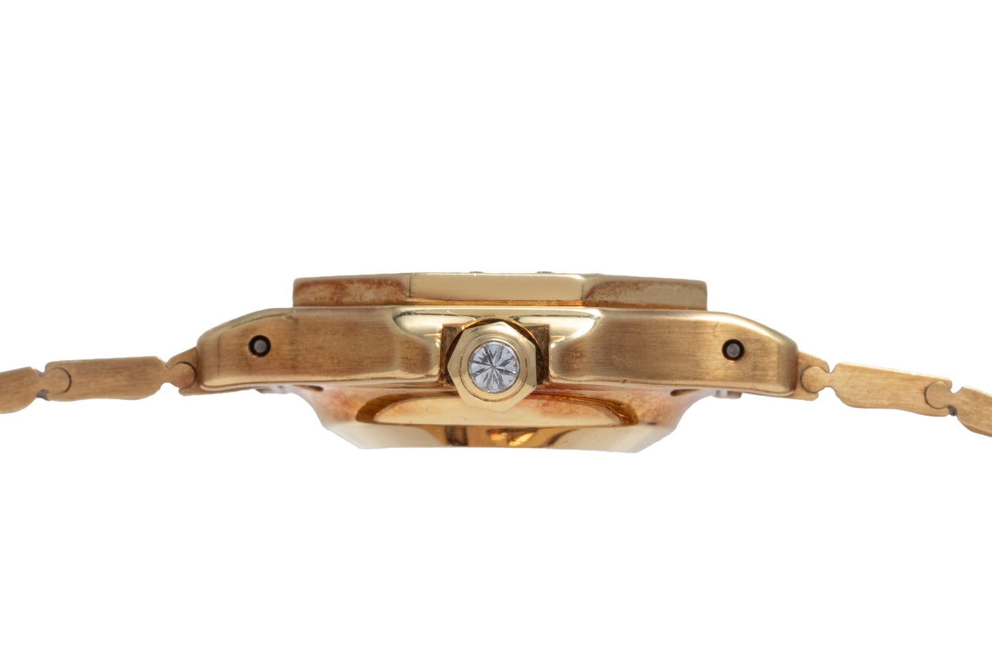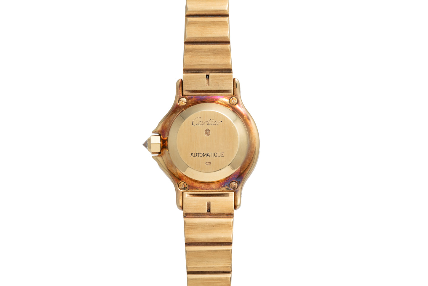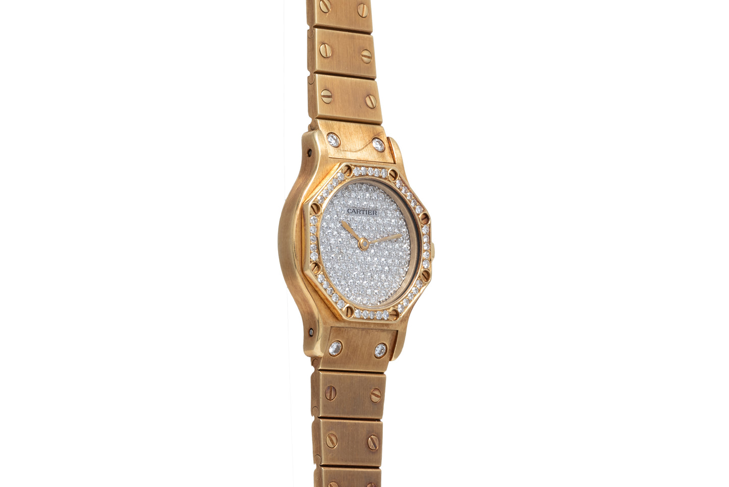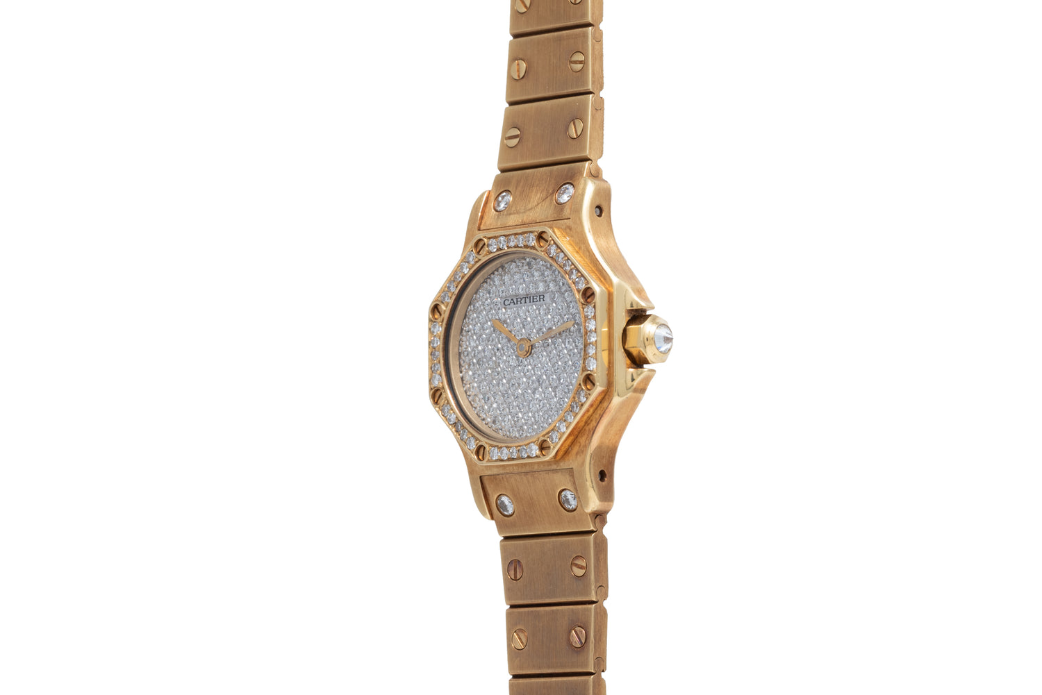 This particular Cartier is a Ronde Automatic dating to the 1990s. Housed in a 24mm yellow gold case, it features a sapphire crystal, sapphire cabochon crown, a glittering diamond-set bezel with visible screws, a stunning diamond-set dial with a matching yellow gold 'sword' handset, and an integrated yellow gold rivet bracelet.