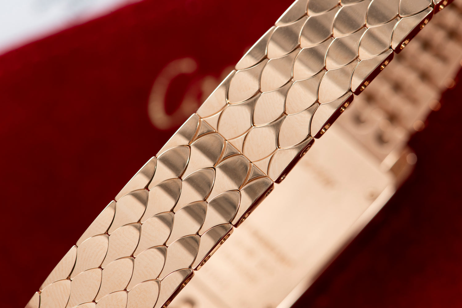 Powered by a quartz movement, this piece comes fitted to a gorgeous solid rose gold 'scales' bracelet with a signed hidden deployant clasp.