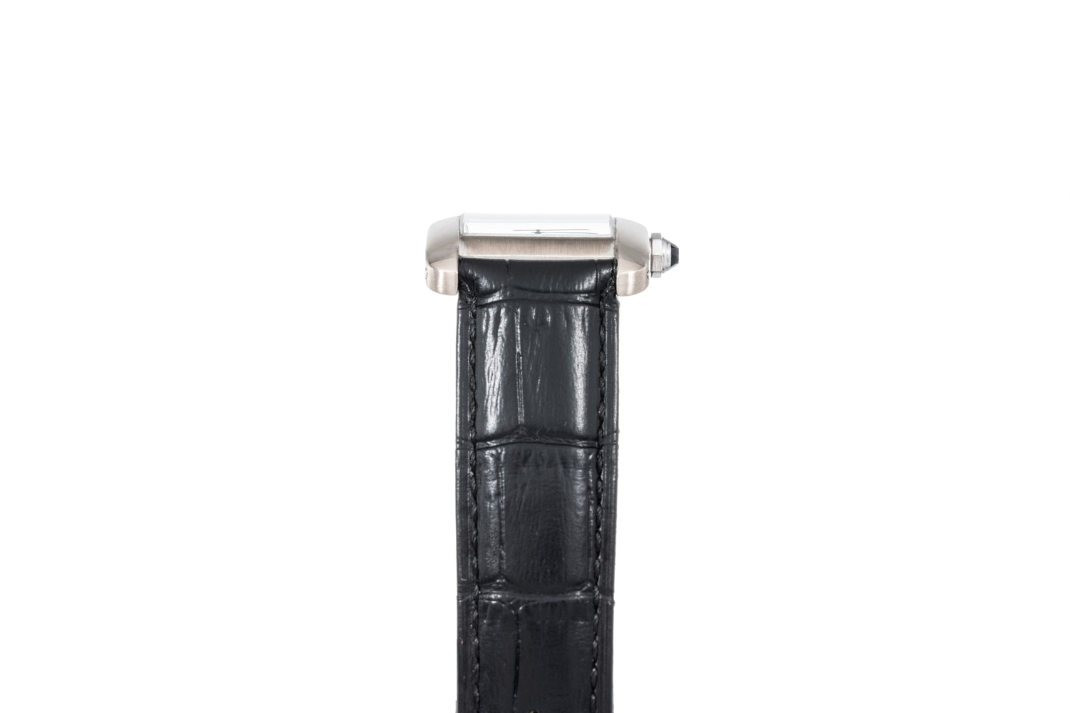 This particular example, a Reference 1741, features an 18k white gold case with a curved sapphire crystal, a white guilloche dial with printed Roman indices and a matching blued-steel sword handset, a date window at 6 o’clock, and Cartier's ubiquitous sapphire cabochon winding crown to operate the in-house Calibre 120 automatic-winding movement within. Fitted to a black leather strap with a signed 18K white gold Ardillon pin buckle, this piece is suitable for virtually any wrist.