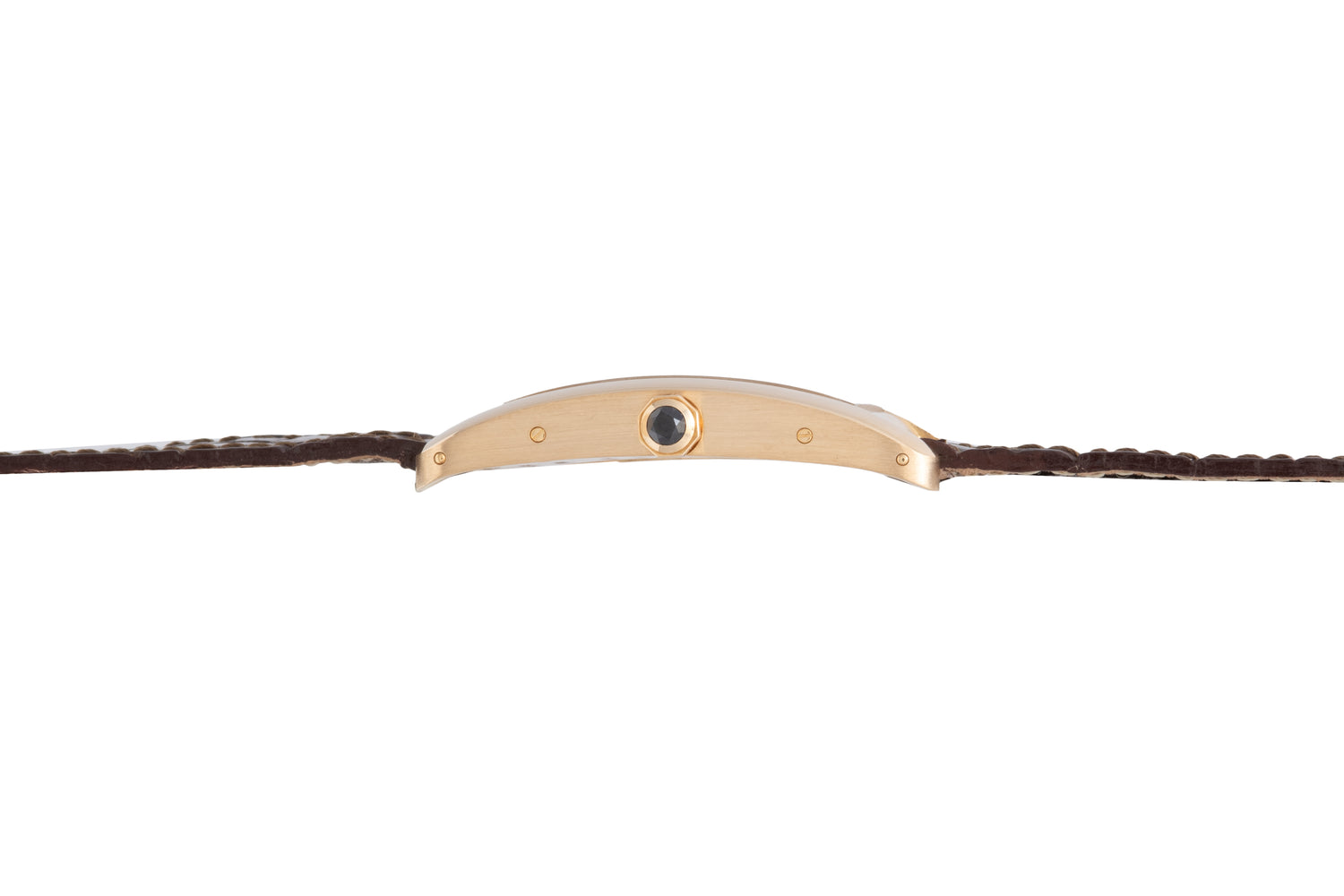 This particular example, a Reference 1735BB, is a special, limited piece from the CPCP line of the early 2000s. It features a 26mm x 45mm solid 18k yellow gold case with a curved sapphire crystal, a silver guilloche dial with printed Roman indices and a matching blued-steel 'sword' handset, and Cartier's ubiquitous sapphire cabochon crown.