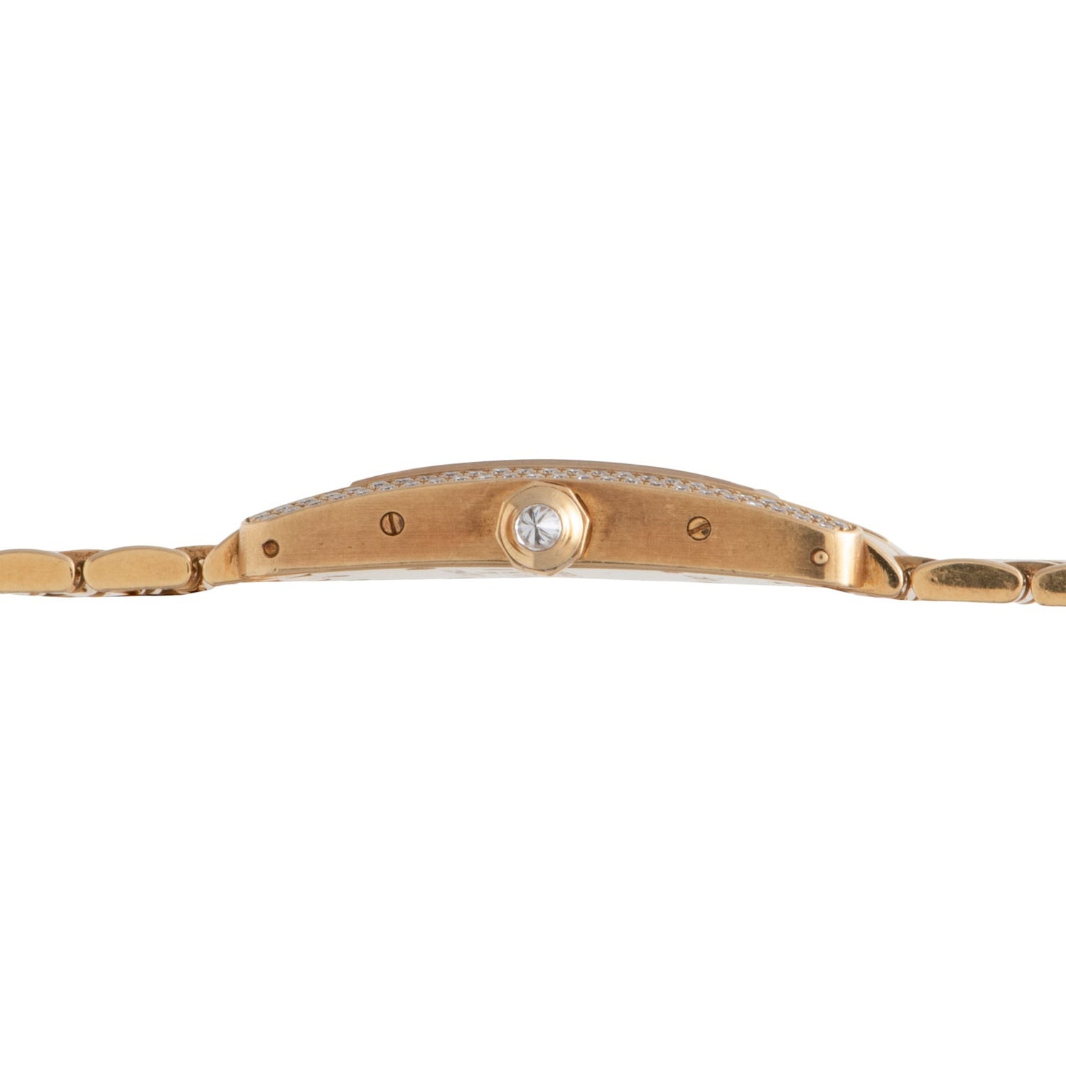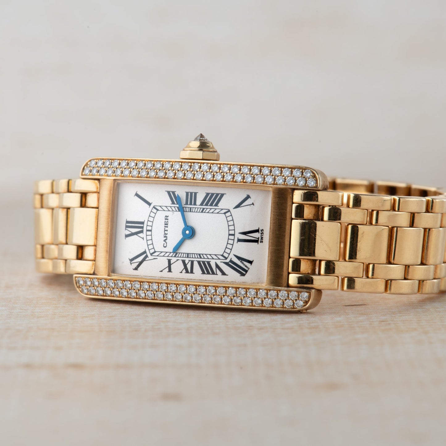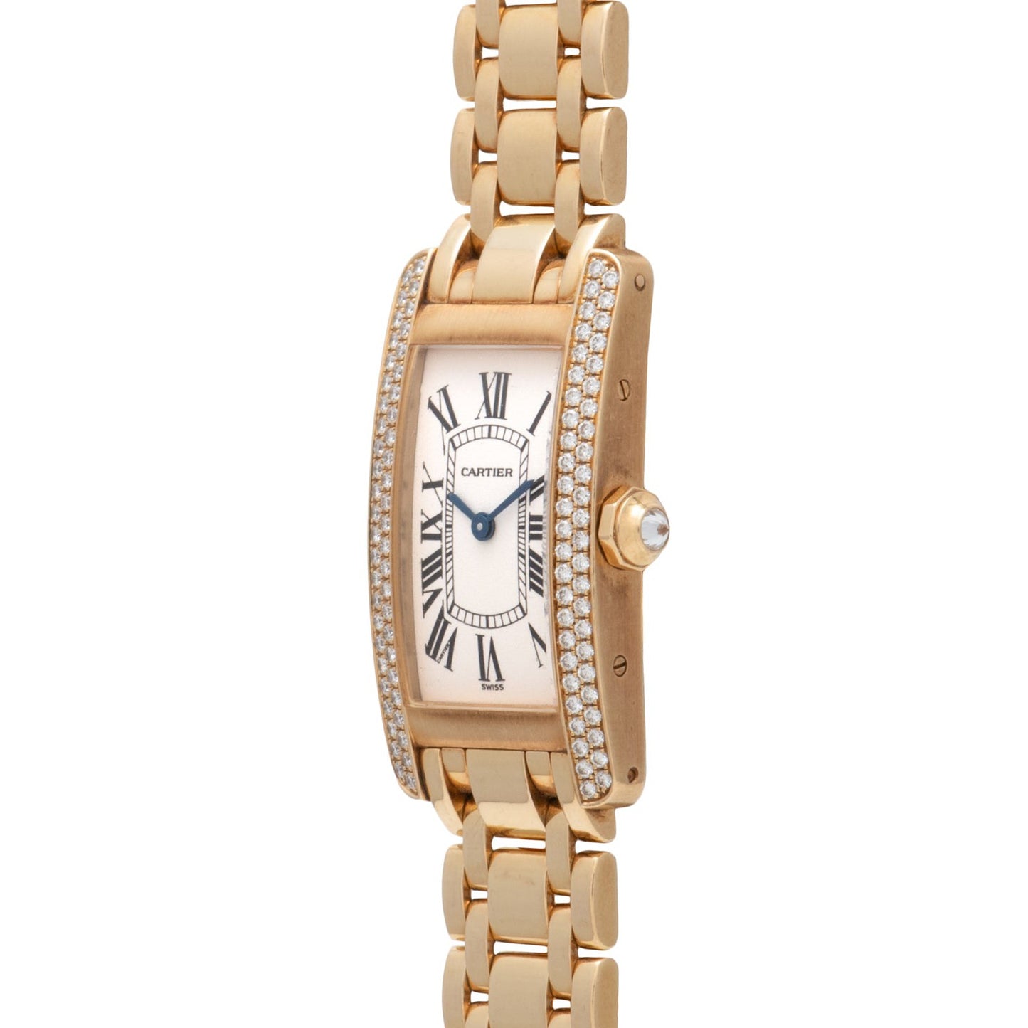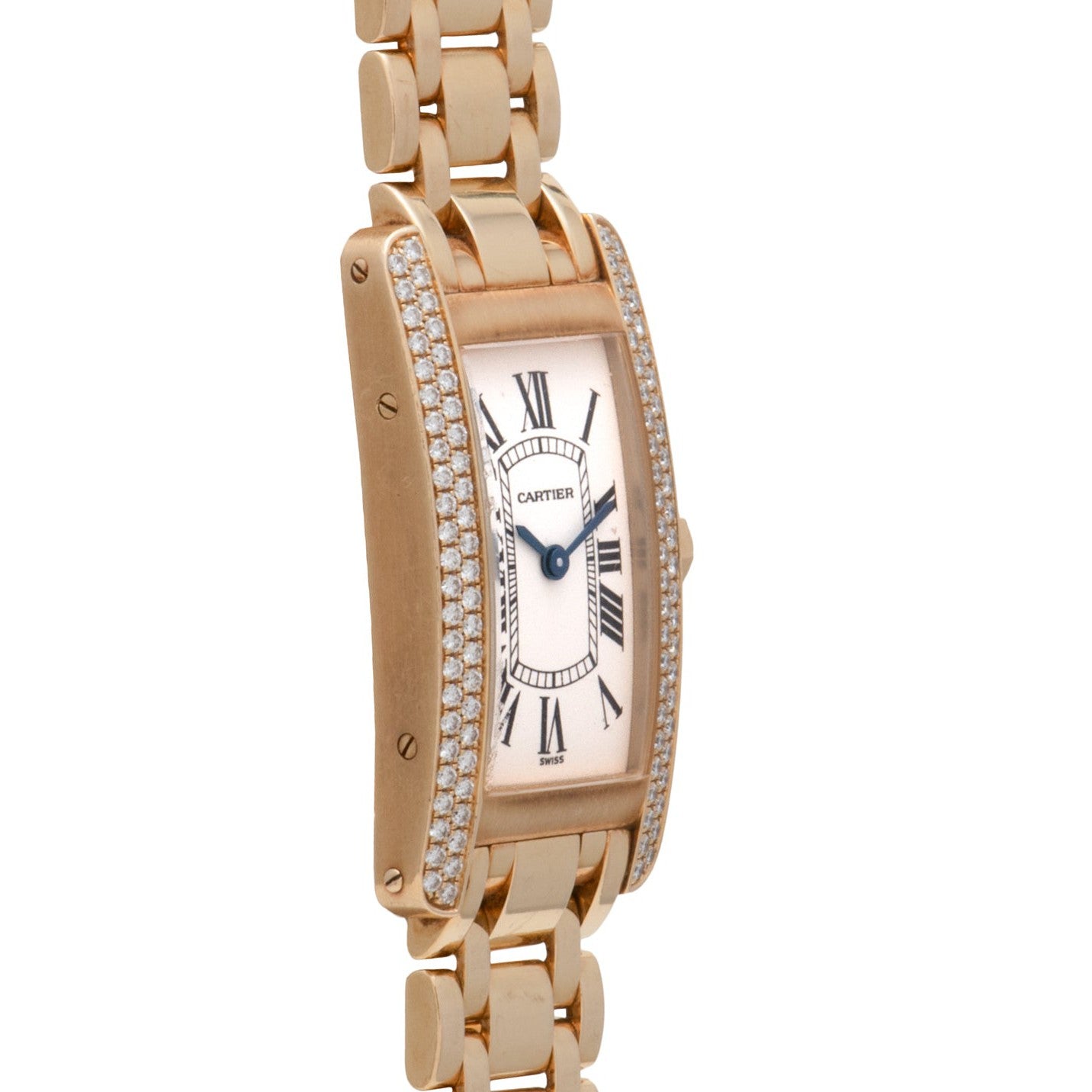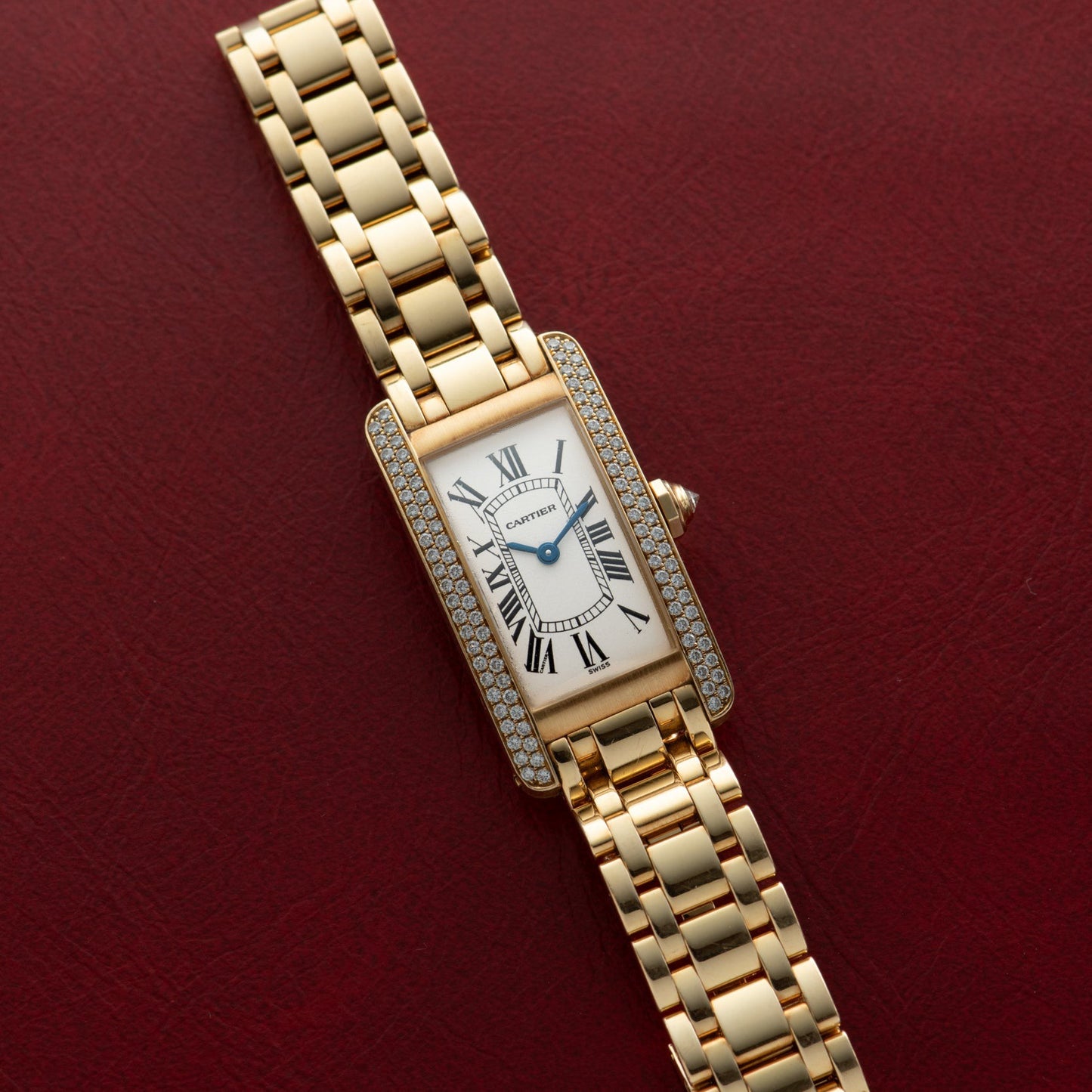This particular Americaine, a Reference 1710, is powered by a quartz movement and features a sapphire crystal, as well as a diamond octagonal cabochon crown. Executed in 18K yellow gold, this watch is probably the classiest layout for an Americaine with a cream white dial. That said, this piece is further elevated by its twin rows of diamonds on the bezel left and right brancards of the case, while the center case brancards are brushed for some subtle, tasteful contrast. That said, this piece is especially beautiful with its matching 18K yellow gold multi-link bracelet.