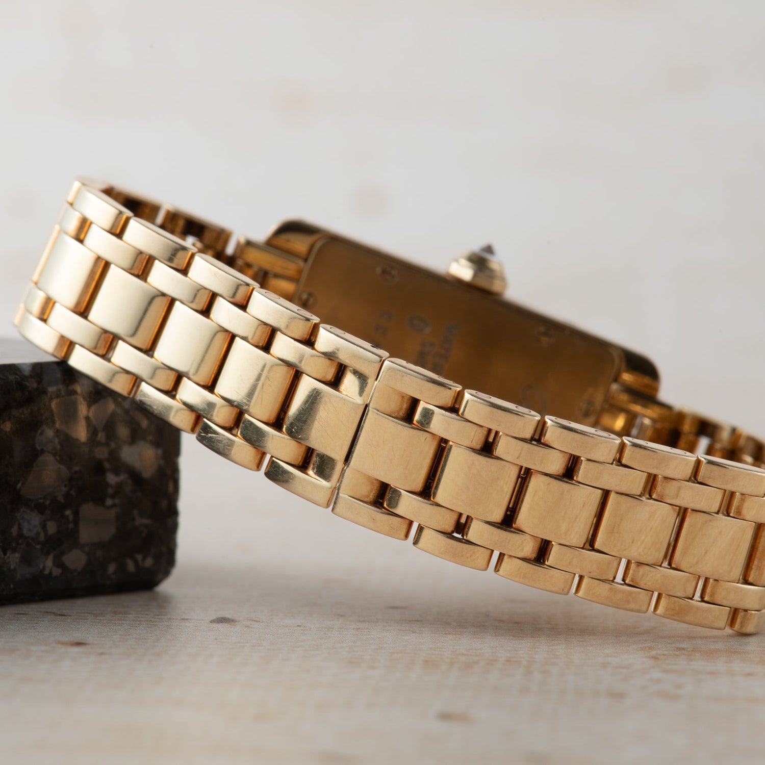 The Tank Louis was introduced in 1922, followed close on the heels of the Asian-influenced Tank Chinoise. The Chinoise, released amidst a mania for jewelry inspired by the Orient, has a square rather than rectangular case and lugs that resemble the portico of a Chinese pagoda.