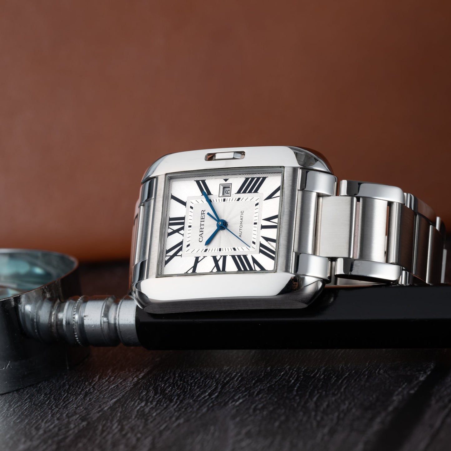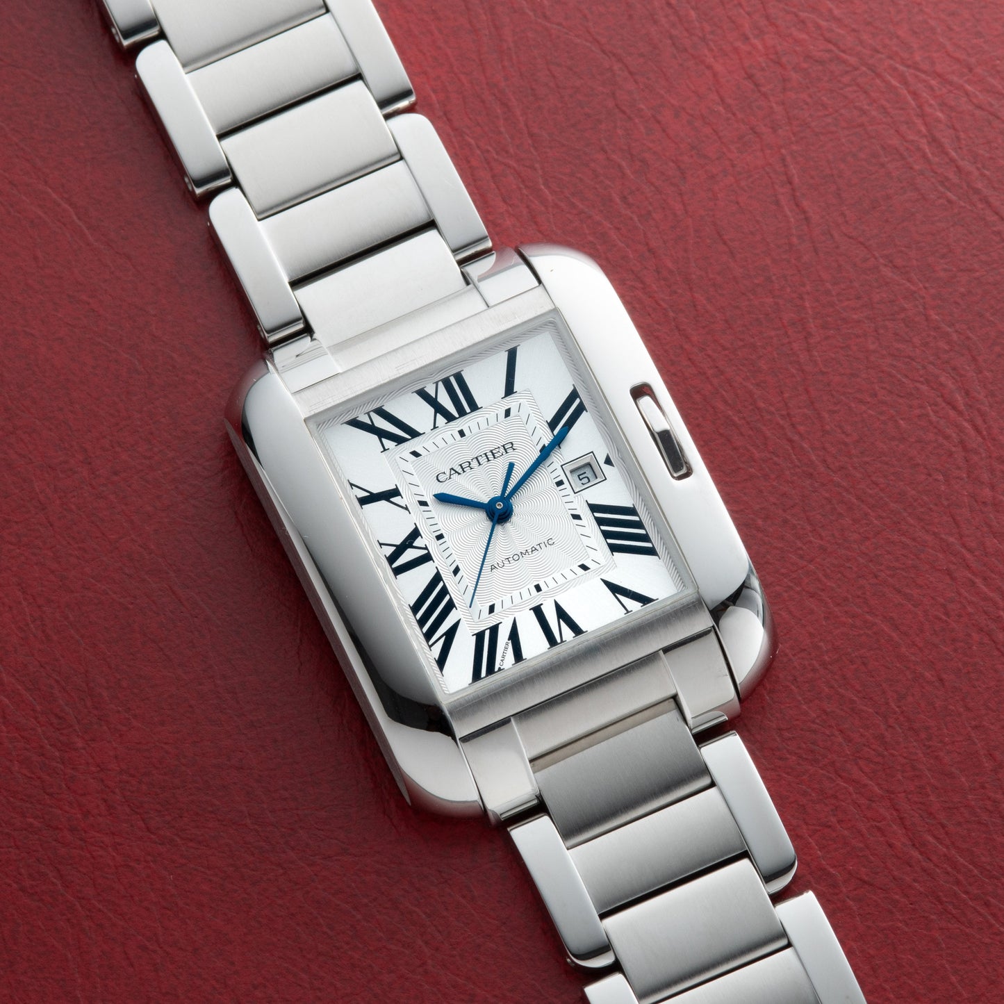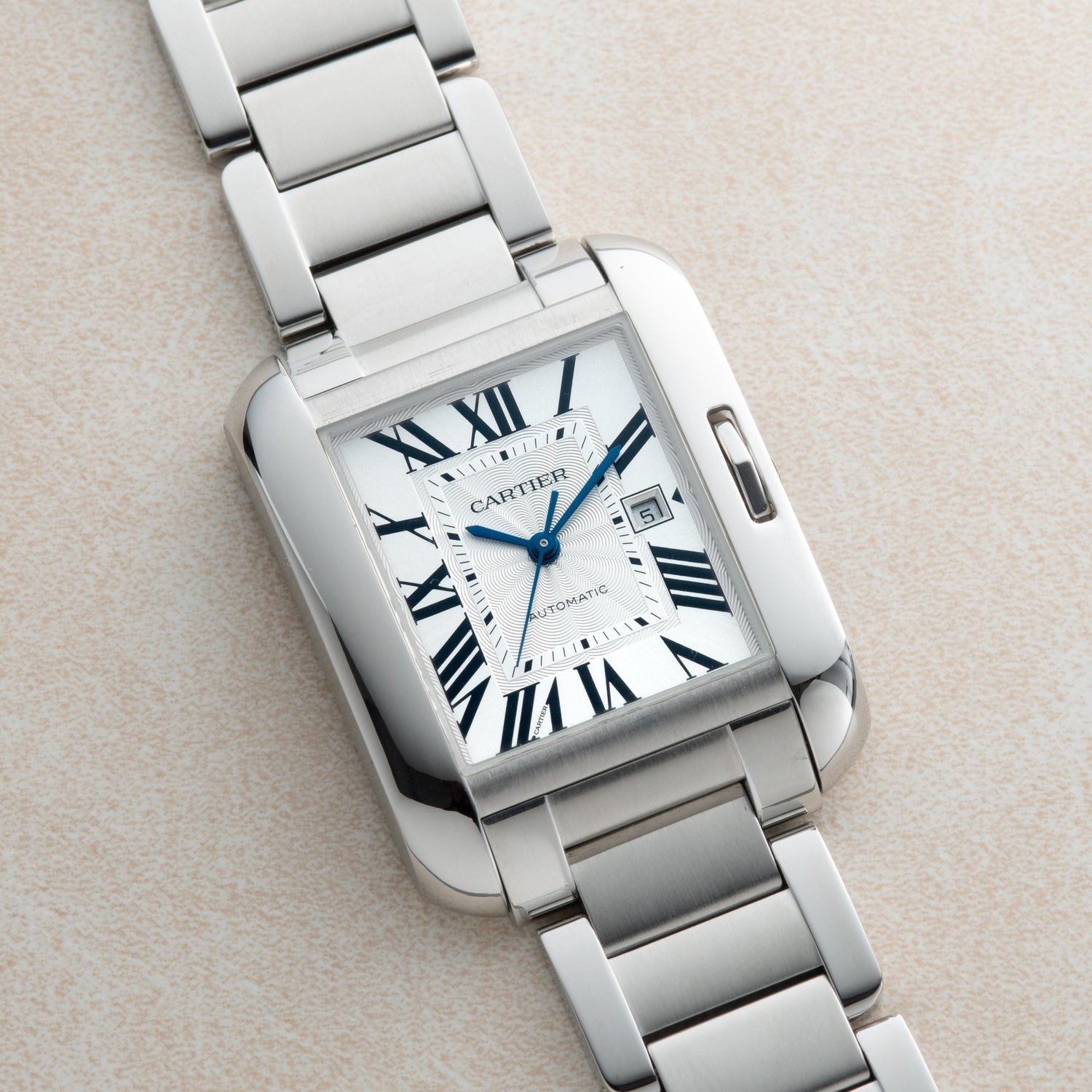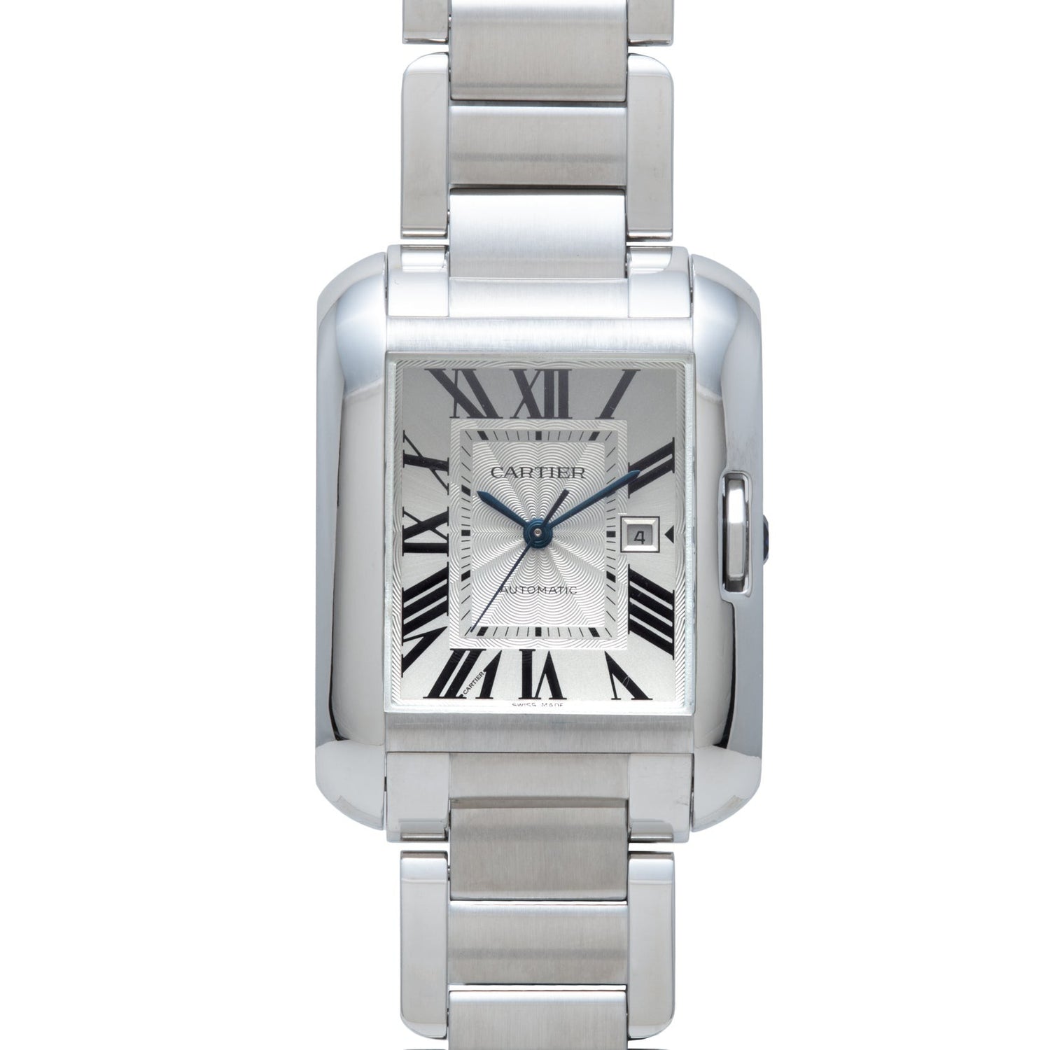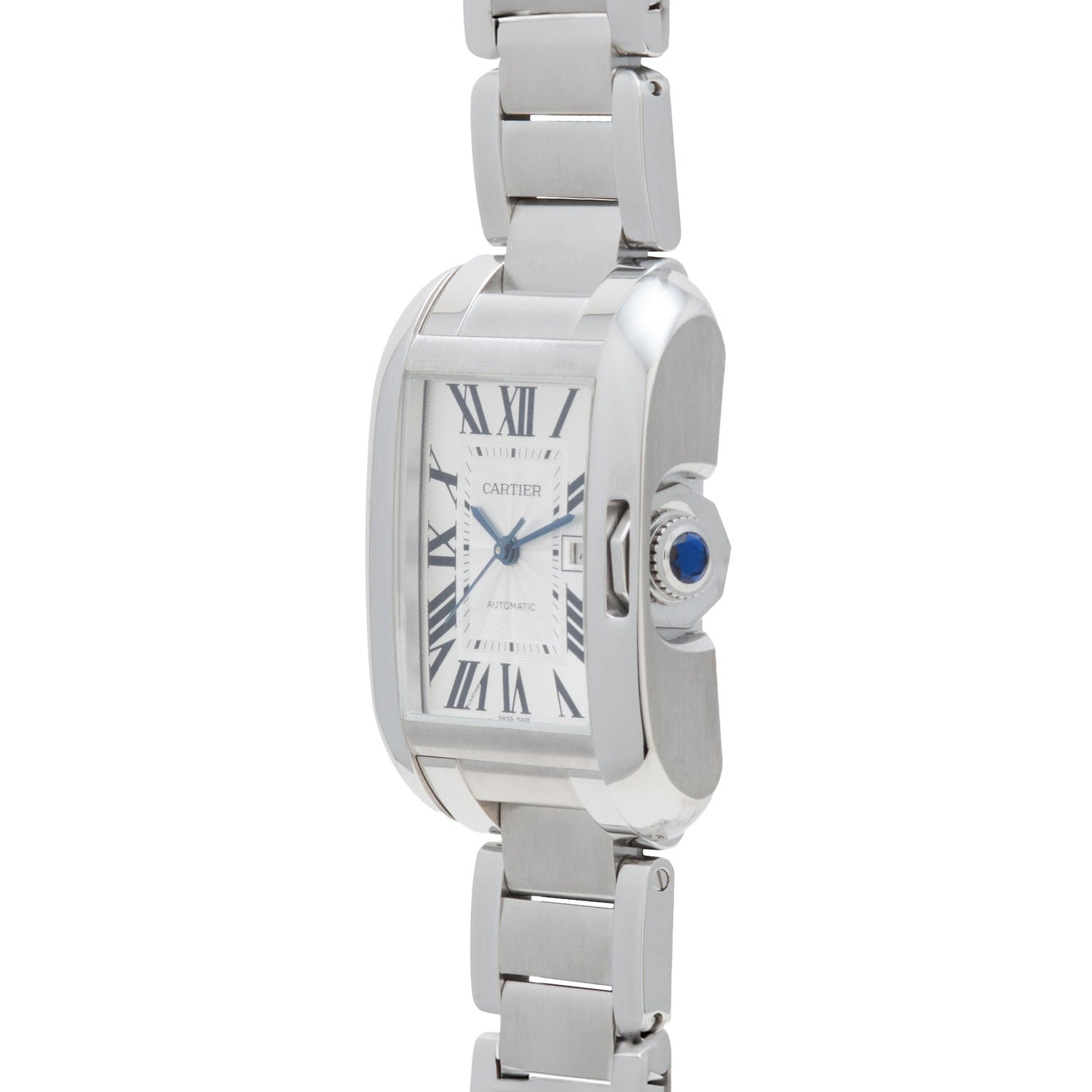 The particular Tank we have here, an Anglaise, was part of a line introduced in 2012. With its curvilinear case and enclosed, table-cut stone crown, the Anglaise is a subtle tweak on a classic model that stands out from the crowd for its considered design. Housed in a stainless steel case with a sapphire crystal and polished stainless steel crown and crown protector, it features a silver guilloché, non-luminous dial with painted, black Roman indices — the classic configuration!