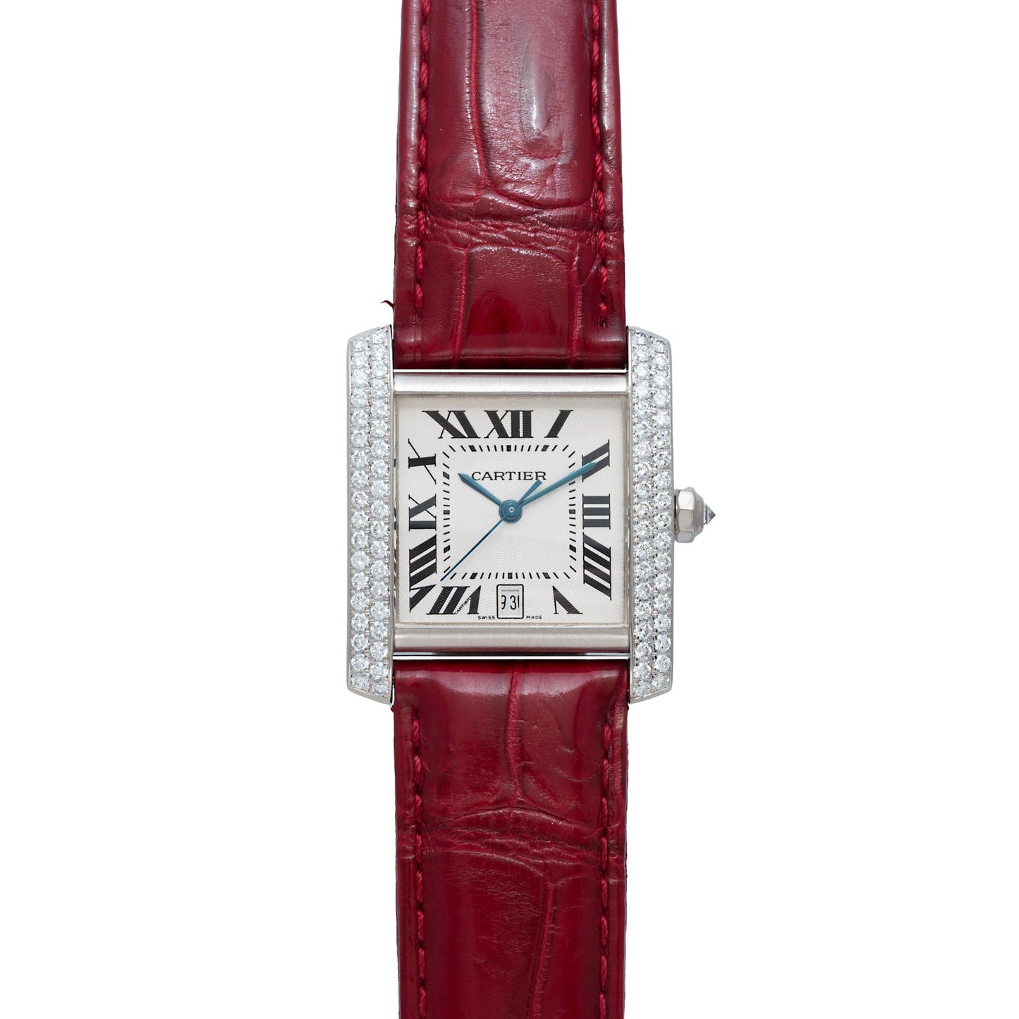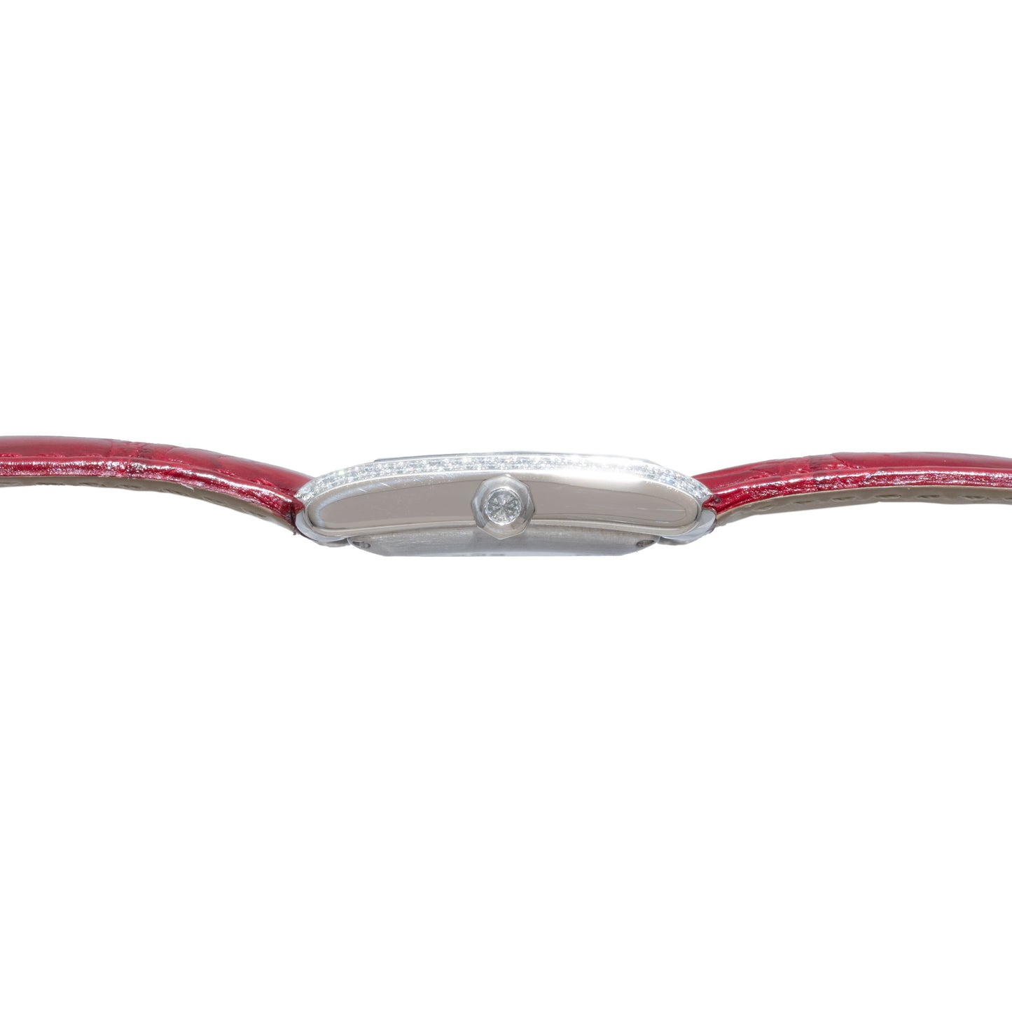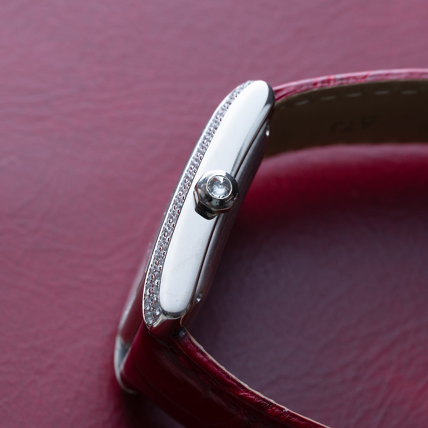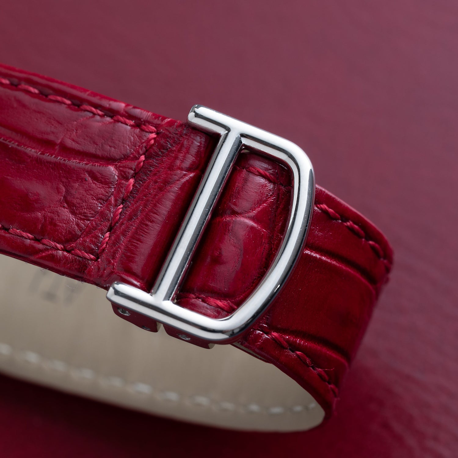 This particular example, executed in 18K white gold, features an elegant 32mm x 28mm case profile with diamond-set brancards, a sapphire crystal, Cartier's signature cabochon crown — in this case a diamond, a beautiful off-white guilloché dial with printed Roman indices and matching blued-steel 'sword' handset, and a reliable automatic-winding movement within. This classic ladies piece is set on a red alligator strap and paired with a white gold deployant buckle.