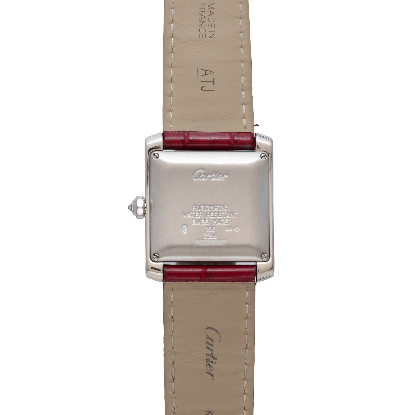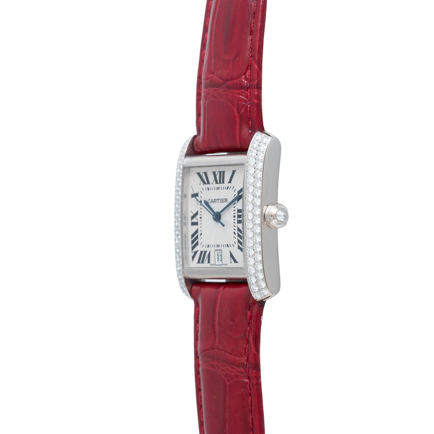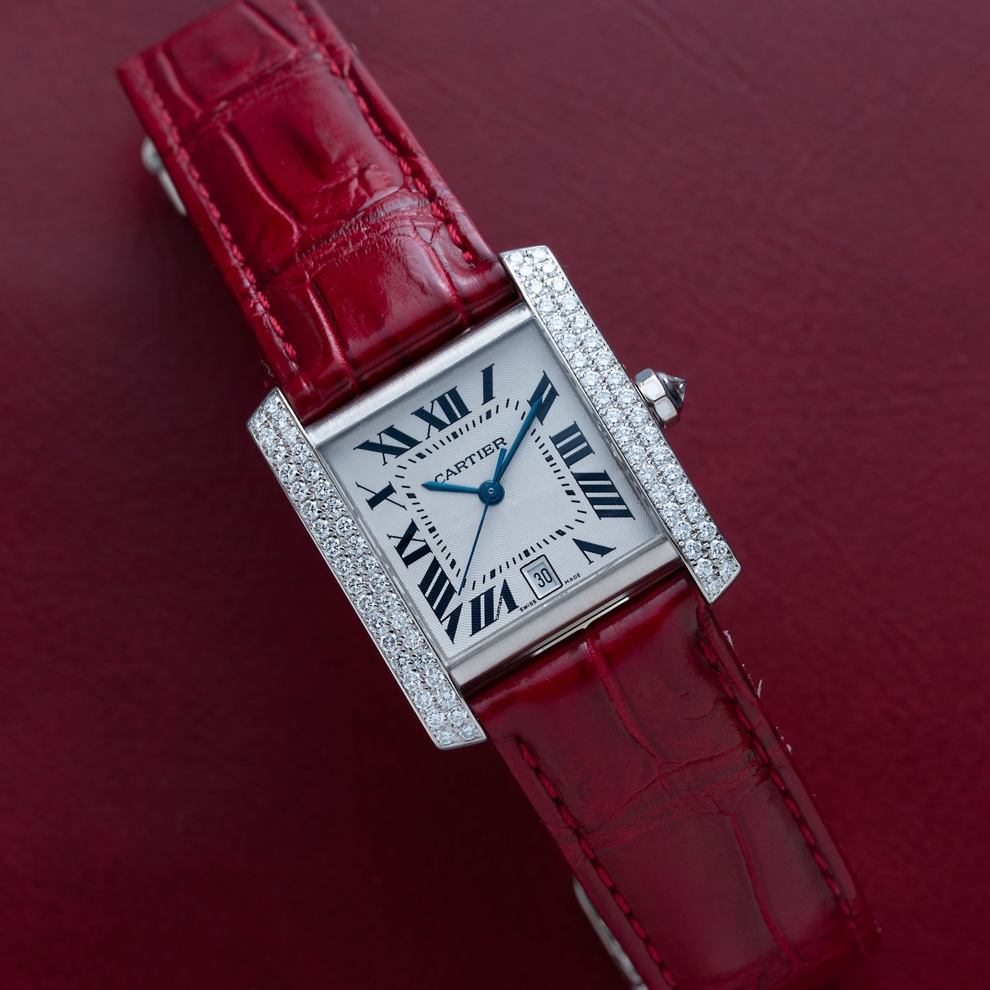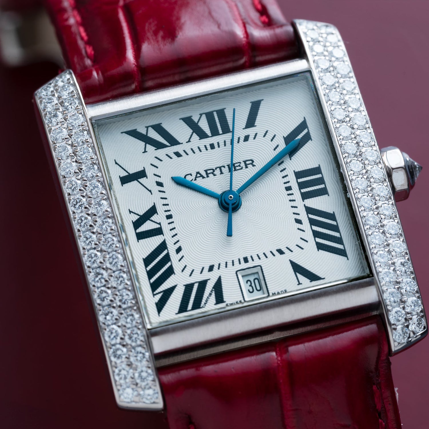 This particular example, executed in 18K white gold, features an elegant 32mm x 28mm case profile with diamond-set brancards, a sapphire crystal, Cartier's signature cabochon crown — in this case a diamond, a beautiful off-white guilloché dial with printed Roman indices and matching blued-steel 'sword' handset, and a reliable automatic-winding movement within. This classic ladies piece is set on a red alligator strap and paired with a white gold deployant buckle.