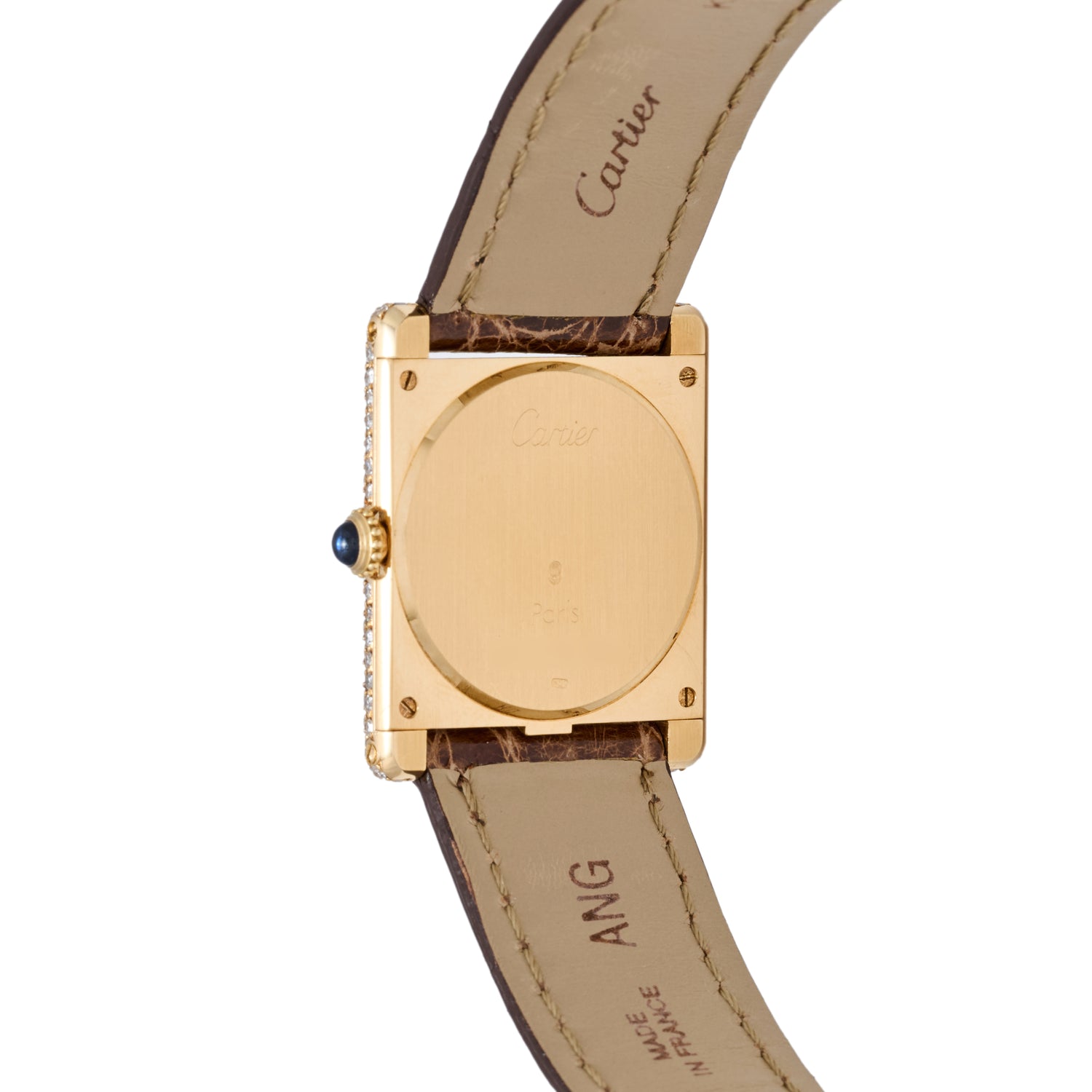 This particular Tank Louis, a Reference 96036, dates to the 1980s and features a sumptuous 24mm x 31mm 18K yellow gold case with a sapphire crystal, a sapphire cabochon winding crown, a diamond-set bezel, and a spectacular gold multi-tone dial with diamond-set indices and a gold 'sword' handset. Powered by a hand-wound movement, it comes fitted to a Cartier-signed brown leather strap with a signed yellow gold deployant clasp.