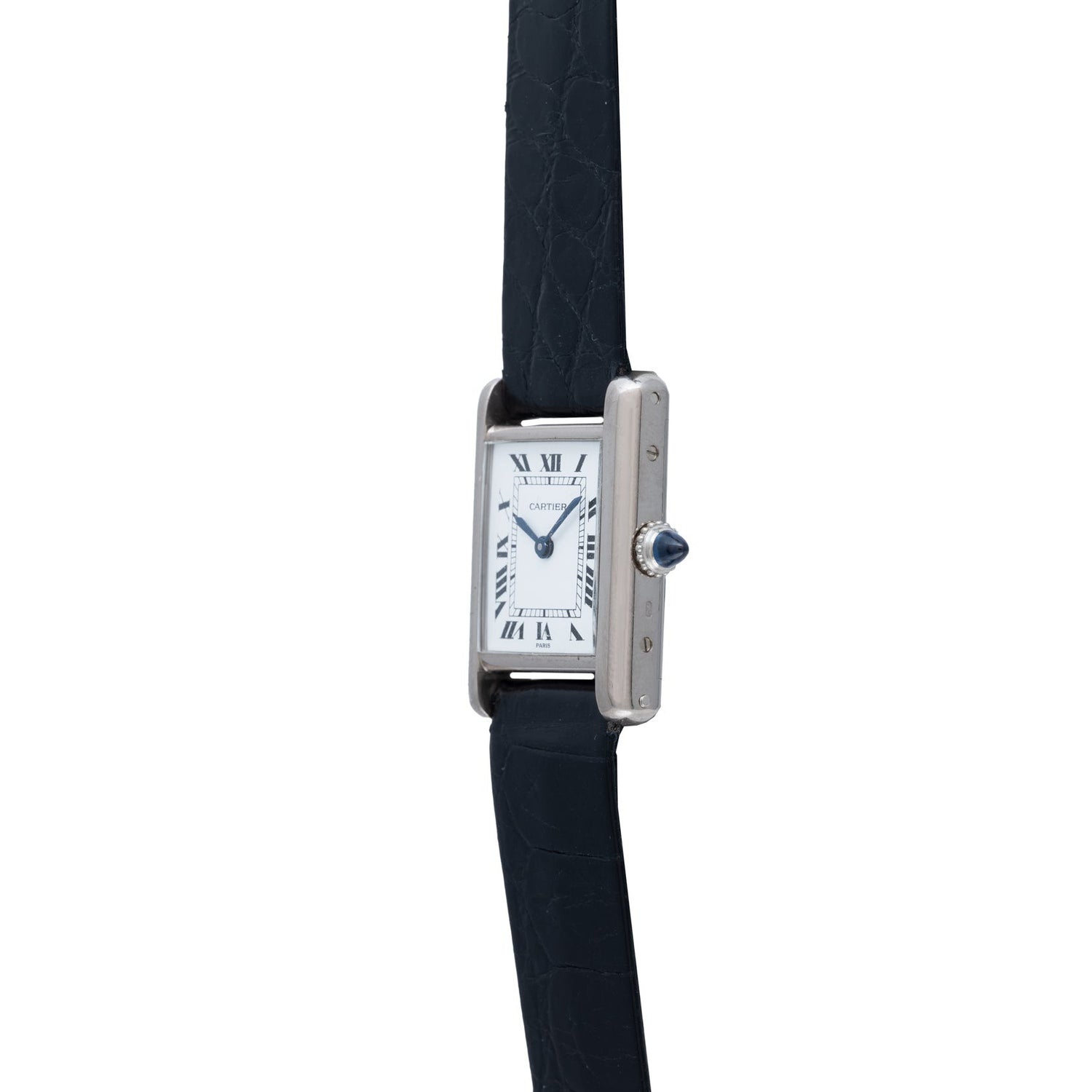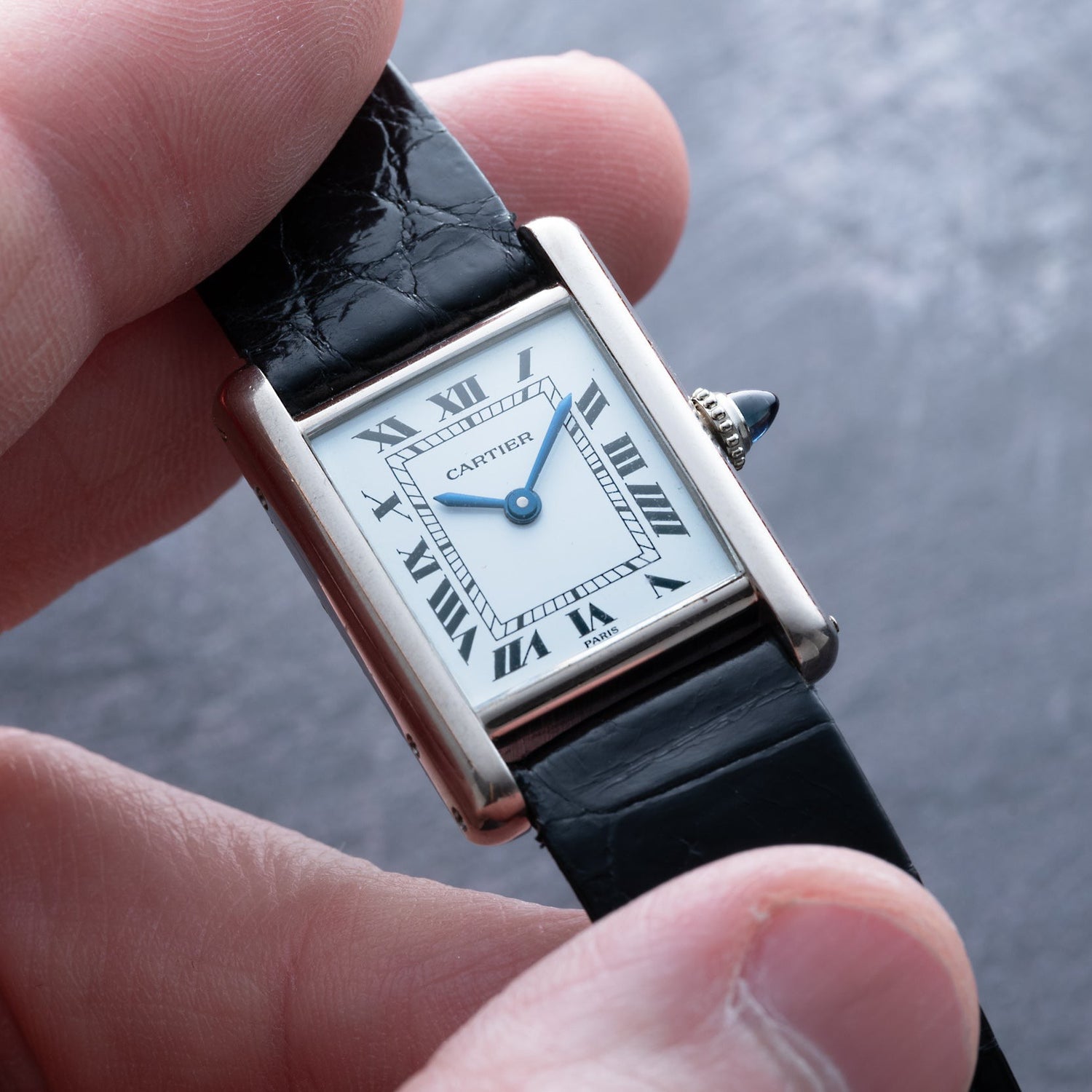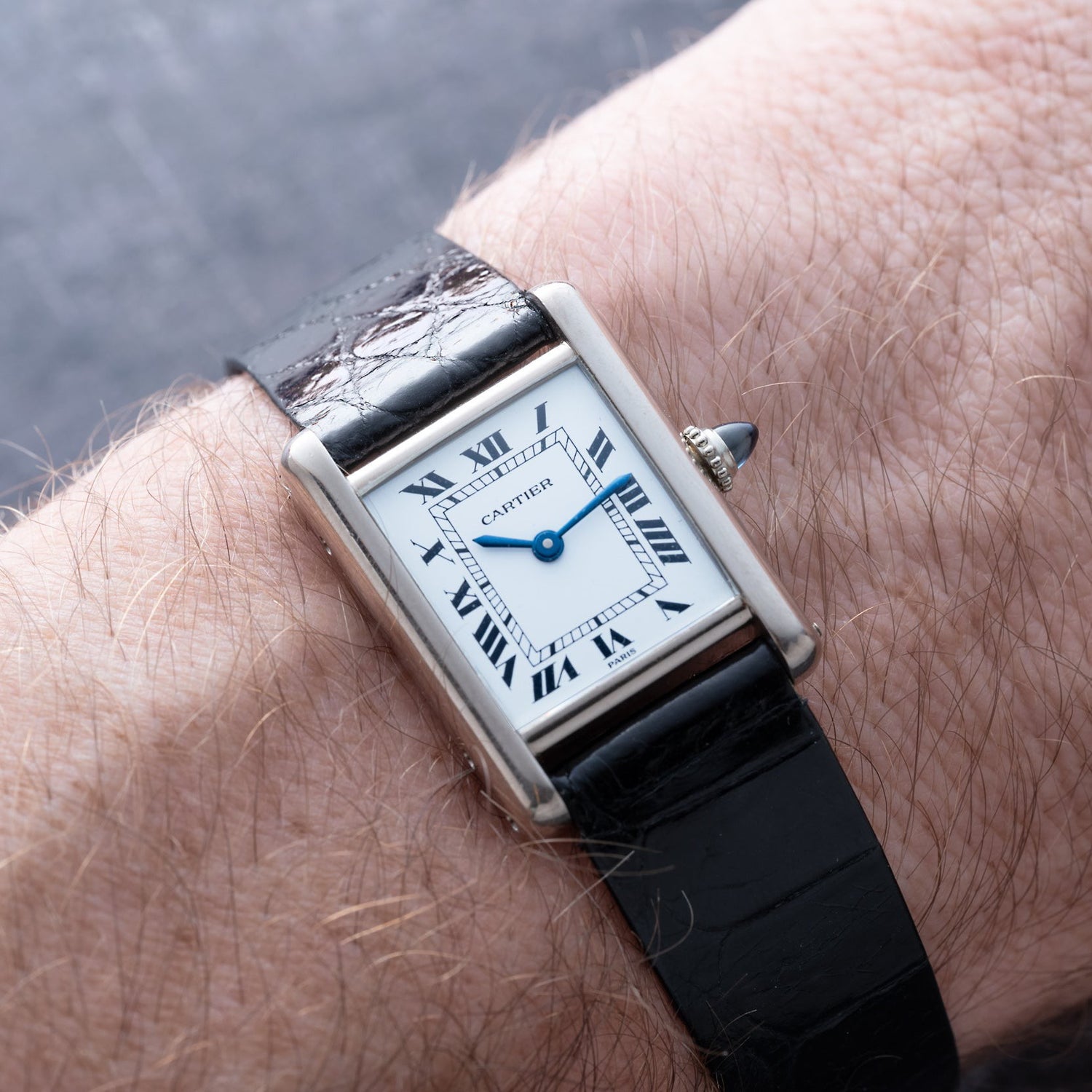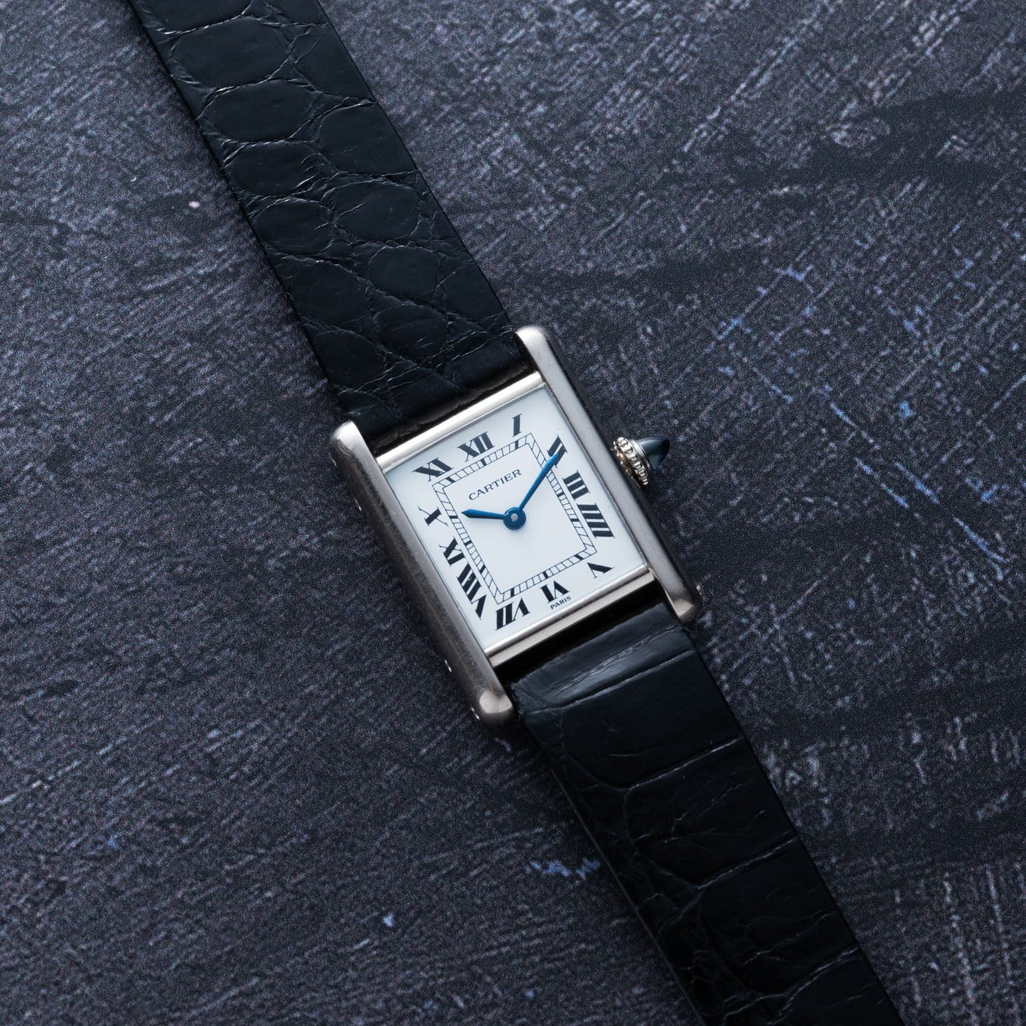 This particular Tank Louis dates to the latter half of the 20th century and features an extremely uncommon white metal case with a mineral crystal, a sapphire cabochon winding crown, and a white dial with printed 'Roman' indices and a matching, blued-steel 'sword' handset. Powered by a manually-wound movement, it comes fitted to an alligator leather strap.