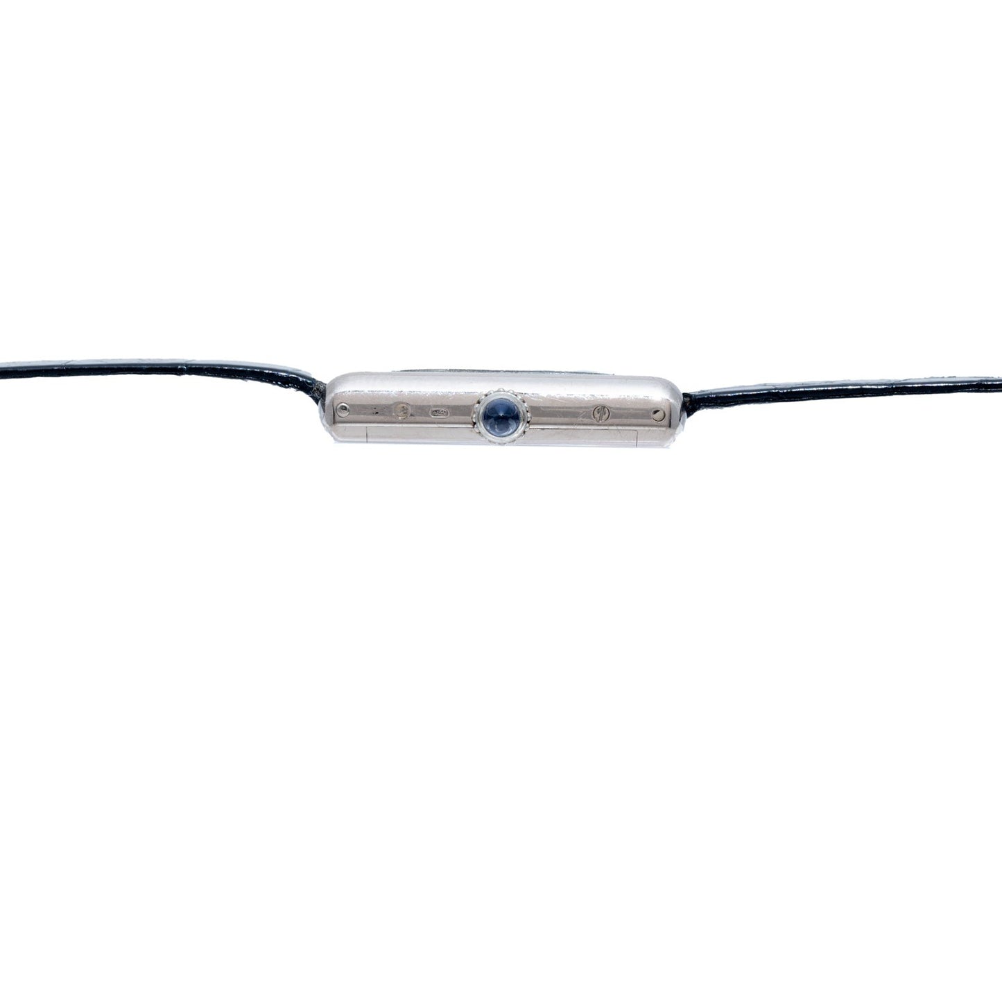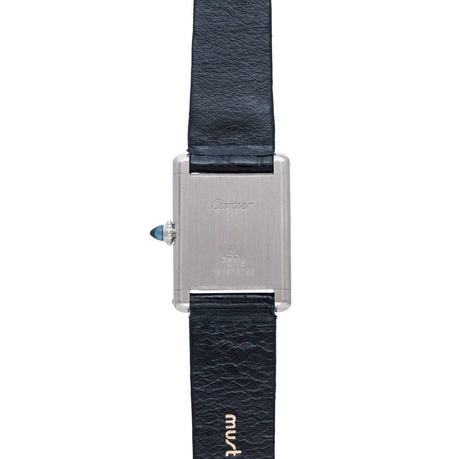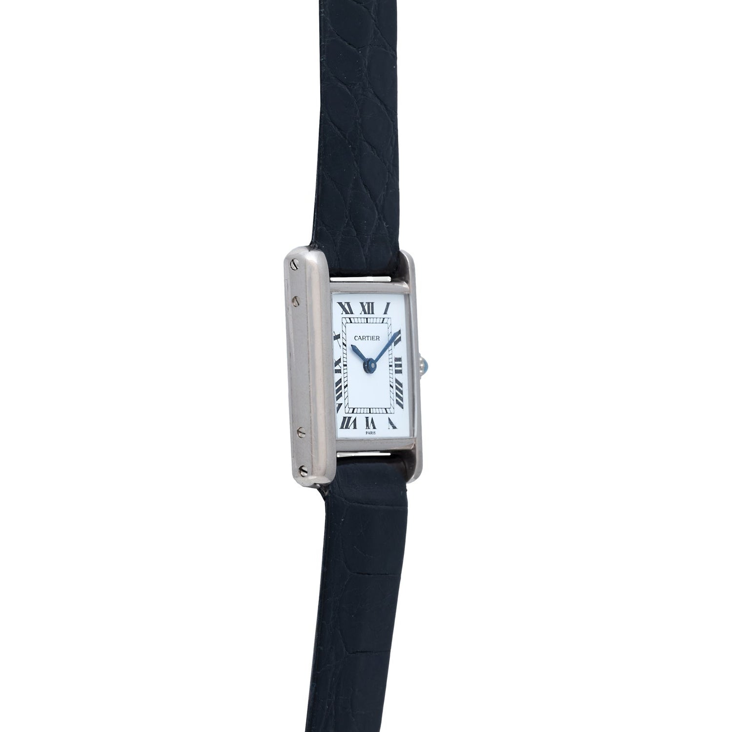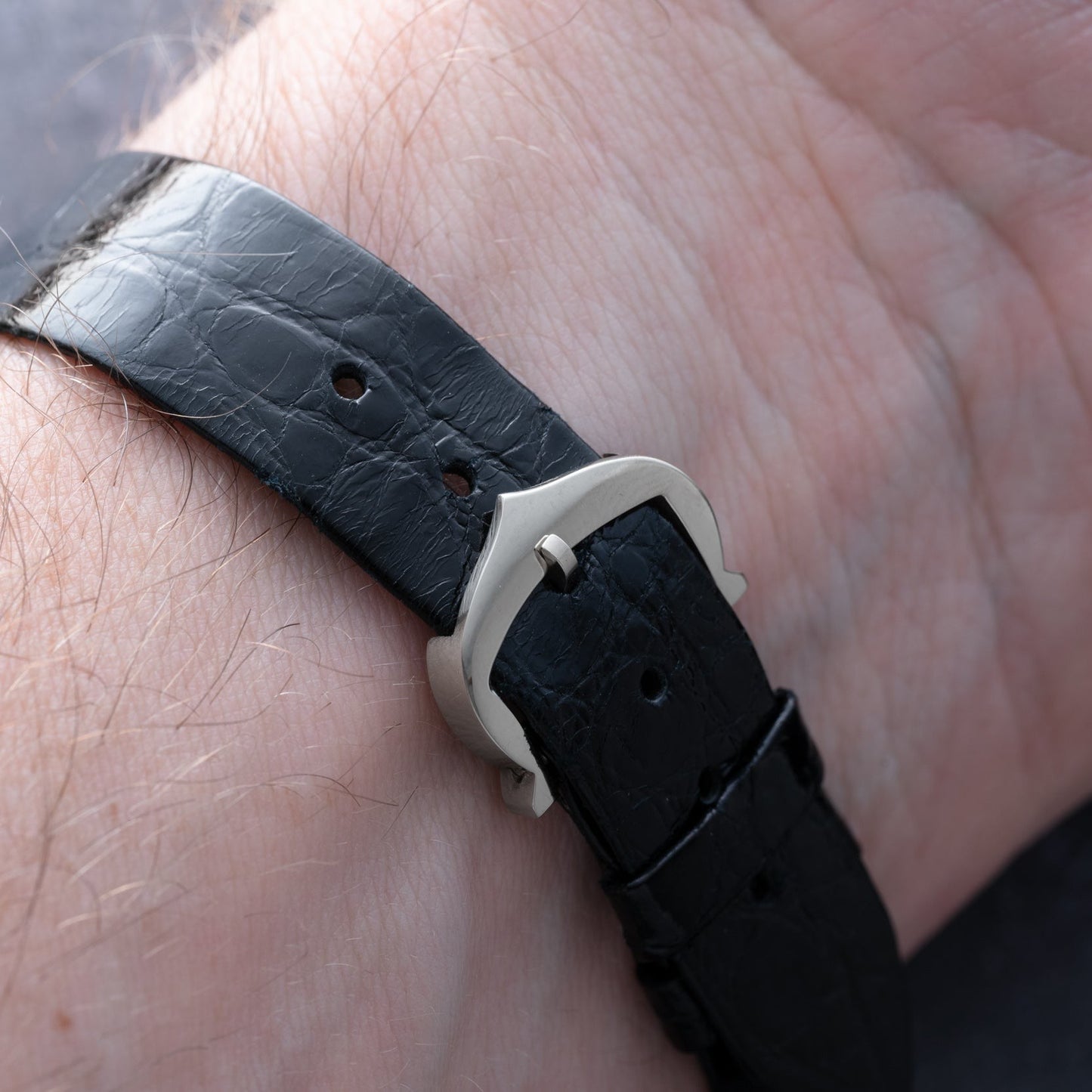 This particular Tank Louis dates to the latter half of the 20th century and features an extremely uncommon white metal case with a mineral crystal, a sapphire cabochon winding crown, and a white dial with printed 'Roman' indices and a matching, blued-steel 'sword' handset. Powered by a manually-wound movement, it comes fitted to an alligator leather strap.