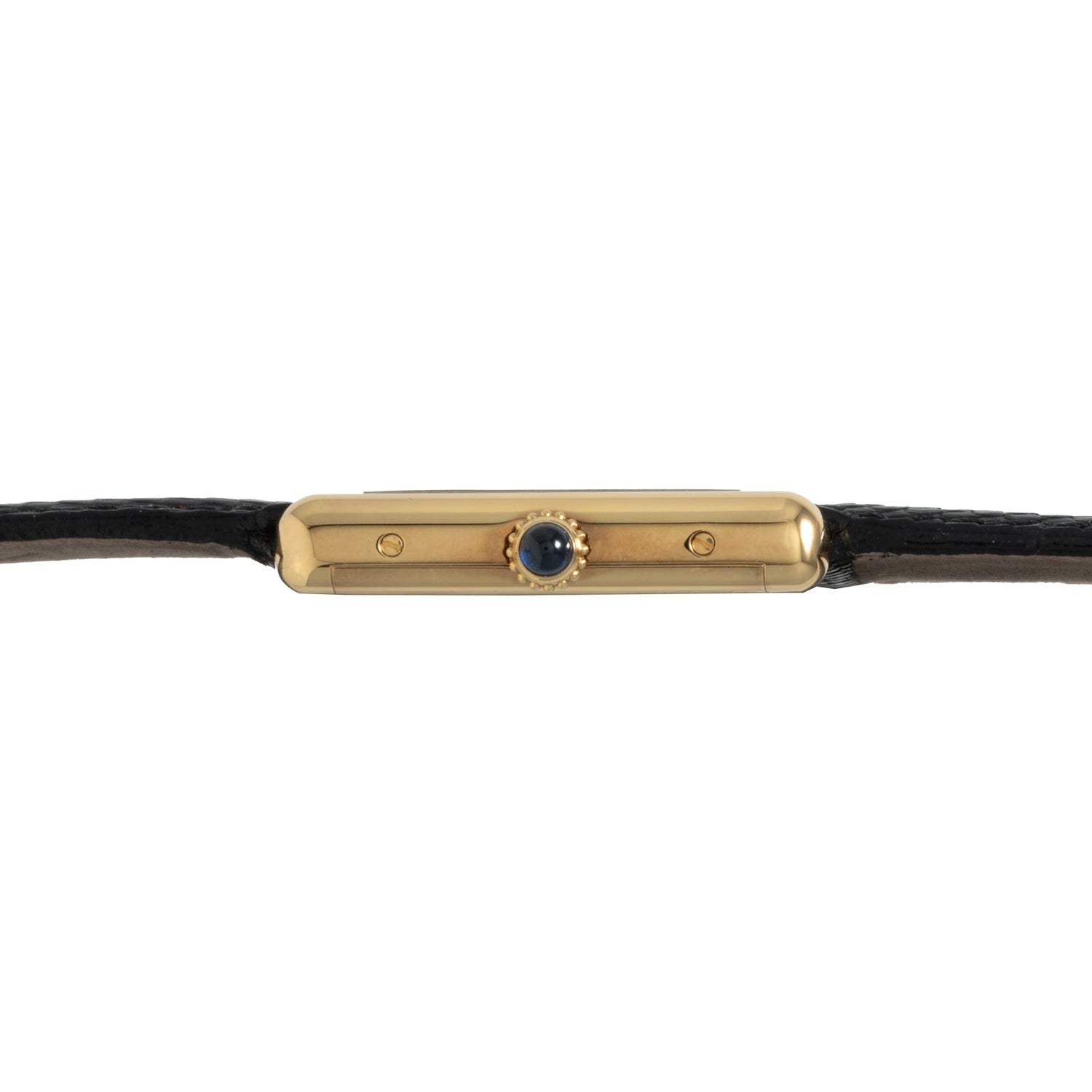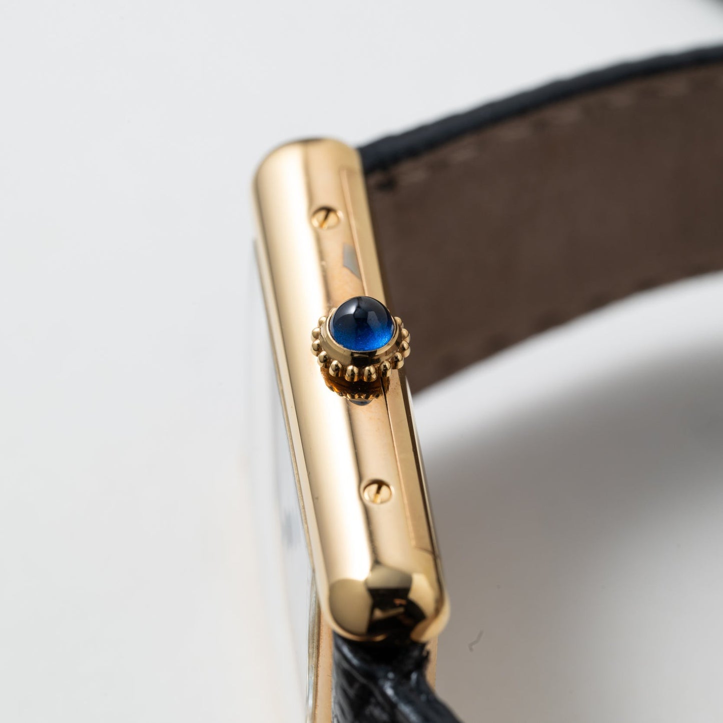 This beautiful example, plated in yellow gold and featuring a blue cabochon crown and an acrylic crystal, features a white dial with chemin de fer minute track, ‘Roman’ numerals, and a set of blued ‘sword’ hands. Furthermore, it has a coveted ‘Paris’-signed dial, signifying that it emanates from the maison’s French headquarters. Manually wound and paired to a signed black lizard strap with a gold-plated pin buckle, its excellent proportions make it a unisex masterpiece.