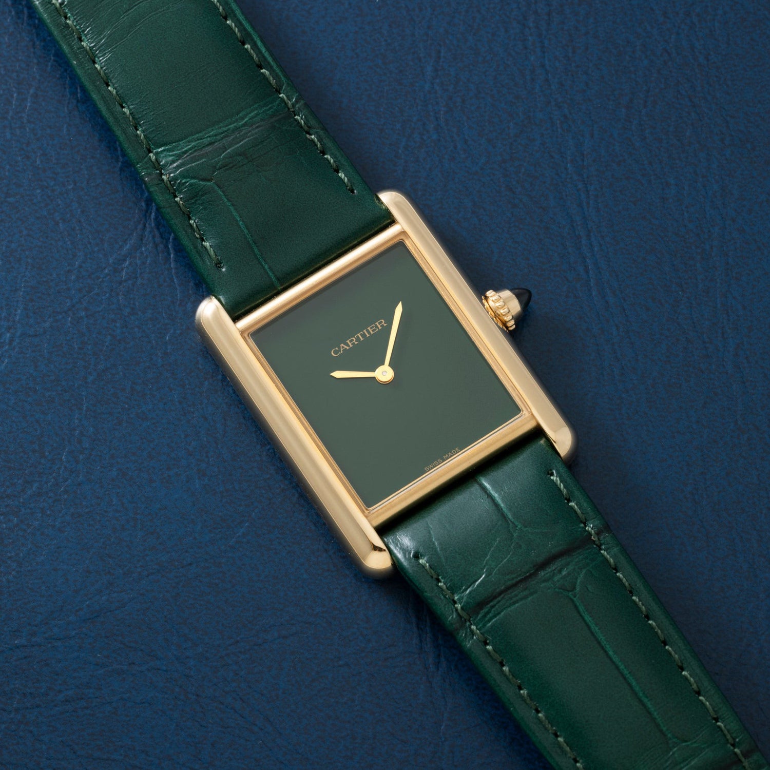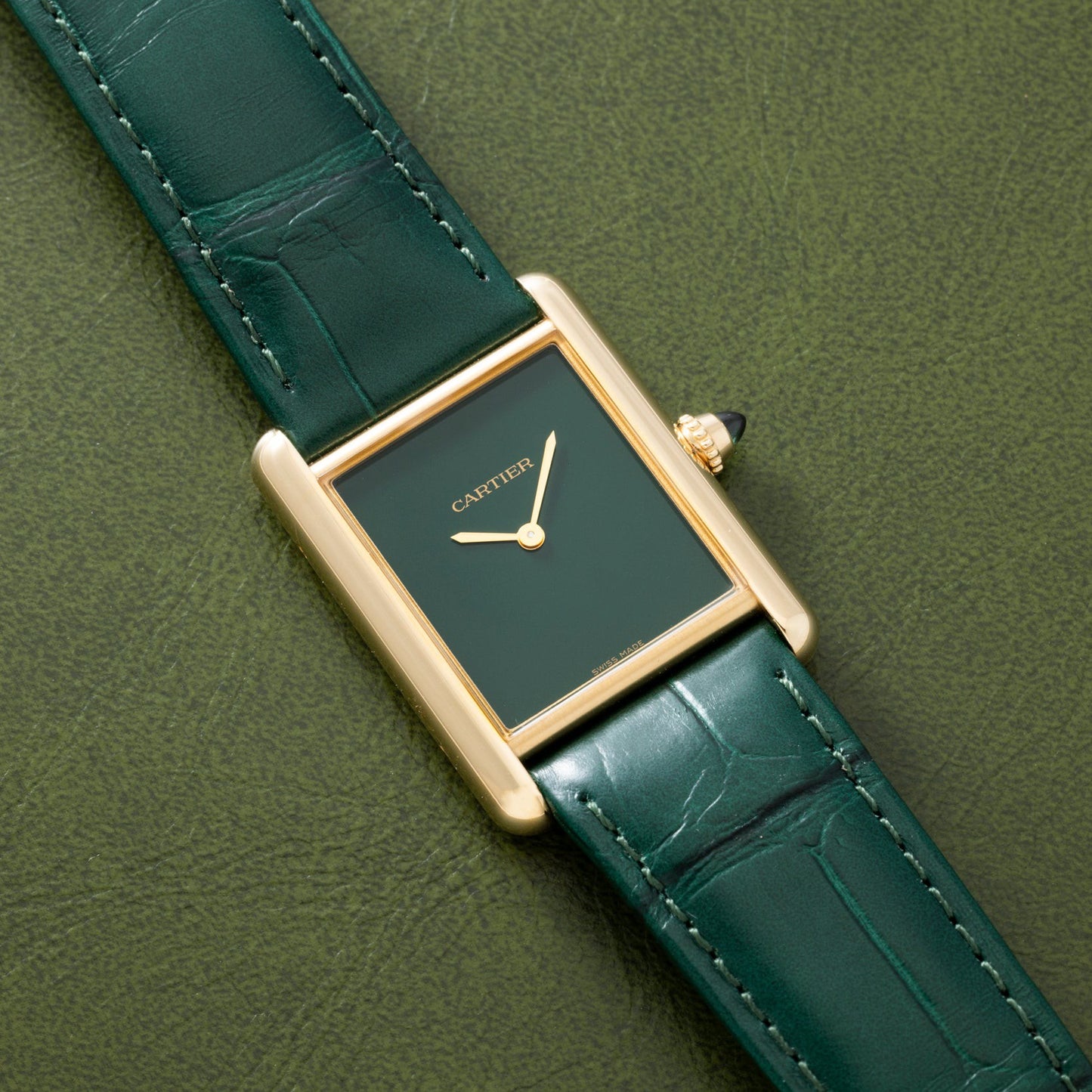 This particular Tank Louis Cartier, dating to the 2020s, features a 25.5mm x 33.5mm yellow gold case with a sapphire crystal, a sapphire cabochon winding crown, a lovely green lacquer dial, and a matching yellow gold 'sword' handset.
