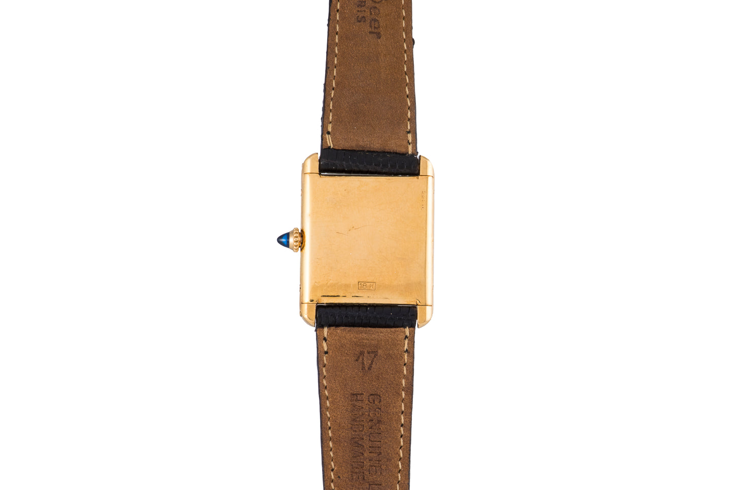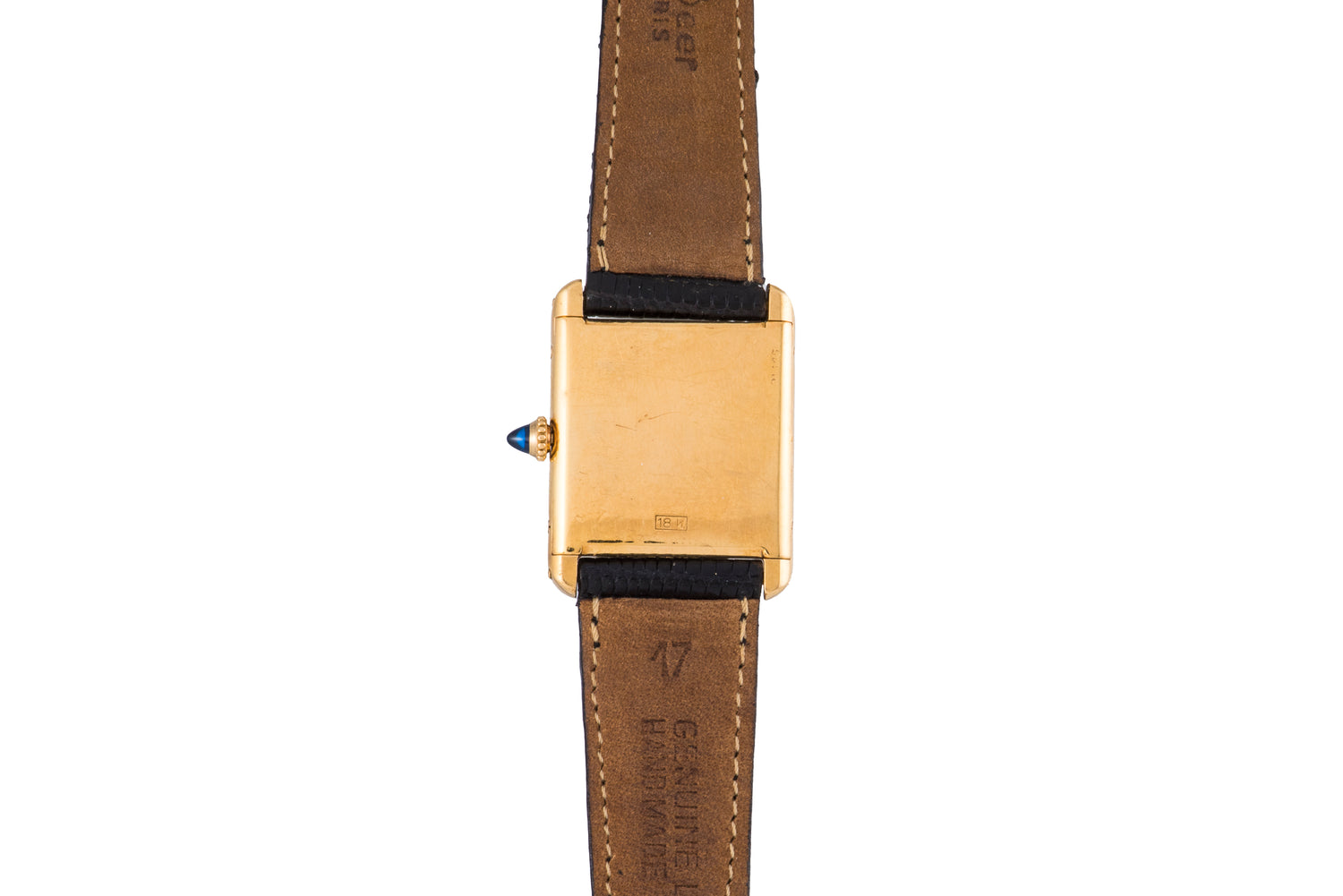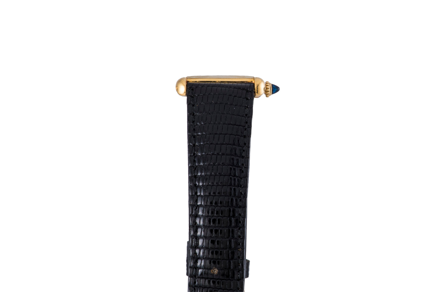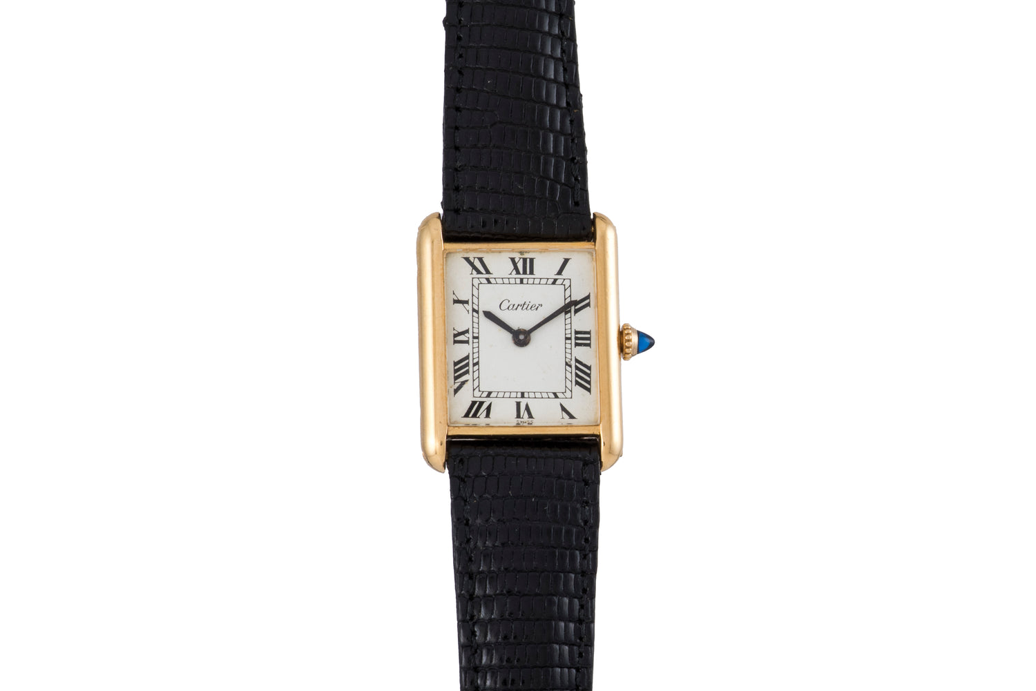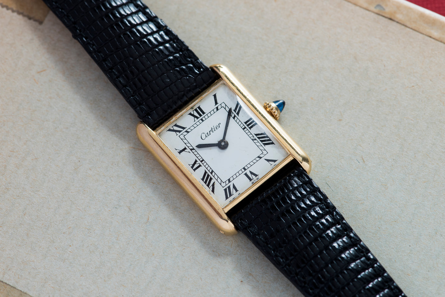This particular Tank Louis dates to circa the 1960s and features a 24mm 18K yellow gold case with a mineral crystal, a sapphire cabochon winding crown, and a white enamel dial with printed Roman indices and a matching blued-steel 'sword' handset.