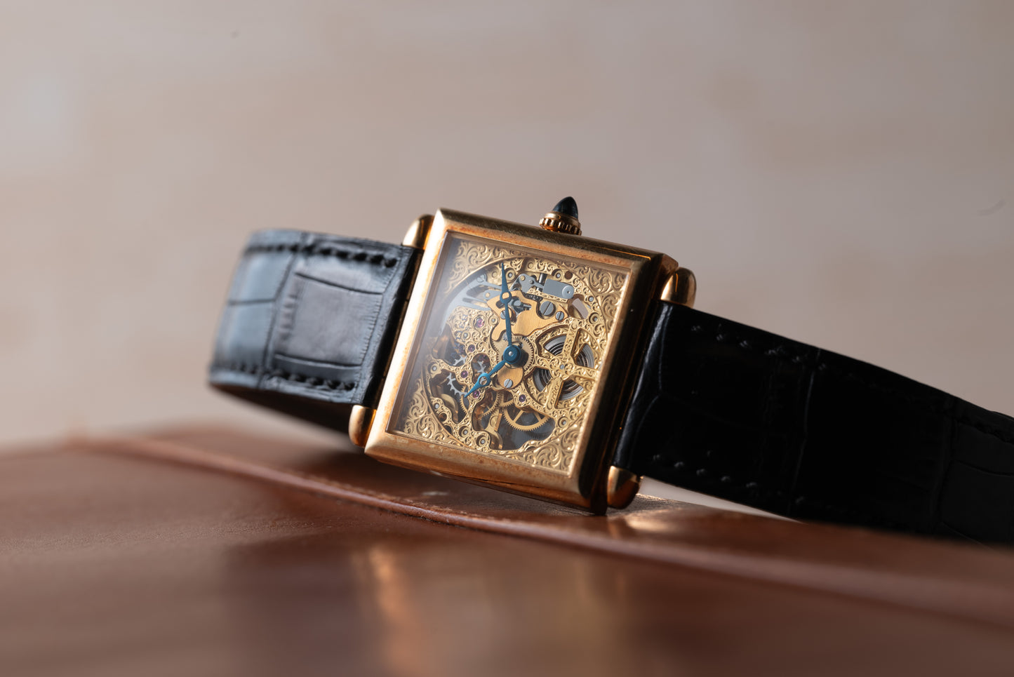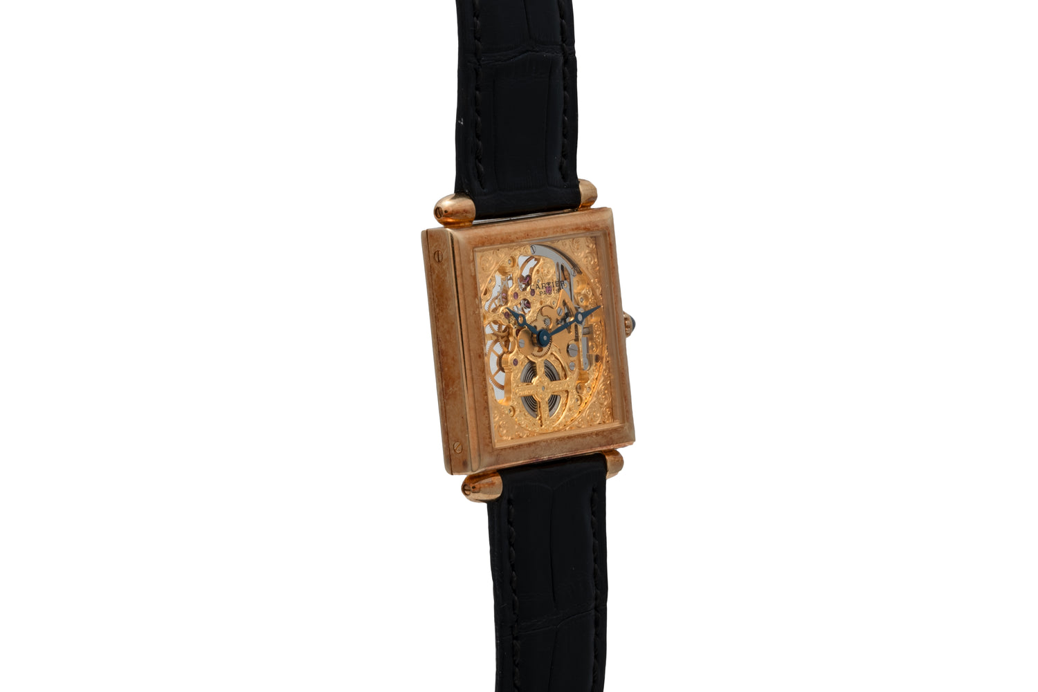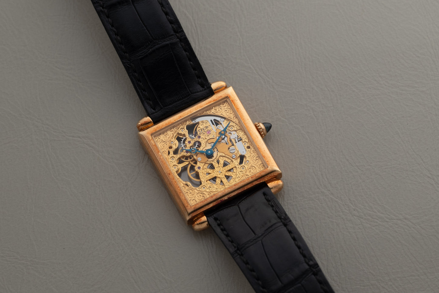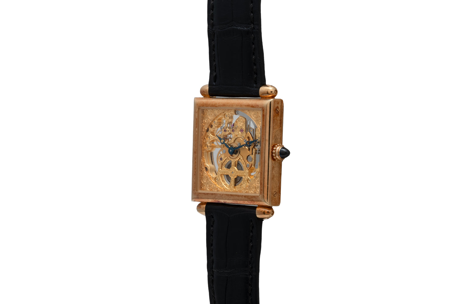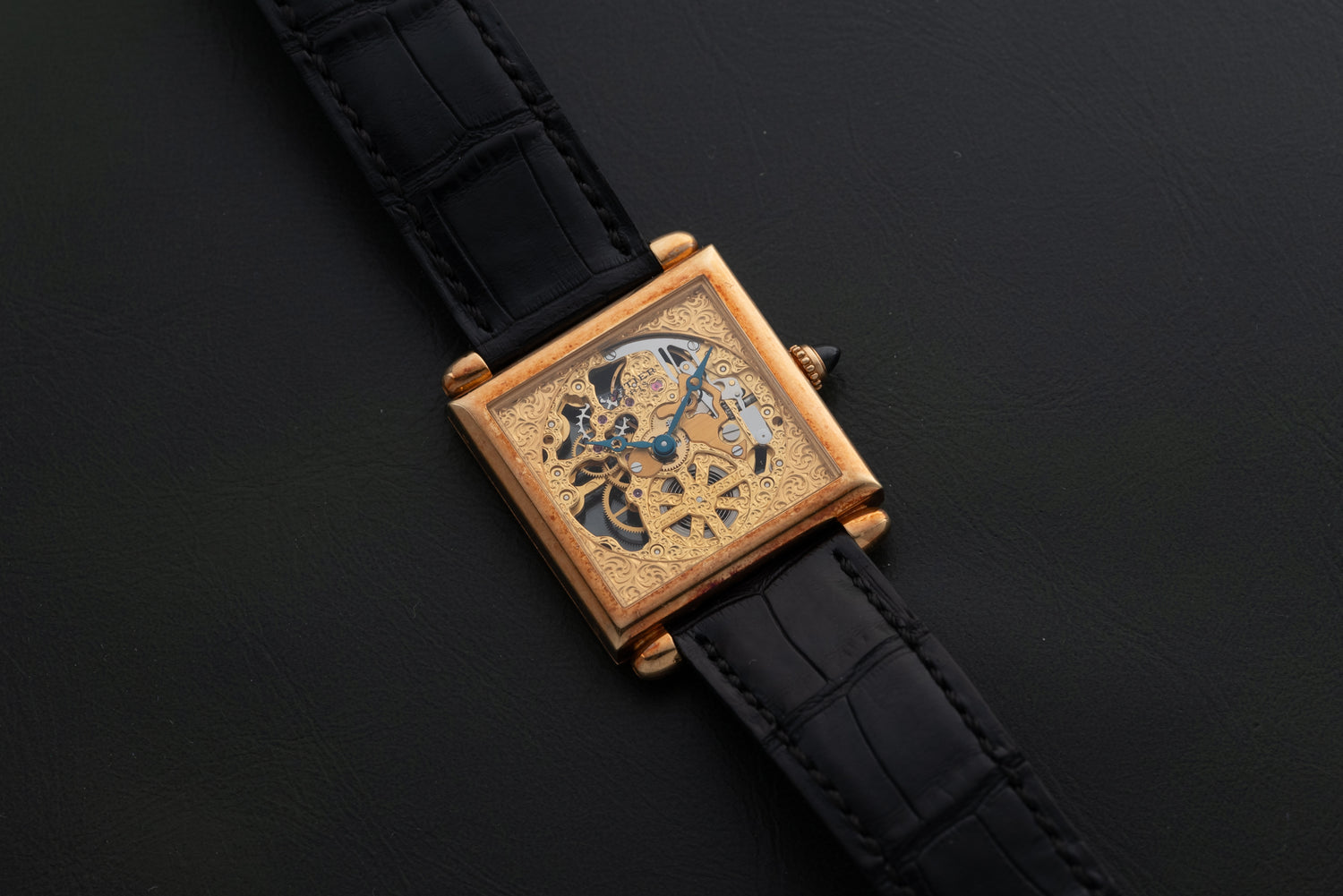 This piece features the same design cues. Housed in a 27mm 18K yellow gold case, this piece features a cabochon crown and bullet lugs set against the pointed edges of its square silhouette. Sandwiched between two sapphire crystals, this piece features an elaborate skeletonized dial with a matching blued-steel Breguet handset and gogeous, hand-finished, yellow gold dial plate. The underside of the case reveals its manual-winding Cartier Calibre 435 MC movement.