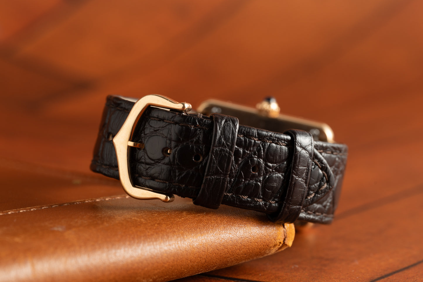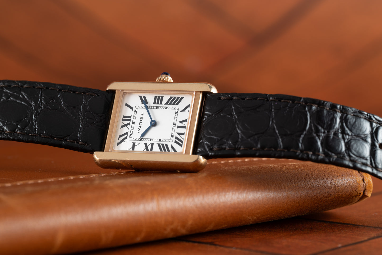 This variant features a 31mm x 24.4mm case, sapphire crystal and Cartier's signature sapphire cabochon crown. Its white dial remains simple and elegant, featuring printed ‘Roman’ indices, a matching blued-steel handset and a double Cartier signature. It comes fitted on a glossy alligator leather strap with a solid 18k ardillon pin buckle.