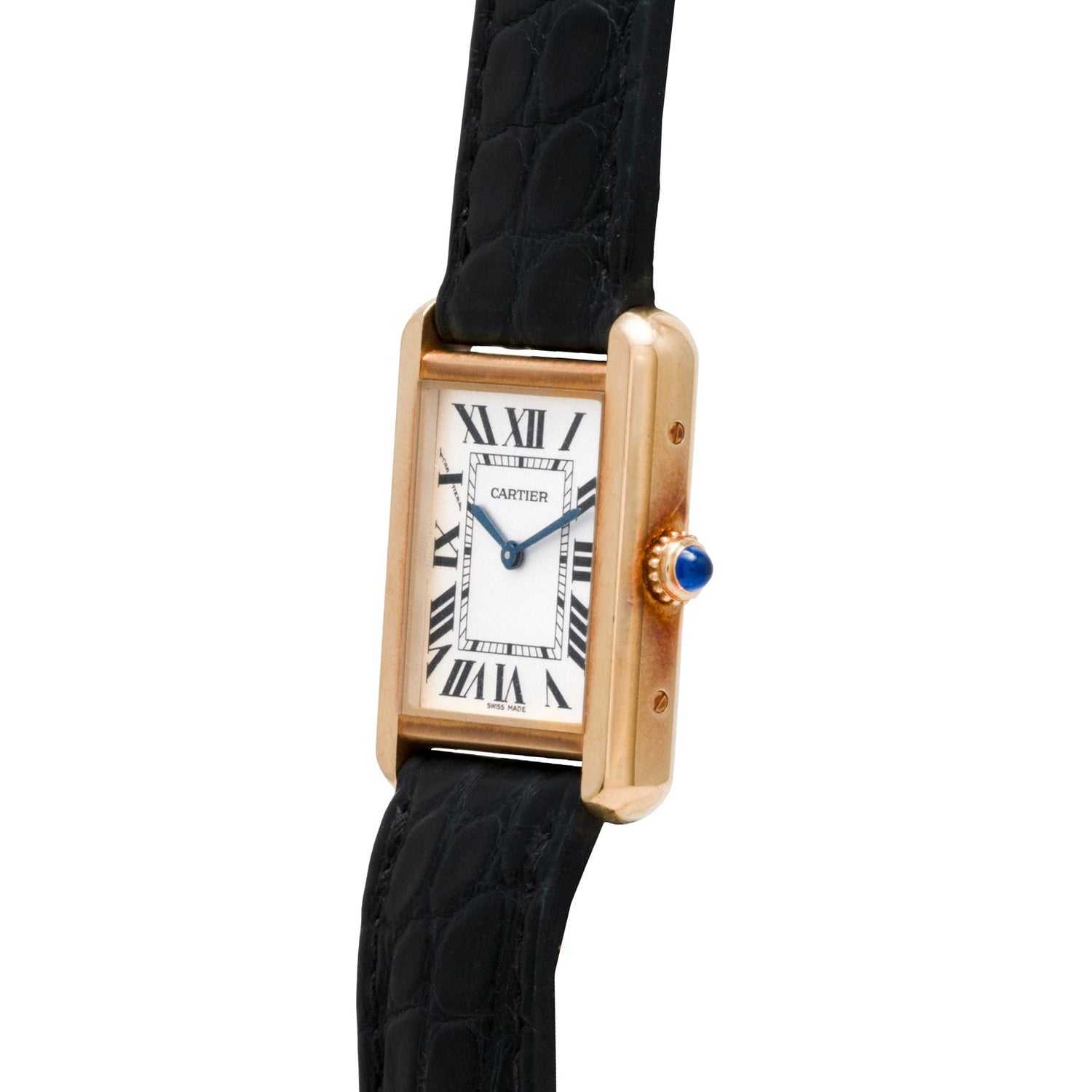 This variant features a 31mm x 24mm case, sapphire crystal and Cartier's signature sapphire cabochon crown. Its silver dial remains simple and elegant, featuring printed ‘Roman’ indices, a matching blued-steel handset and a double Cartier signature. It comes fitted on a alligator leather strap with a solid 18K yellow gold Ardillon pin buckle.
