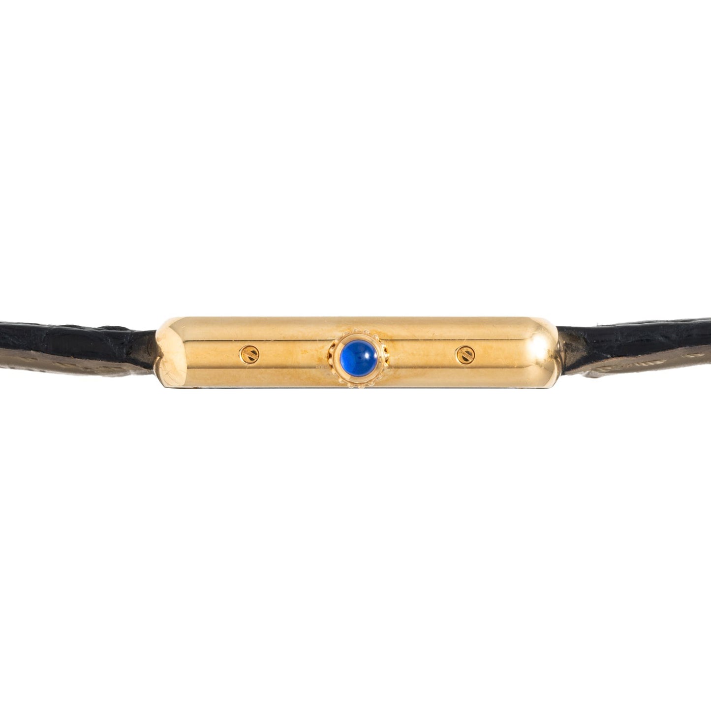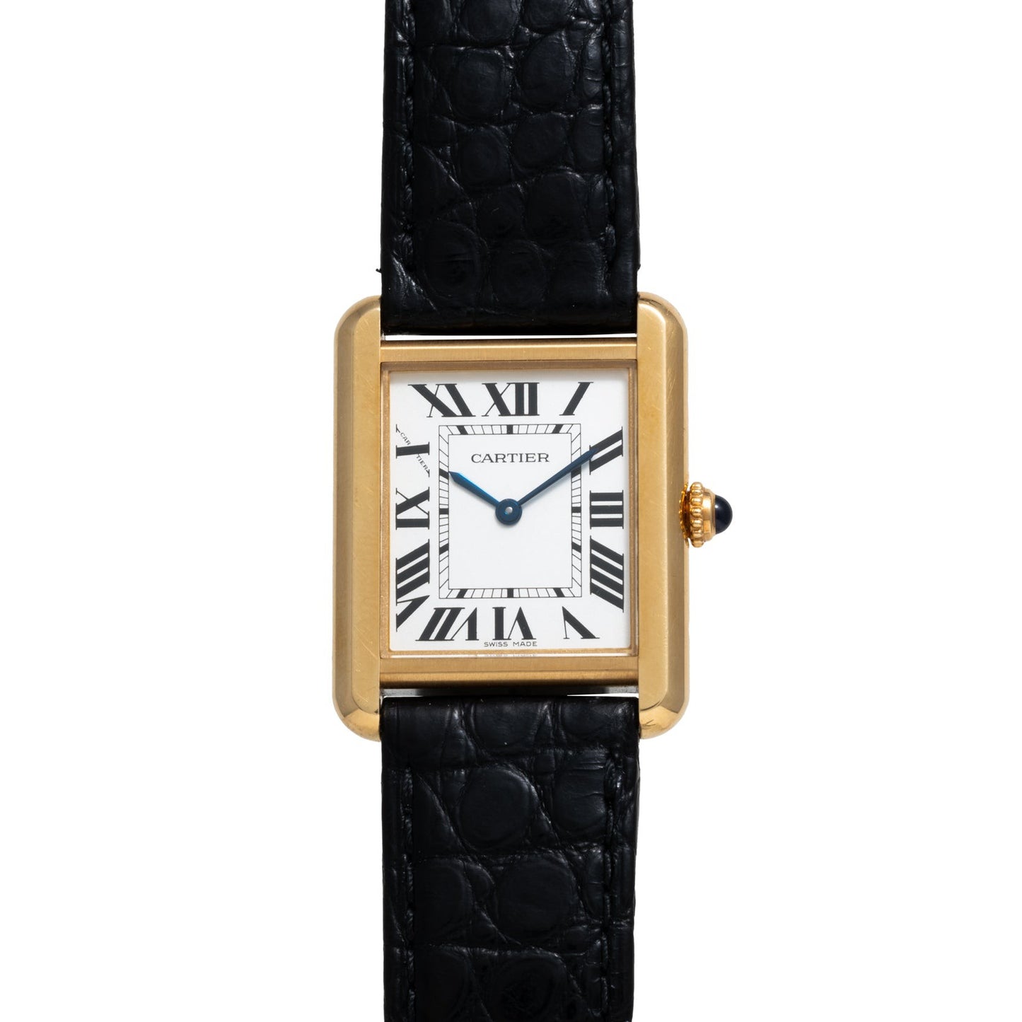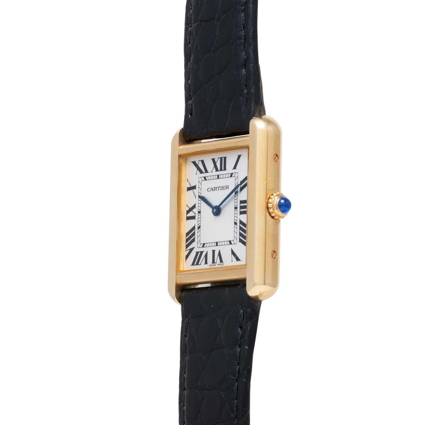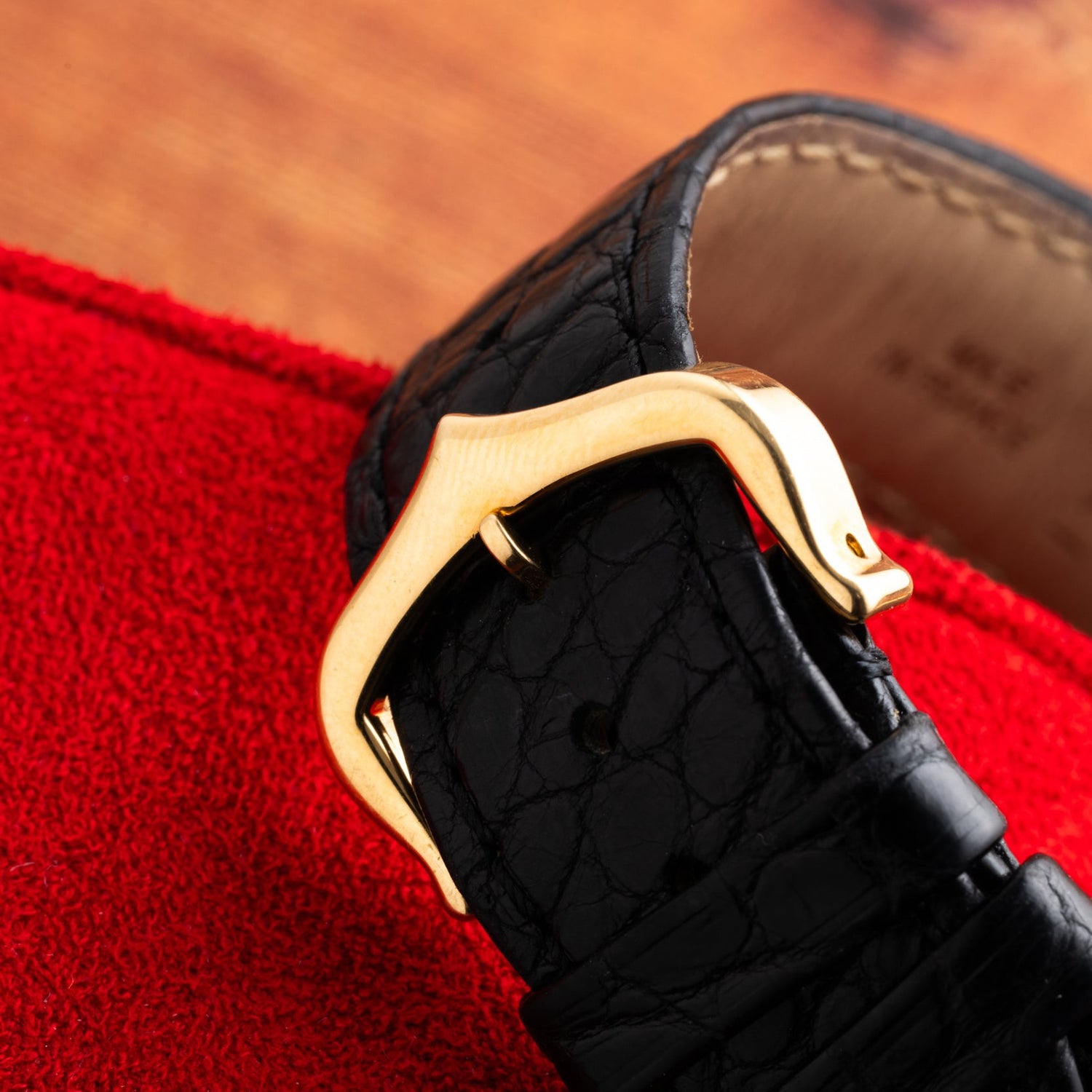This variant features a 31mm x 24.4mm case, sapphire crystal and Cartier's signature sapphire cabochon crown. Its white dial remains simple and elegant, featuring printed ‘Roman’ indices, a matching blued-steel handset and a double Cartier signature. It comes fitted on a glossy alligator leather strap with a solid 18k ardillon pin buckle.