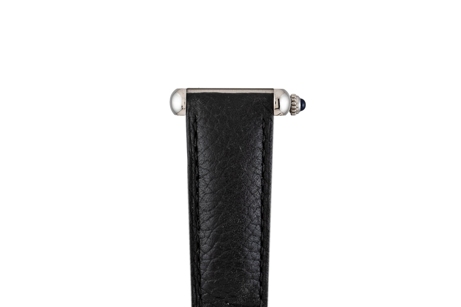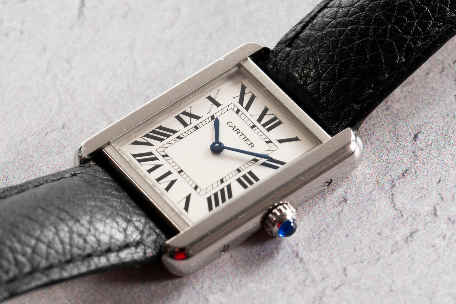 This particular Tank, a Solo 'small model', features a 24.4mm x 31mm stainless steel case with a sapphire crystal, a signature sapphire cabochon crown, a crisp satin silver dial with printed black 'Roman' indices, an inner ‘railroad’ minute track, and a matching blued-steel ‘sword’ handset.