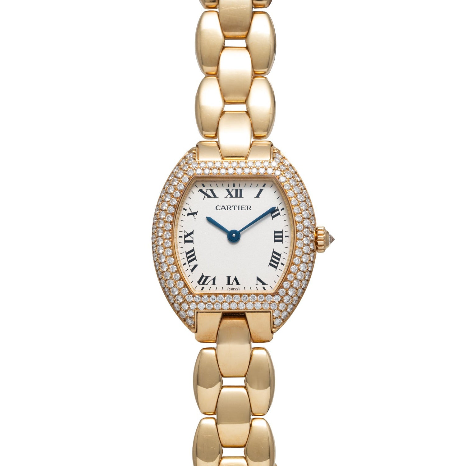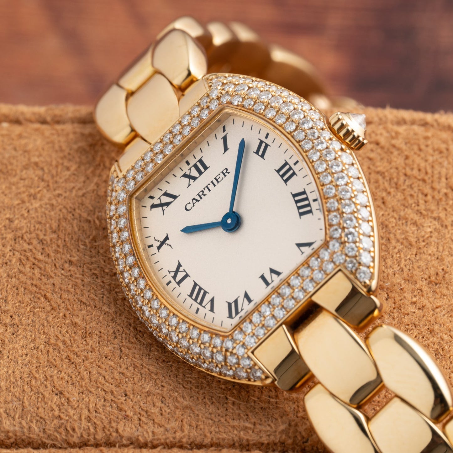 This example, a Reference 1945, features a 24mm 18K yellow gold tonneau case with factory-set diamonds encircling the case hood and a cabochon crown with a sapphire inset. The silver dial features a subtle texture finish with Roman indices, a matching blued-steel 'sword' handset and a hidden Cartier signature at 10 o'clock.