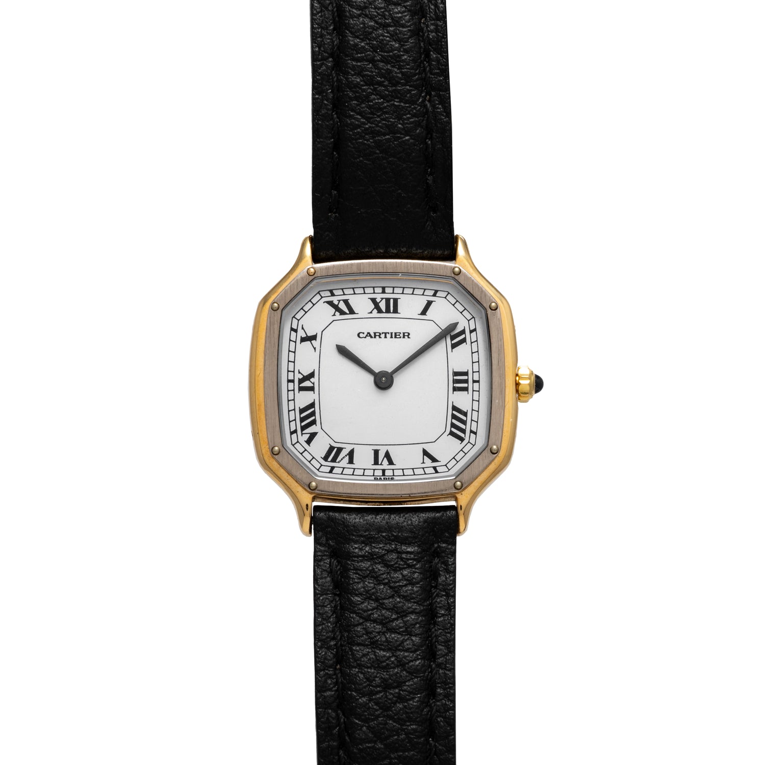 This particular example, a Trianon ladies model, dates to the 1980s and features a faceted ultra thin 25mm 18K yellow gold case, a Paris-signed white Roman dial, and Cartier's signature sapphire cabochon winding crown.