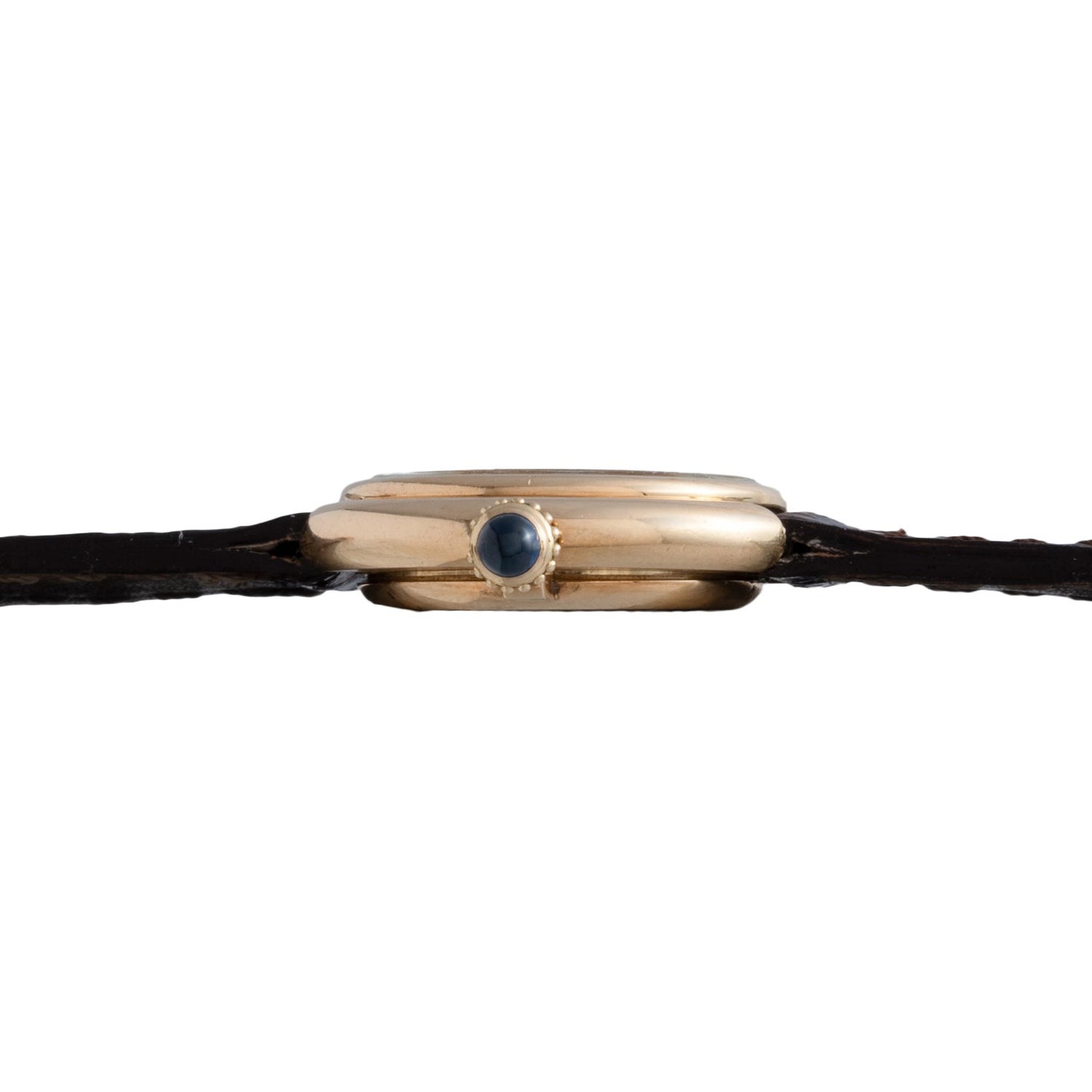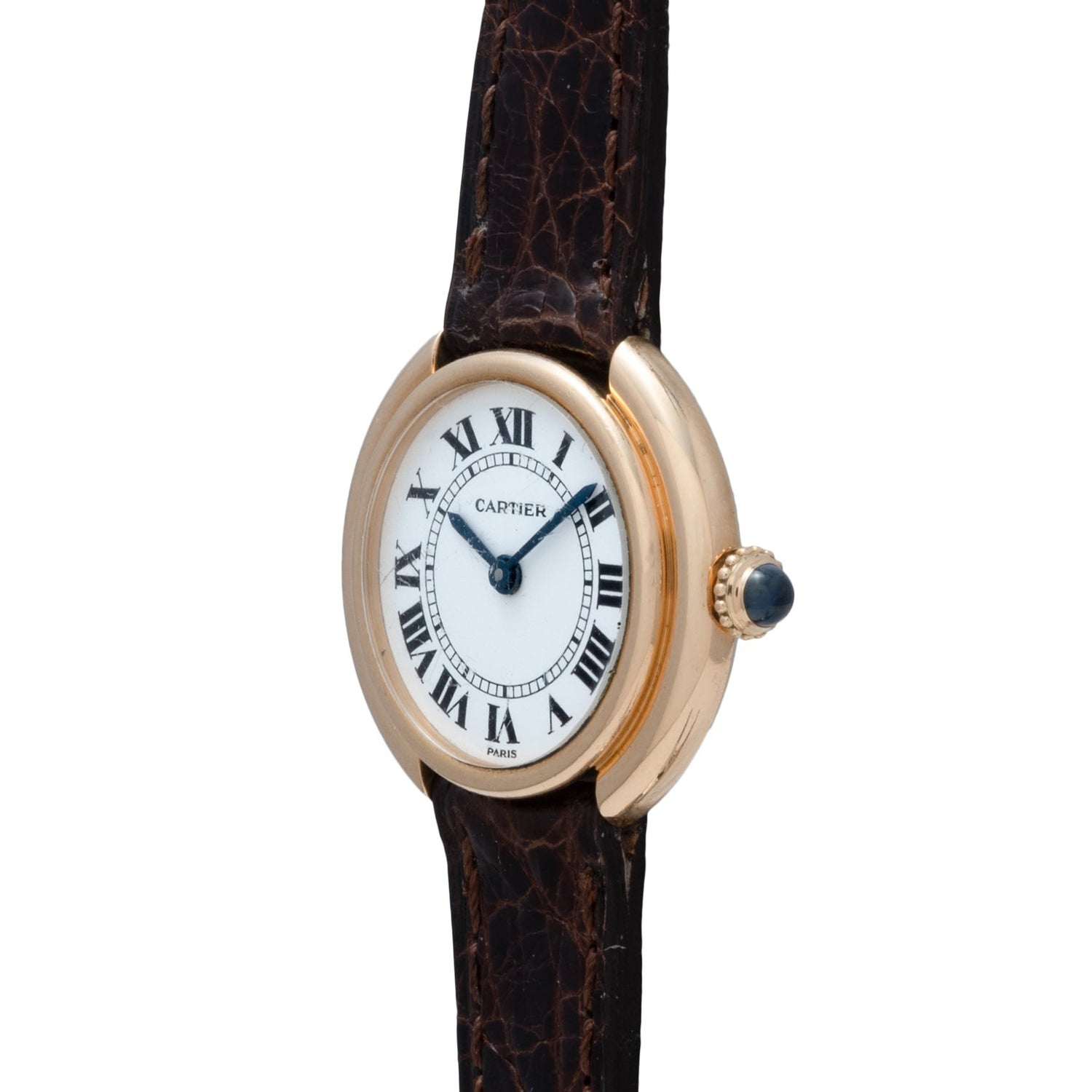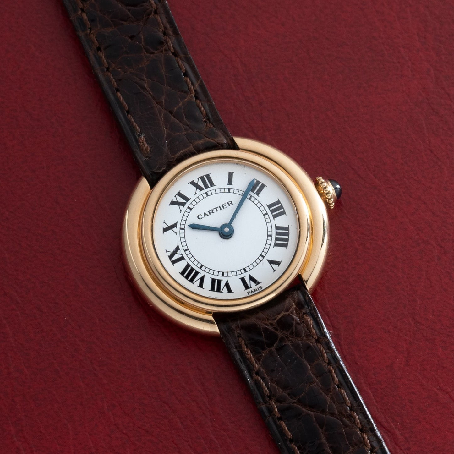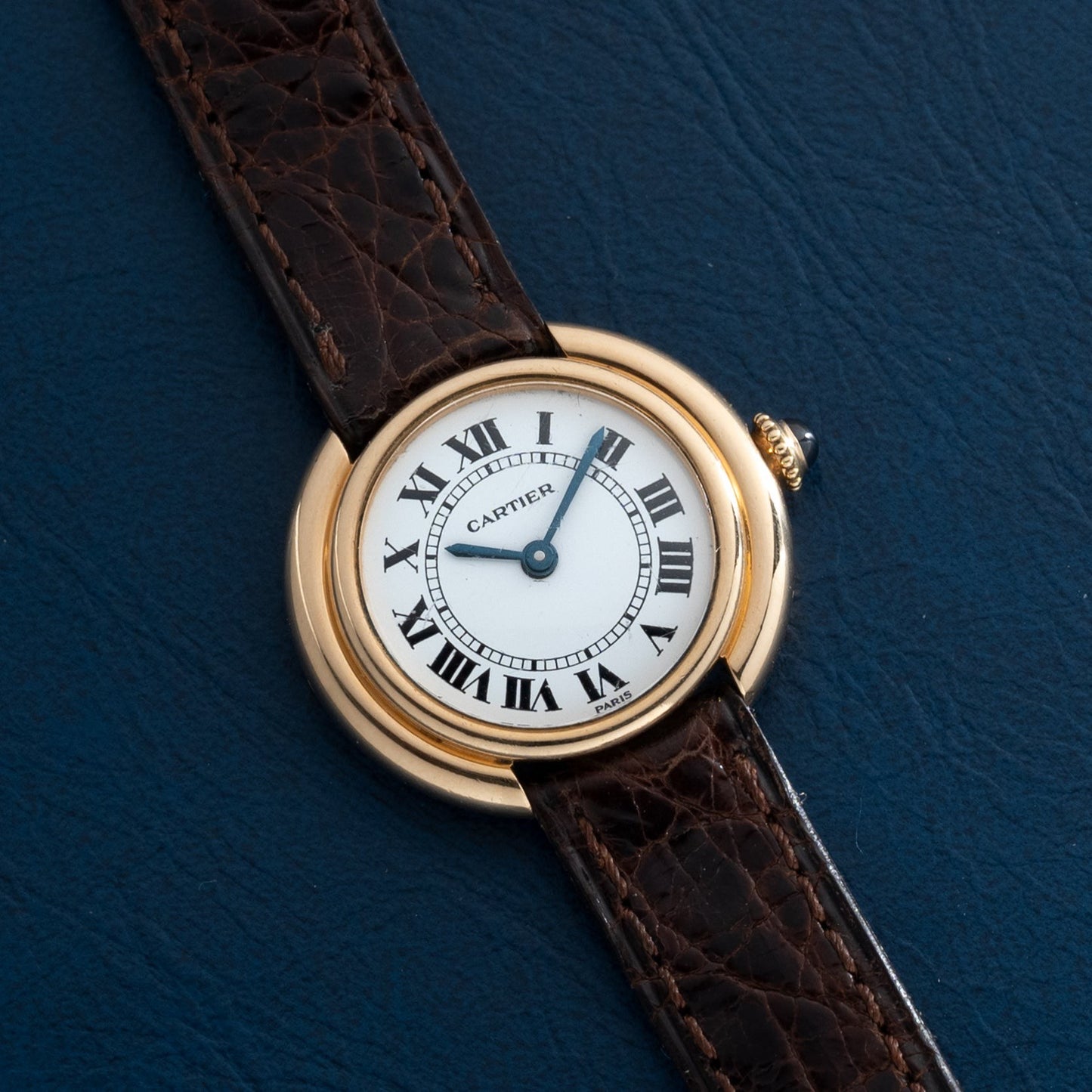 This particular piece, a Vendome model, dates to the circa 1990s and features a 26mm stepped 18K yellow gold case with a sapphire cabochon winding crown, a glossy white 'Paris' dial with printed Roman indices and a matching blued-steel 'sword' handset, and a manually-wound movement within.