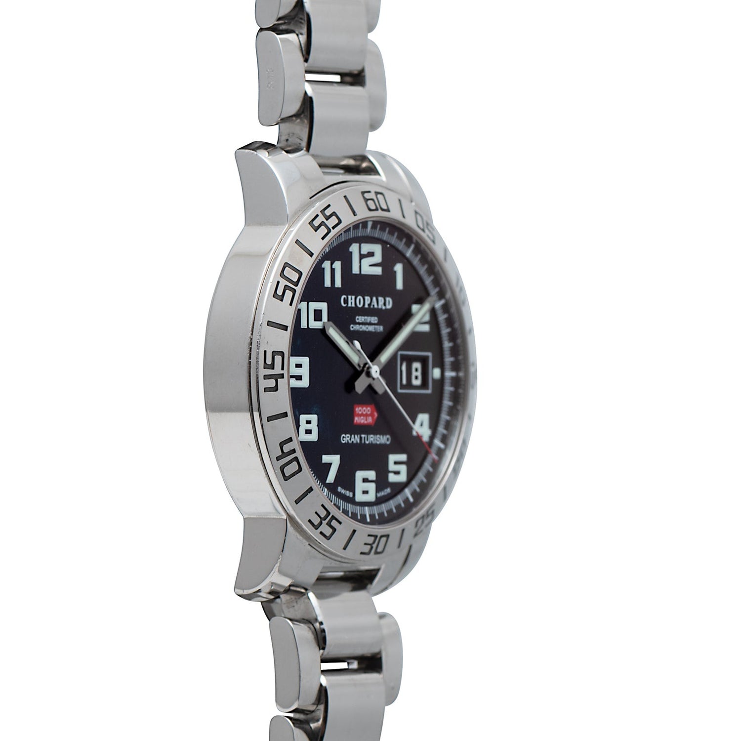 Every year, Chopard releases a special edition Mille Milgia watch such as this Chopard Mille Miglia Gran Turismo. Housed in a 40.5mm stainless steel case with a sapphire crystal, it features a fixed steel timing bezel, a signed crown, a luminous gloss black dial with ‘Arabic’ indices, a matching ‘stick’ handset and a ‘digital’ date display.