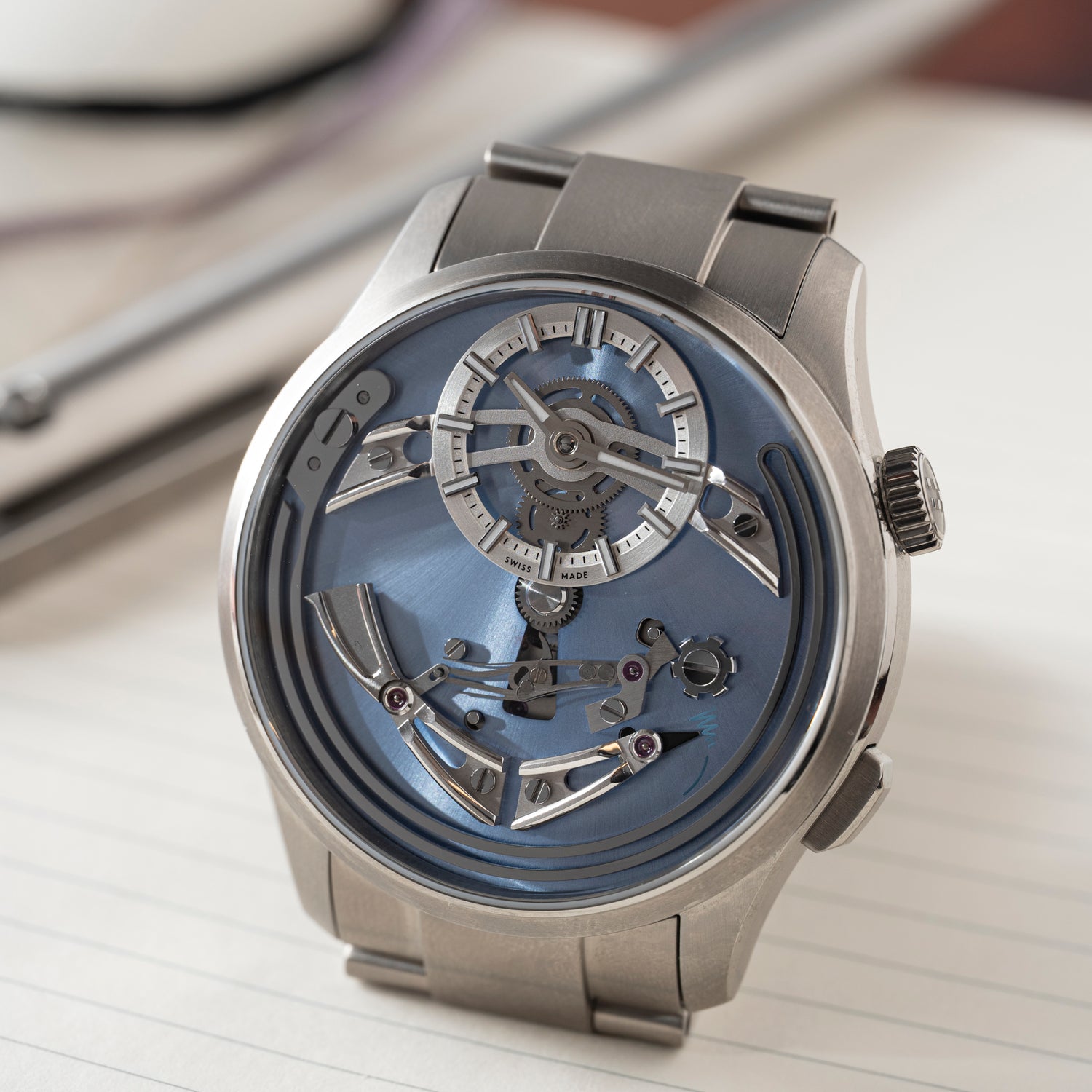 This particular Bel Canto Cielo comes fashioned from titanium with a 41mm case. The reference C01-41-APT1-T00B1 features a blue dial with the exposed gong system visible at the bottom, and a skeletonized time display at 12. This piece is set on its titanium bracelet and with its box set.
