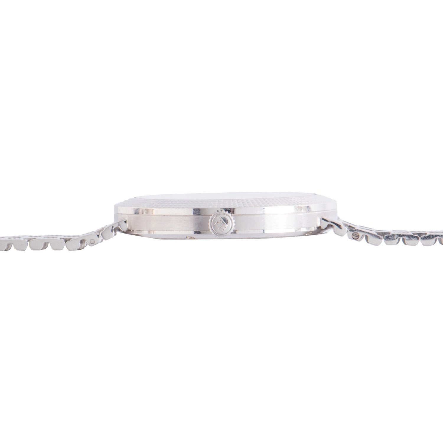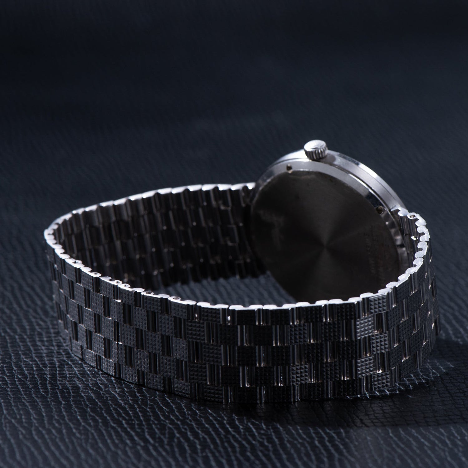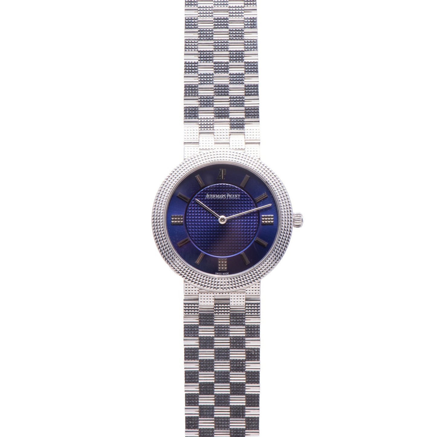 This particular piece dates to the 1990s and features a 33mm 18k white gold case with a white gold Clous de Paris bezel and a matching integrated multi-link bracelet with a hidden clasp. Simply and gracefully executed, its sapphire blue dial features micro-tapisserie texturing in the center with an iridescent sunburst chapter ring with applied indices and a matching 'pencil' handset that jump off the dial ever-so elegantly.