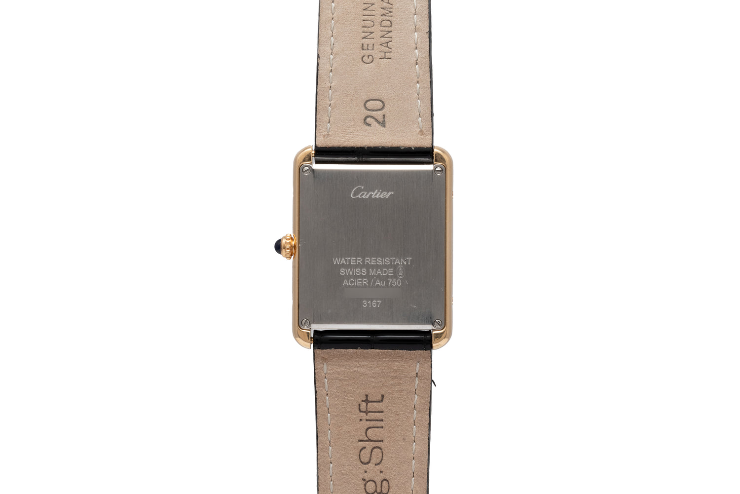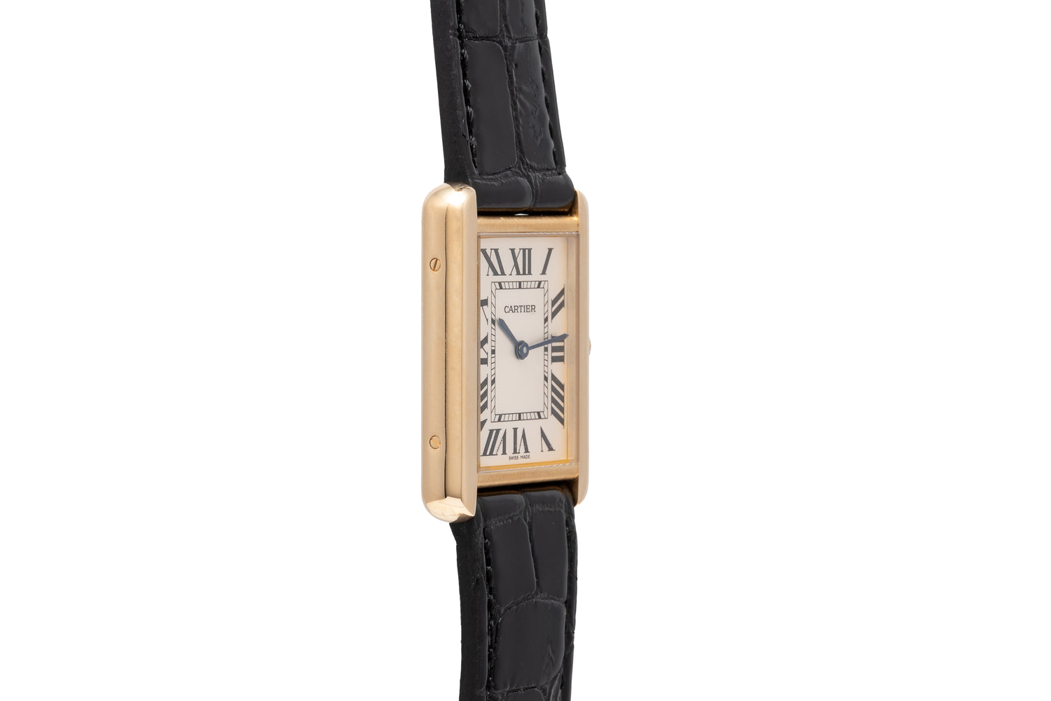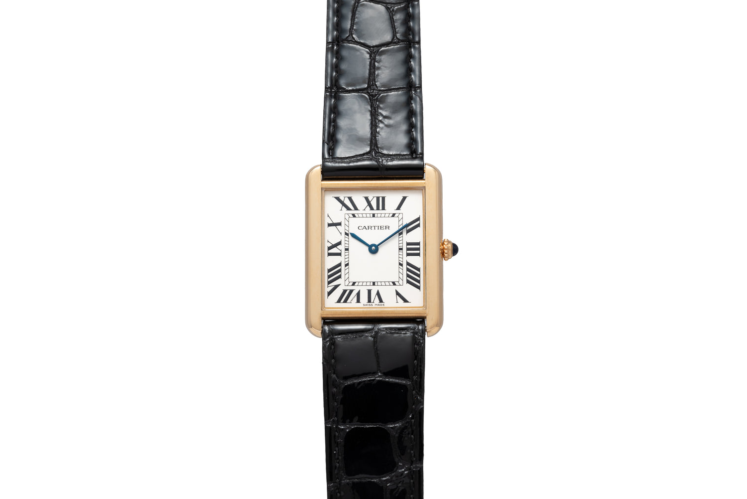 This Large size variant features a 28mm x 35mm case, sapphire crystal and Cartier's signature sapphire cabochon crown. Its silver dial remains simple and elegant, featuring printed ‘Roman’ indices, a matching blued-steel handset and a double Cartier signature. It comes fitted on a glossy black alligator leather strap with a solid 18k ardillon pin buckle.