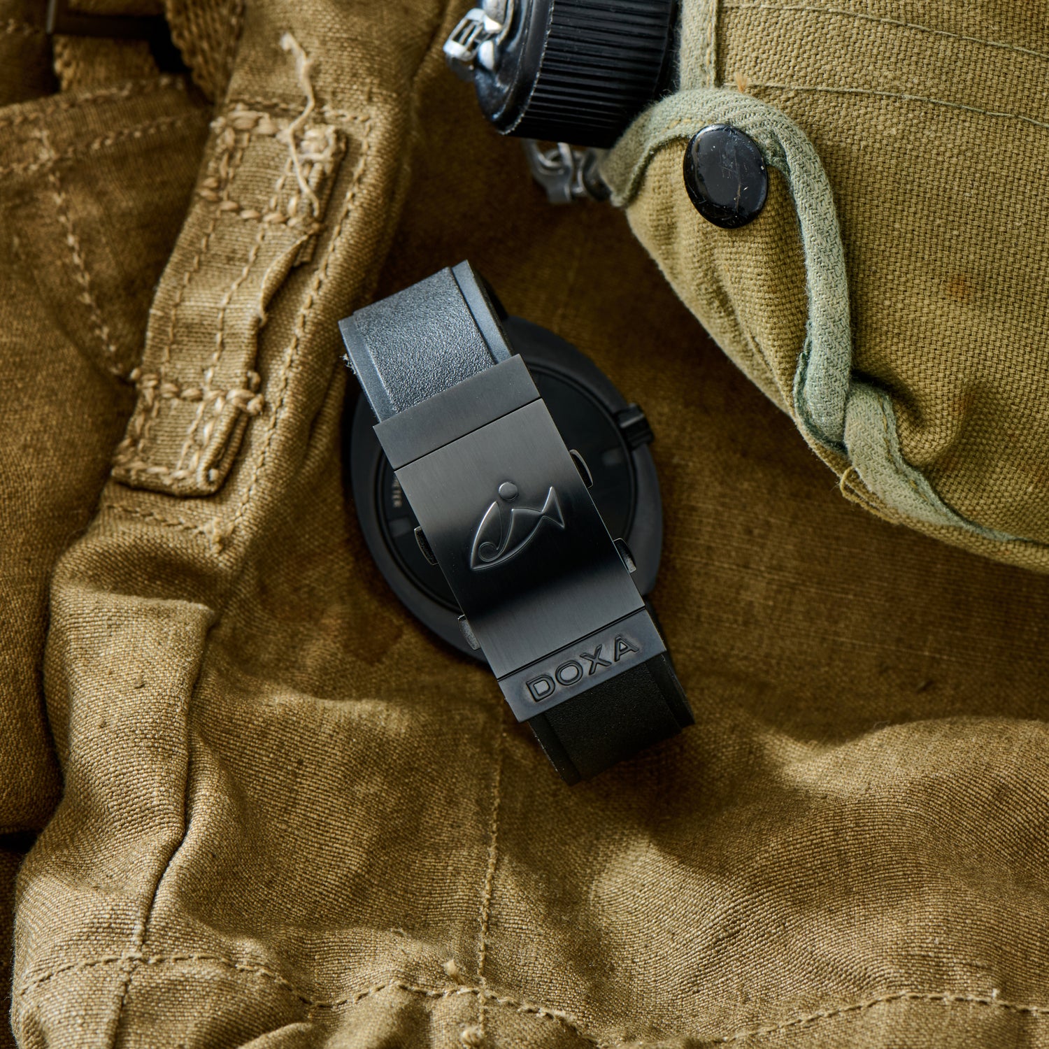 The DOXA Army Watches Of Switzerland is being produced in a series of 100 numbered pieces - this particular model is #31/100. Each piece comes on a fitted black rubber diving strap featuring an expanding diver's clasp, and also includes special edition camouflage pattern packaging and pass-through NATO style nylon strap as a nod to the zippered camouflage pouch offered with the original model in the 1970s.