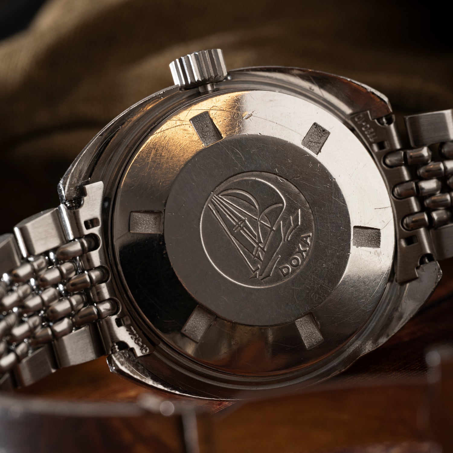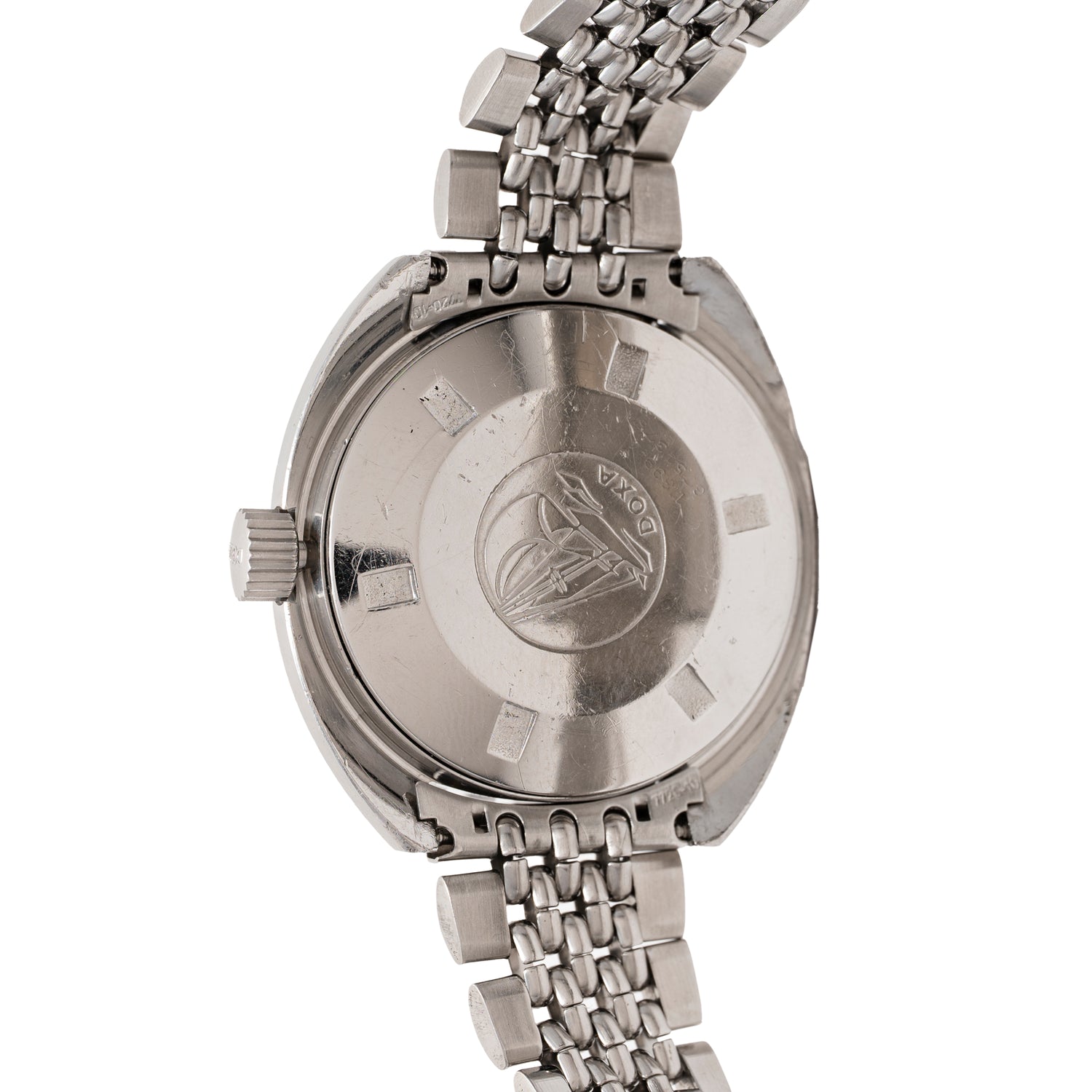 printed hour indices, an oversized minute hand, a 'dwarf' hour hand, a date window at 3 o’clock, and notably, and the ‘Aqua Lung’ logo in the lower left quadrant. Beautifully patinated luminous material and well preserved printing make help this example stand out from the crowd. Powered by an automatic Swiss-made movement and paired to its correct stainless steel 'beads-of-rice' bracelet with a DOXA-signed clasp, this Sharkhunter is ready for action.