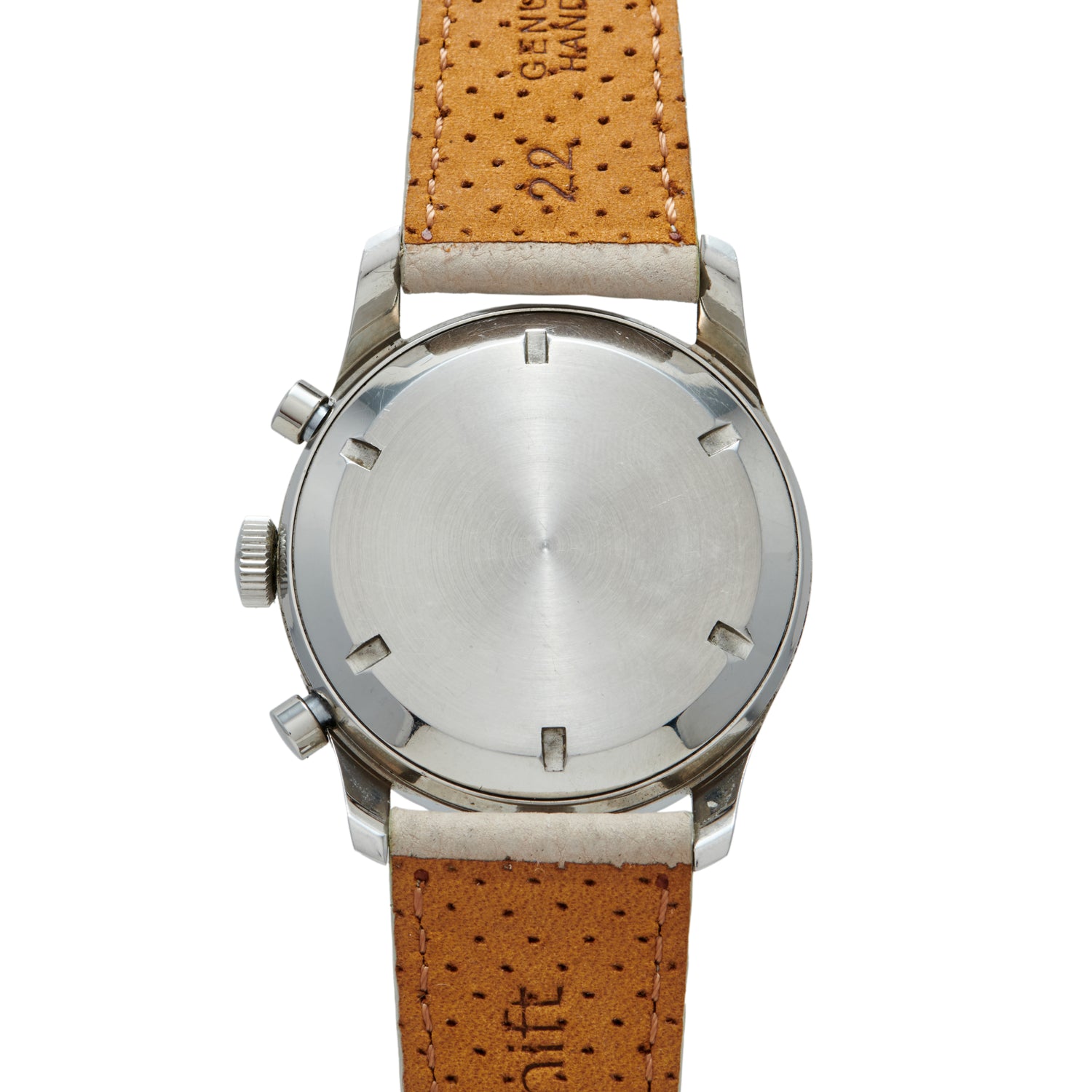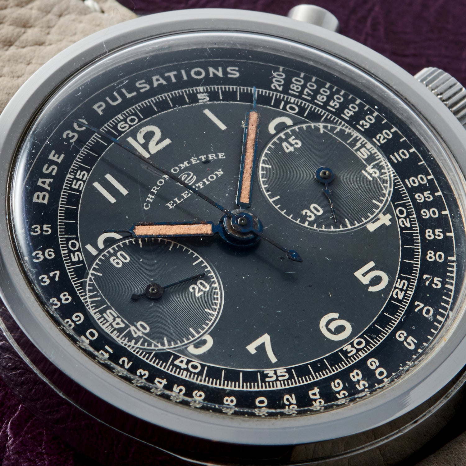 This particular chronograph was produced by Election, a defunct Swiss firm that won the Berne Grand Prix in 1914 and whose ladies' watches were the first to achieve the Kew certificate at England's famous observatory. Measuring 40mm in stainless steel and featuring dual pump pushers, an unsigned crown, a stepped bezel, and an acrylic crystal, it boasts a stunning grey dial with an outer pulsations scale in black, a 1/5th-seconds track, dual chronograph totalizers, stylized 'Arabic' numerals, and a luminous 'syringe' handset. Powered by a hand-wound Valjoux movement, it notably features a screw-down caseback — a relatively rare feature for a chronograph from this era.