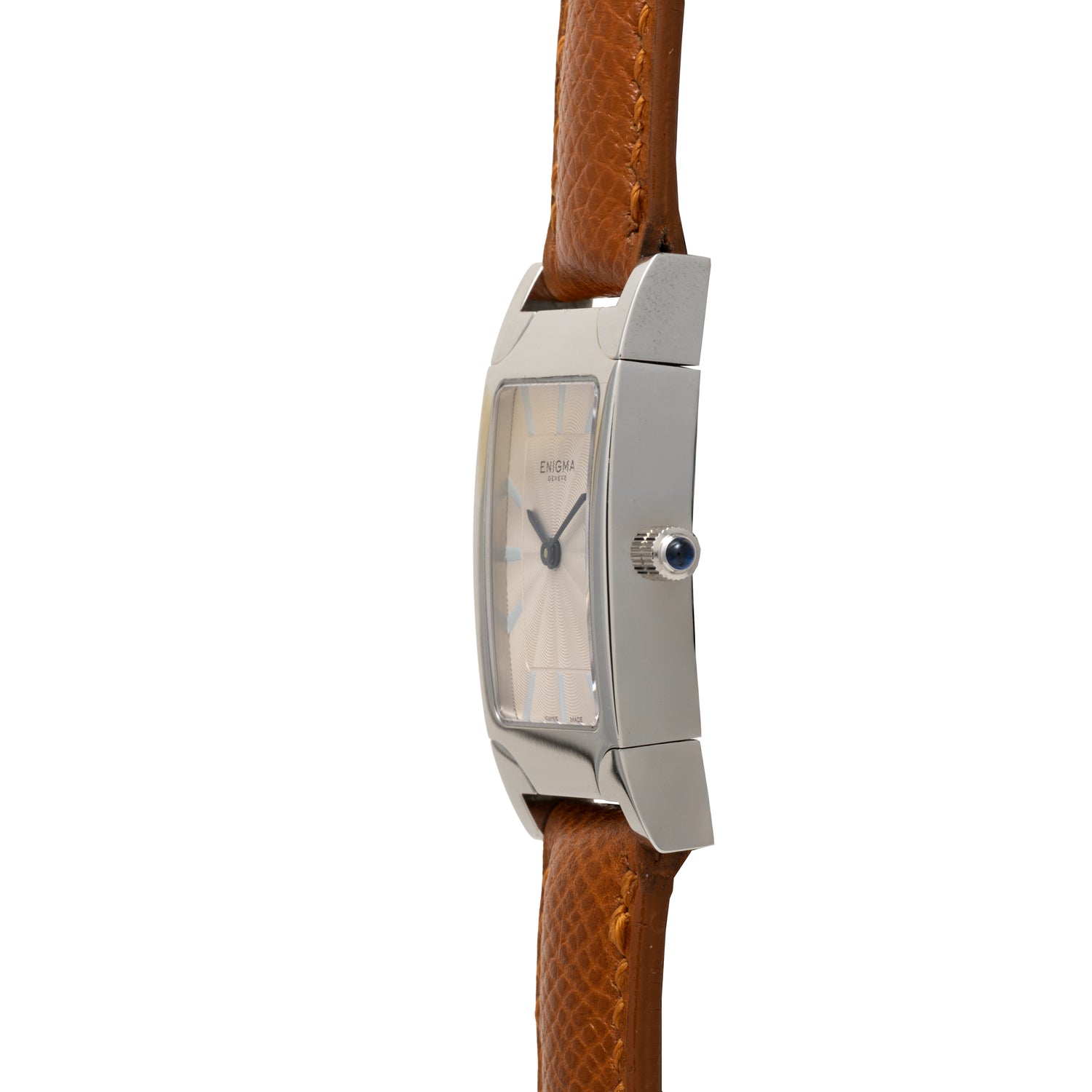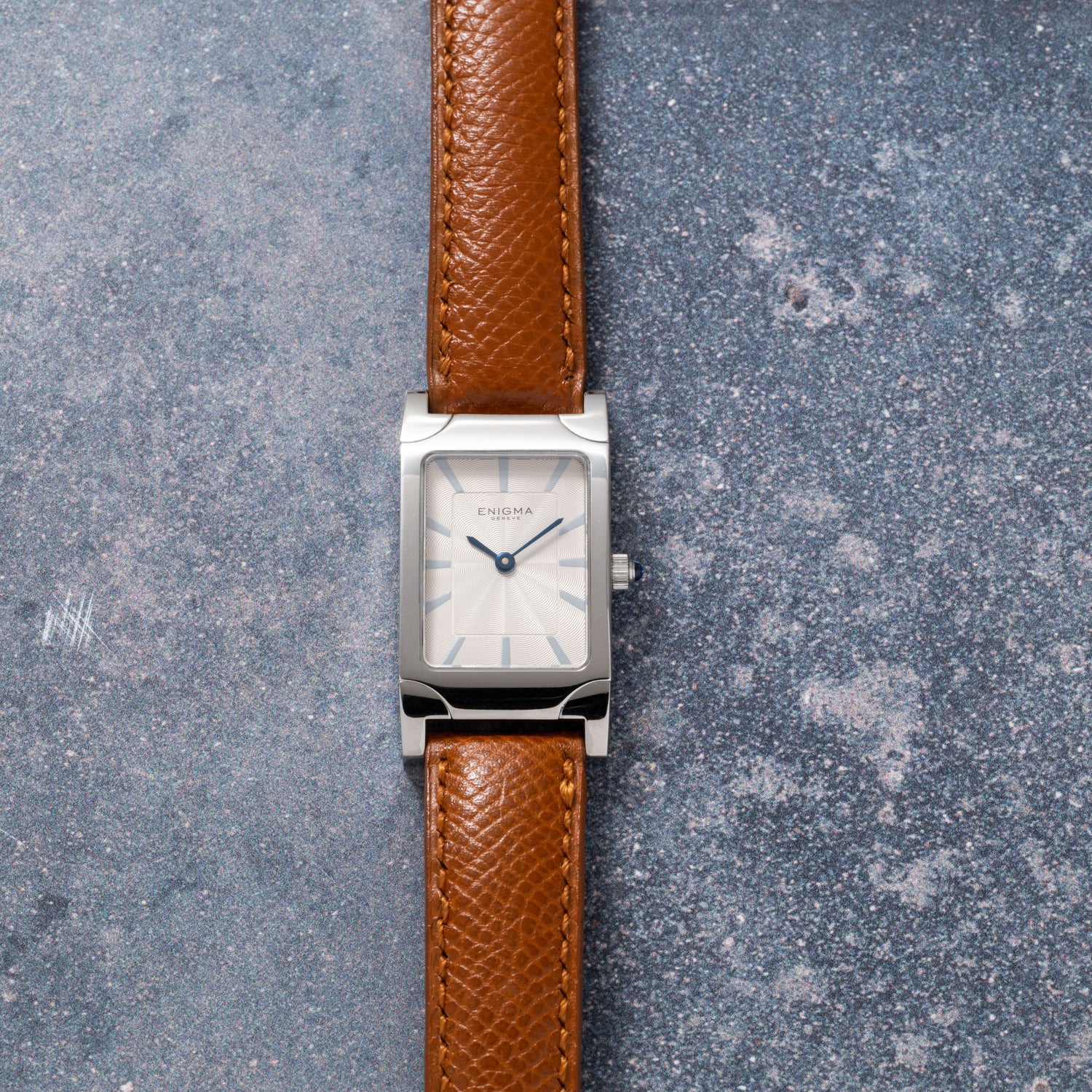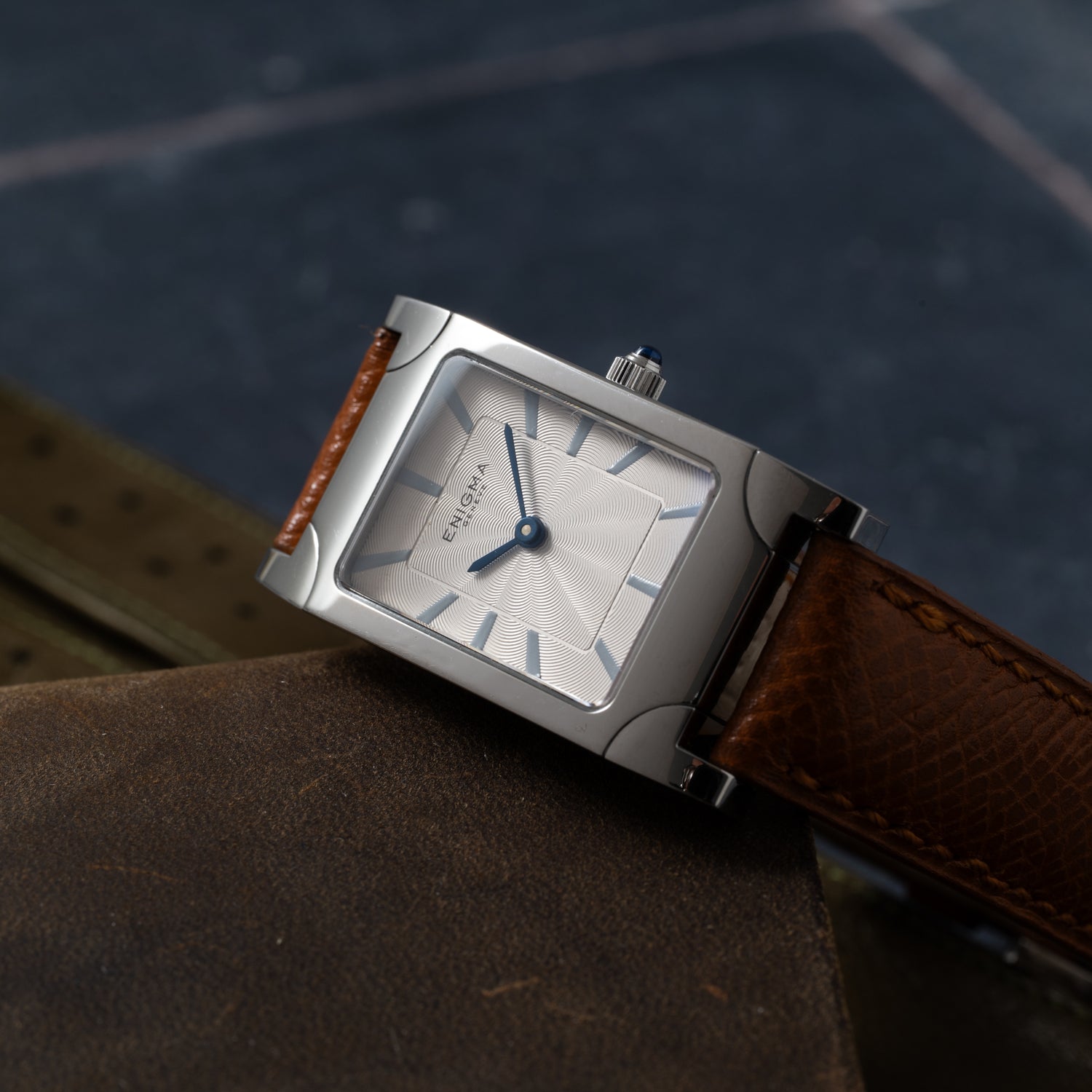 This particular Enigma, a Spyder II, is emblematic of the firm's bold design philosophy: Housed in a 20mm stainless steel case with a blue cabochon crown and a sapphire crystal, it features a smooth bezel and elongated lugs for a spectacular look, plus a beautiful, silvered guilloché dial with trapezoidal indices and a blued steel handset. The dial design, with its spiraling guilloche was said to be inspired by the aesthetic of a spider web.