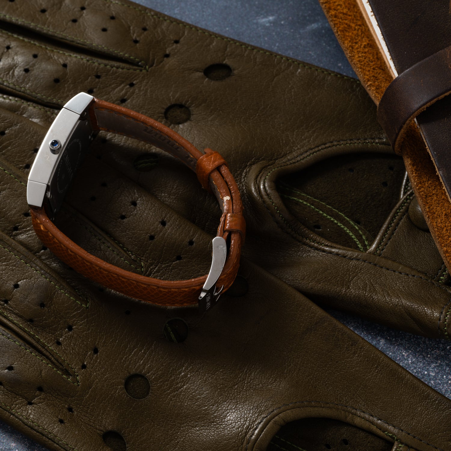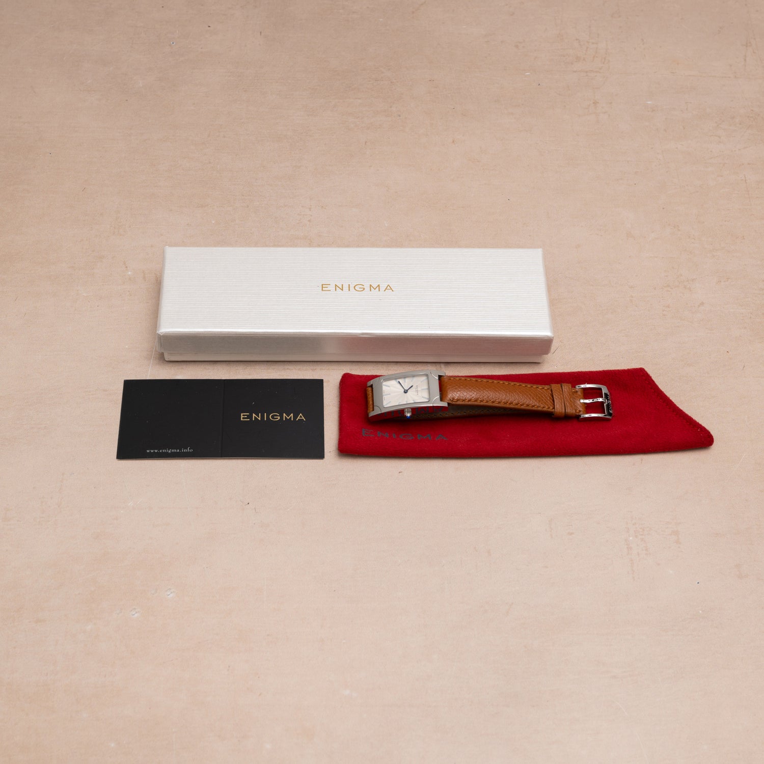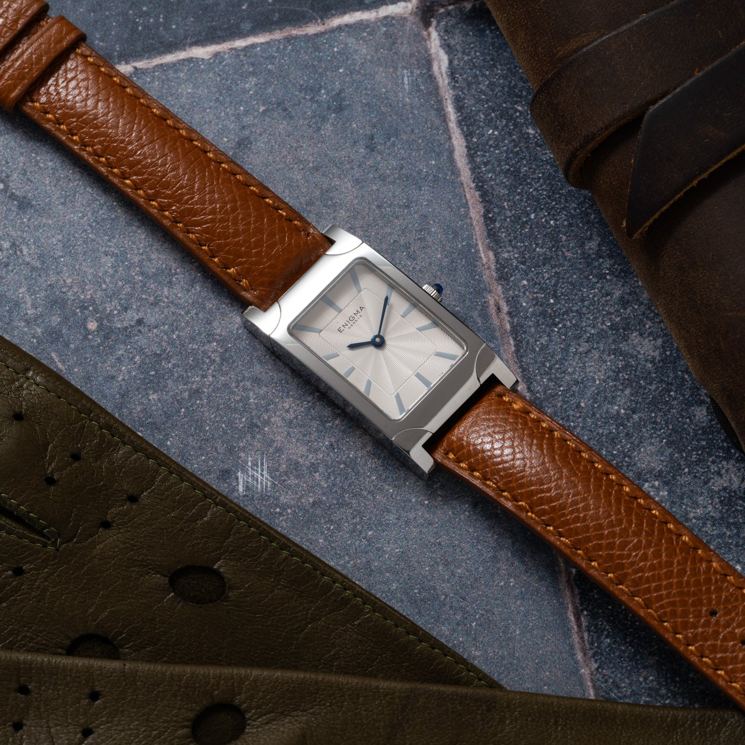This particular Enigma, a Spyder II, is emblematic of the firm's bold design philosophy: Housed in a 20mm stainless steel case with a blue cabochon crown and a sapphire crystal, it features a smooth bezel and elongated lugs for a spectacular look, plus a beautiful, silvered guilloché dial with trapezoidal indices and a blued steel handset. The dial design, with its spiraling guilloche was said to be inspired by the aesthetic of a spider web.