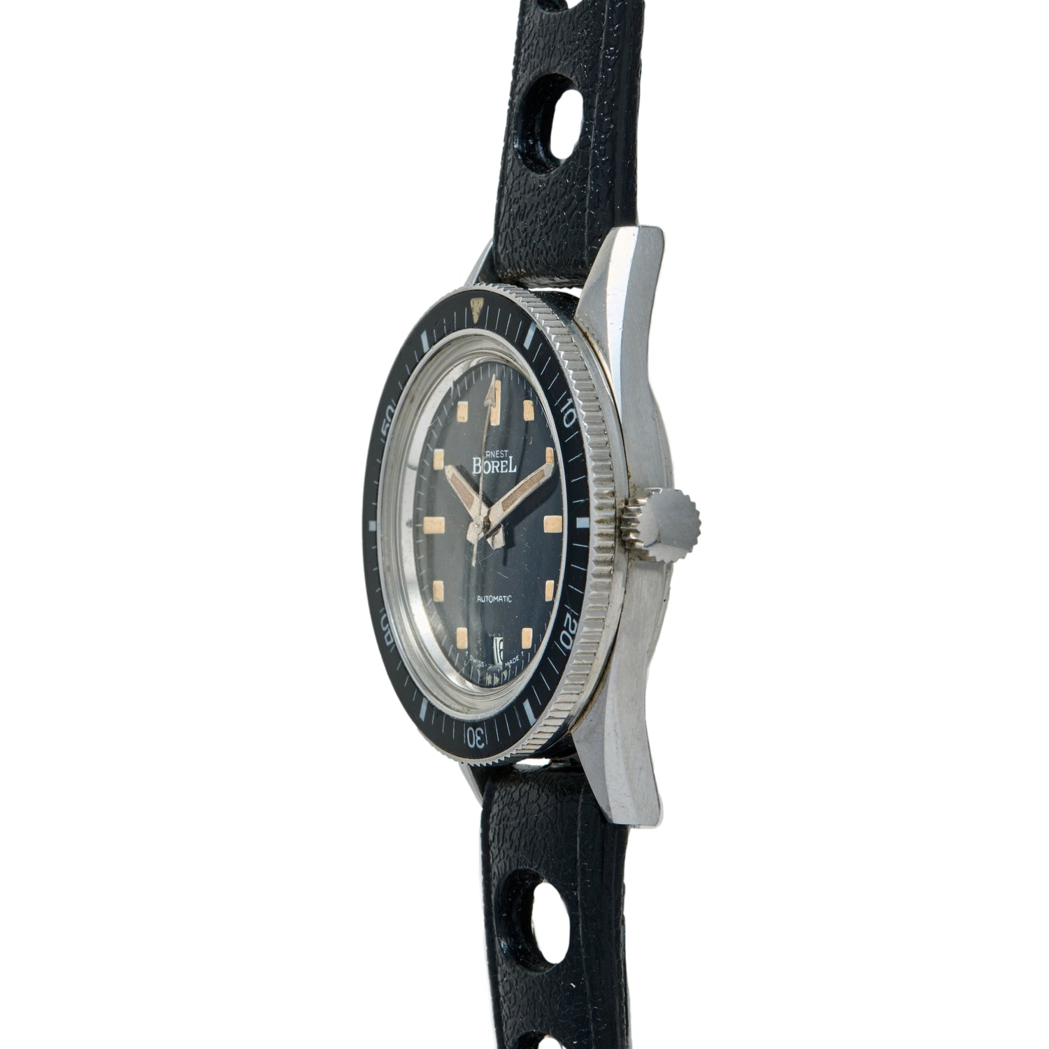 This diver from Swiss firm Ernest Borel may look like a Fifty Fathoms knockoff — but that's not quite the whole story. Back in the mid-20th century, many companies used the same parts suppliers for their watches, which explains why this neat tool watch does in fact look like the spitting image of Blancpain's famous diver. Measuring 39mm in stainless steel with faceted lugs, a large, unsigned crown, an acrylic crystal, and a bidirectional bezel with a fully-hashed dive insert, it features a black dial with an open, outer minute track, luminous square and rectangular indices, and a luminous 'sword' handset. (In short, this is one good-looking vintage diver!)