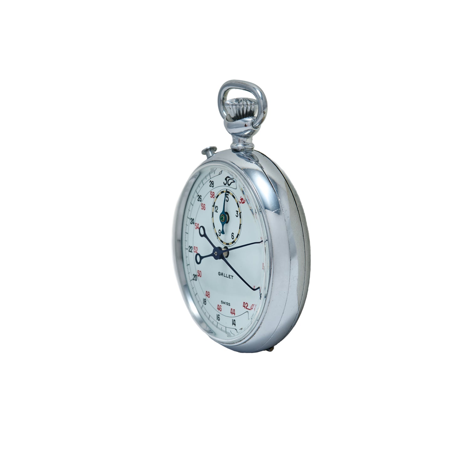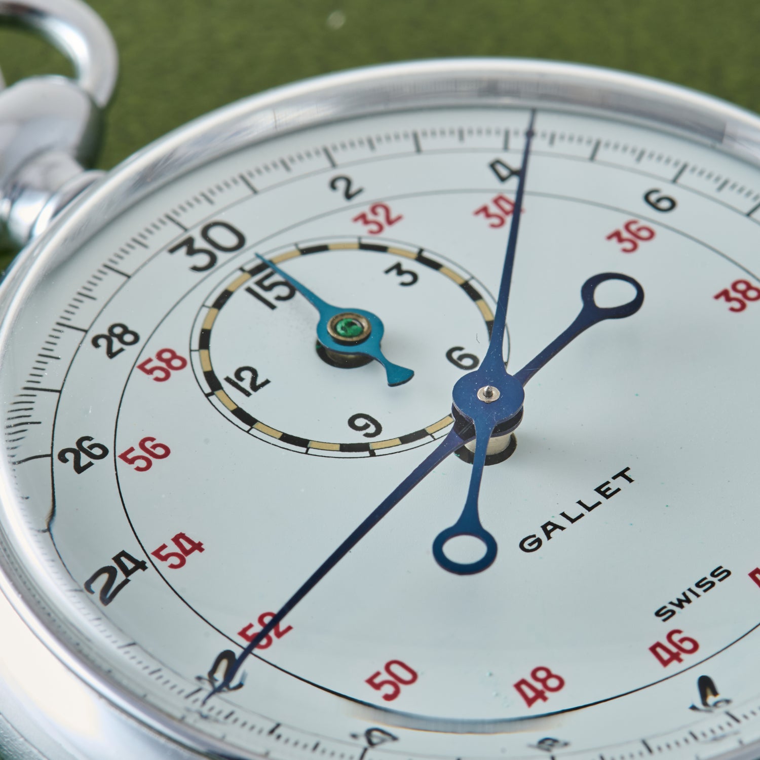 This particular timepiece is a vintage Gallet stopwatch from the mid-20th century. However, it's no typical stopwatch, but a rattrapante (or "split-seconds") model. Equipped with dual chonograph seconds hands, it can measure two events concurrently, thus differentiating between (and recording) separate lap times, for example. More complicated than your typical stopwatch, such timepieces were used to time horse or automobile races.Â