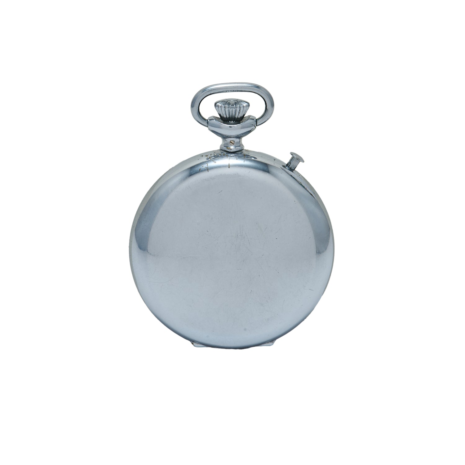 Measuring 49mm in stainless steel, it features an acrylic crystal, an ornate winding and start/stop 'onion crown,' and a small reset pusher at 10:30. Its glossy white dial boasts an outer 1/5th-seconds track in black; a 30-minute register in black 'Arabic' indices; an inner 60-minute register in red 'Arabic' indices; a 15-minute recorder below 12 o'clock; and a black handset. Powered by a hand-wound Jules Racine movement with seven jewels, it's a rare fine in excellent condition.