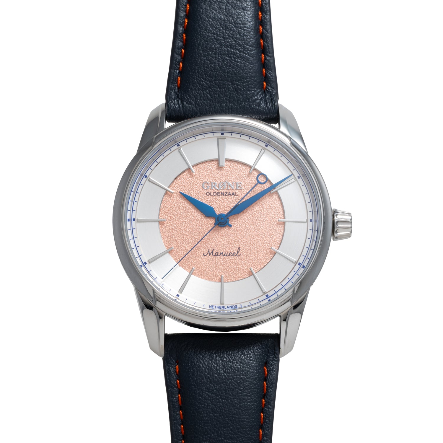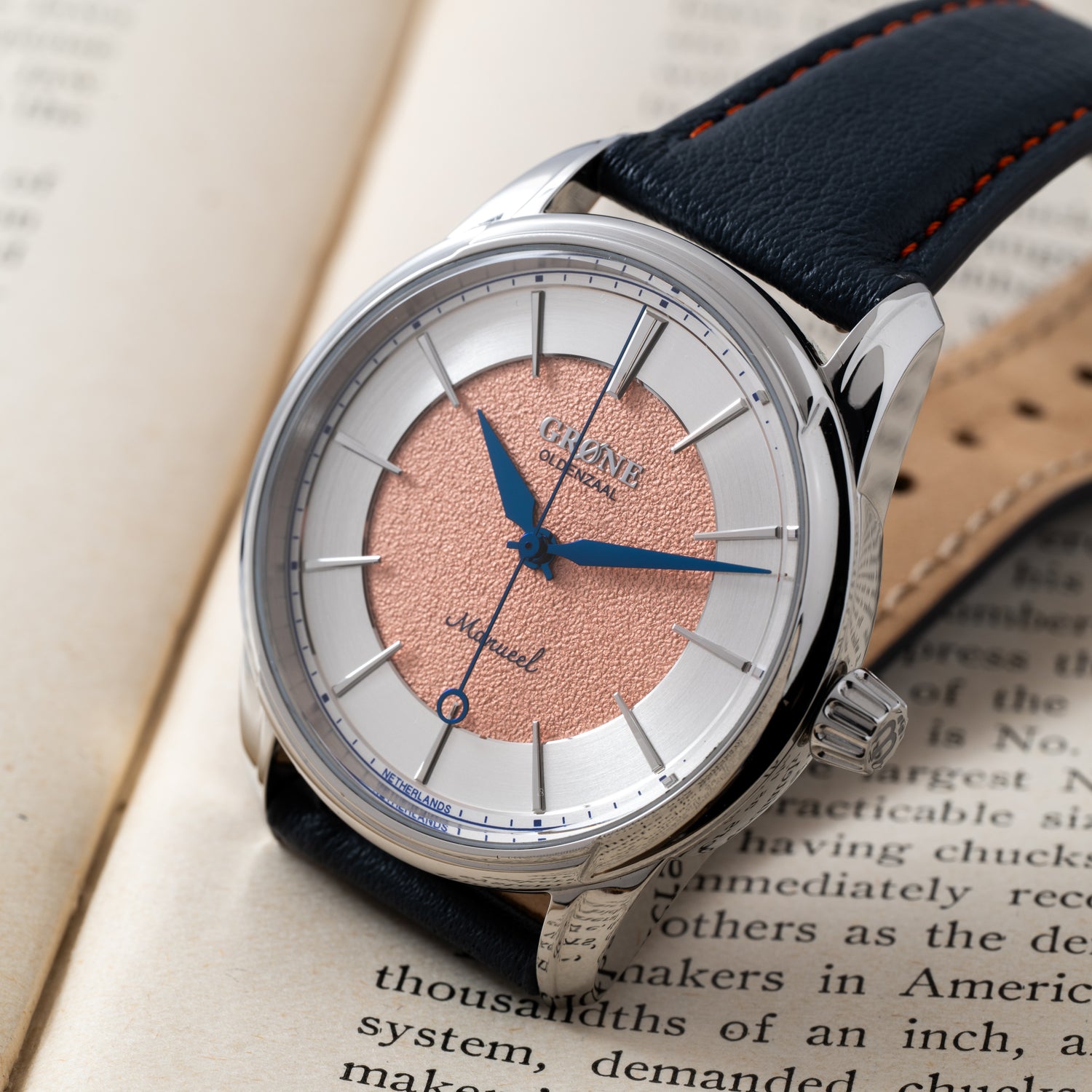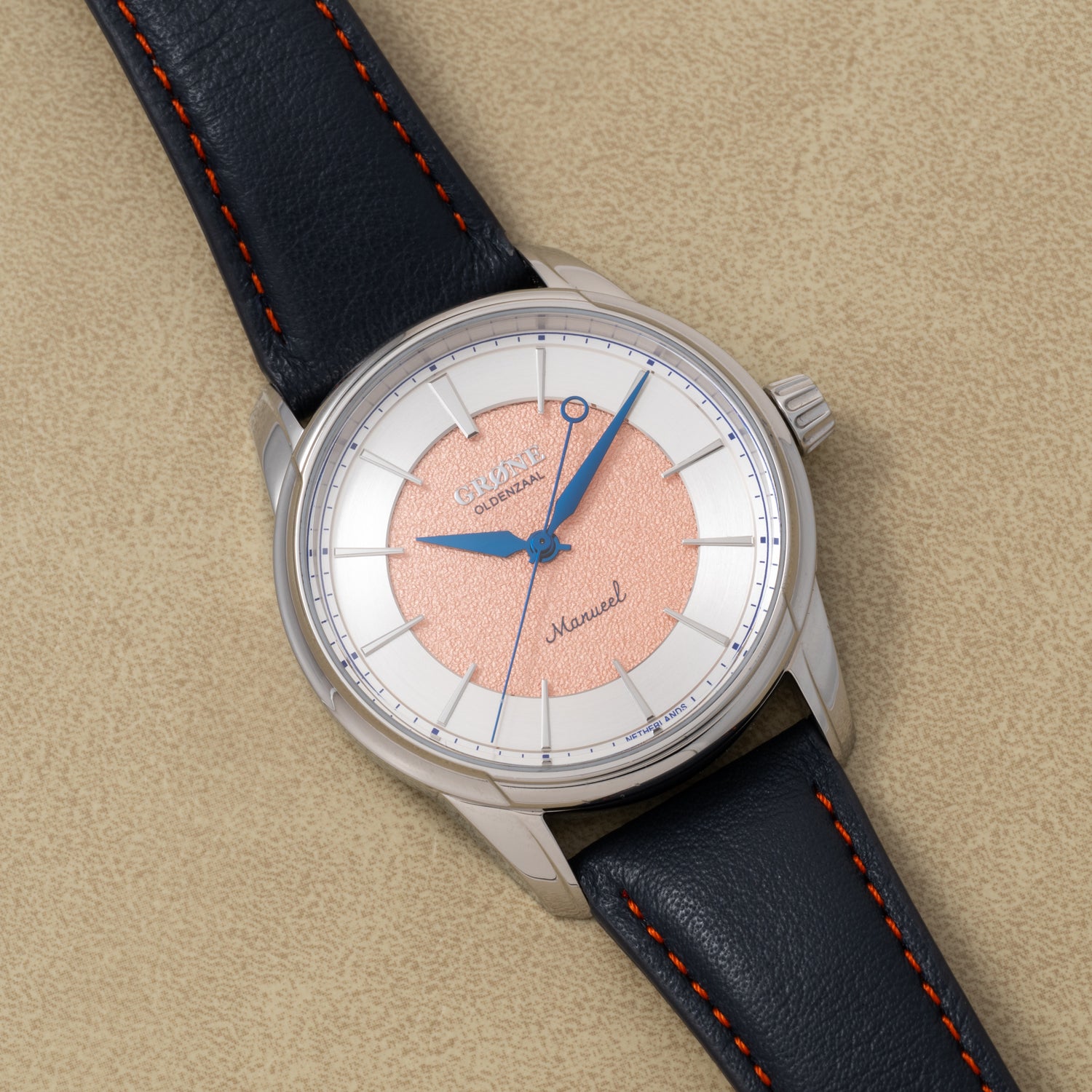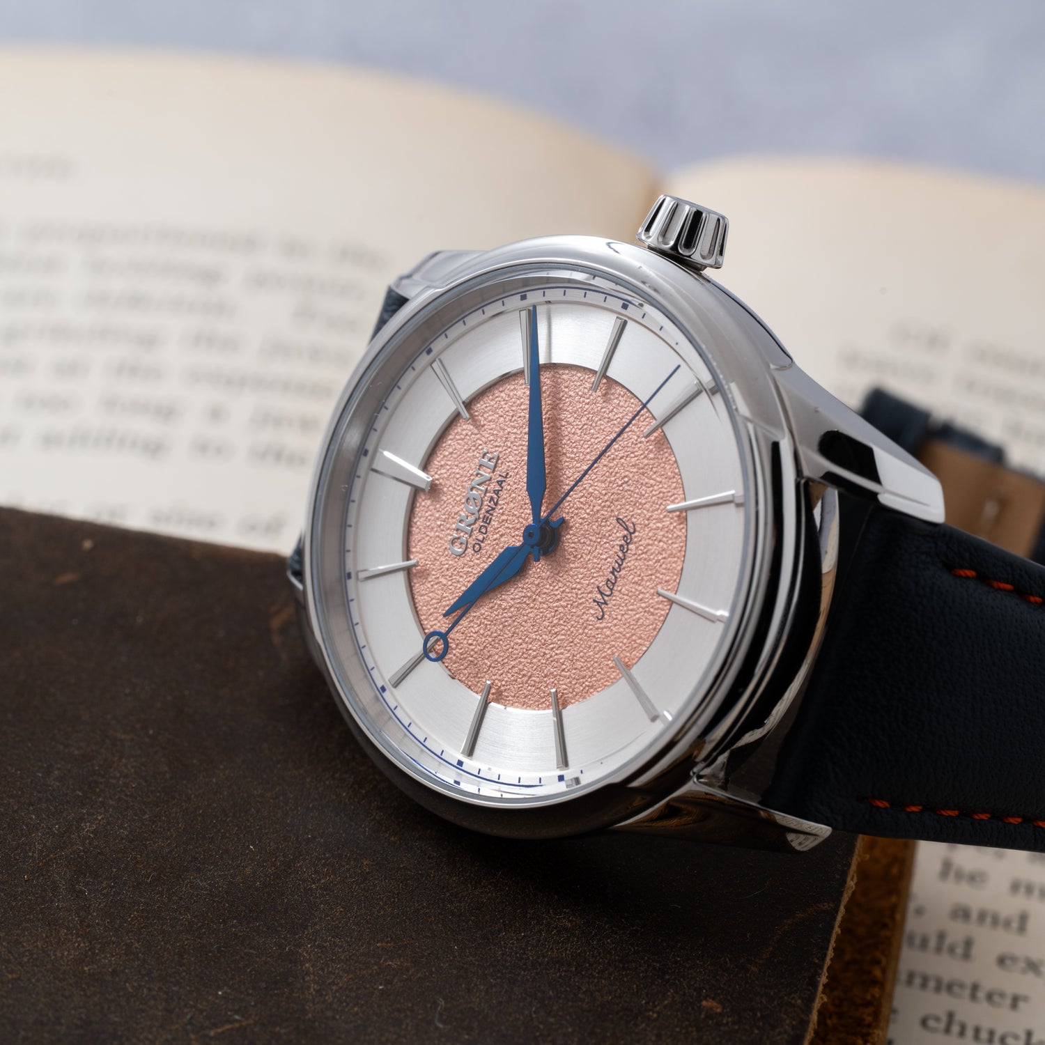 The Grönefeld brothers possess a true love for horology, and decided to create a second brand to support a more accessible side of the market. the Grøne brand was thus conceived. This Grøne Manueel One. Offered at a very affordable price point, this piece packs a serious punch with a gorgeous tremblage salmon dial surrounded with a silver outer rings and a variety of other refinements.