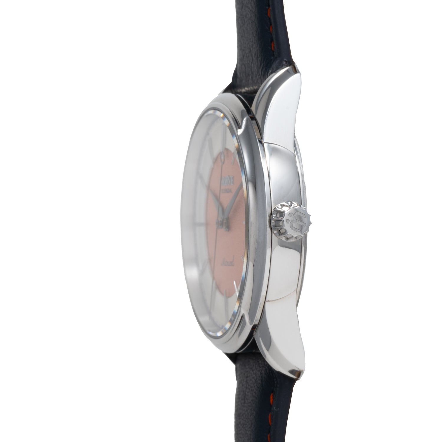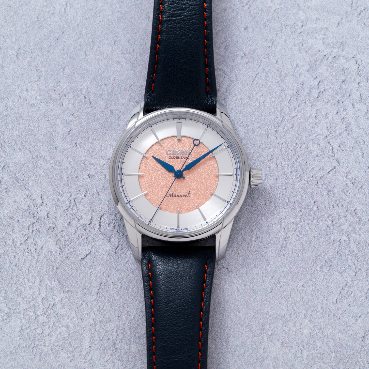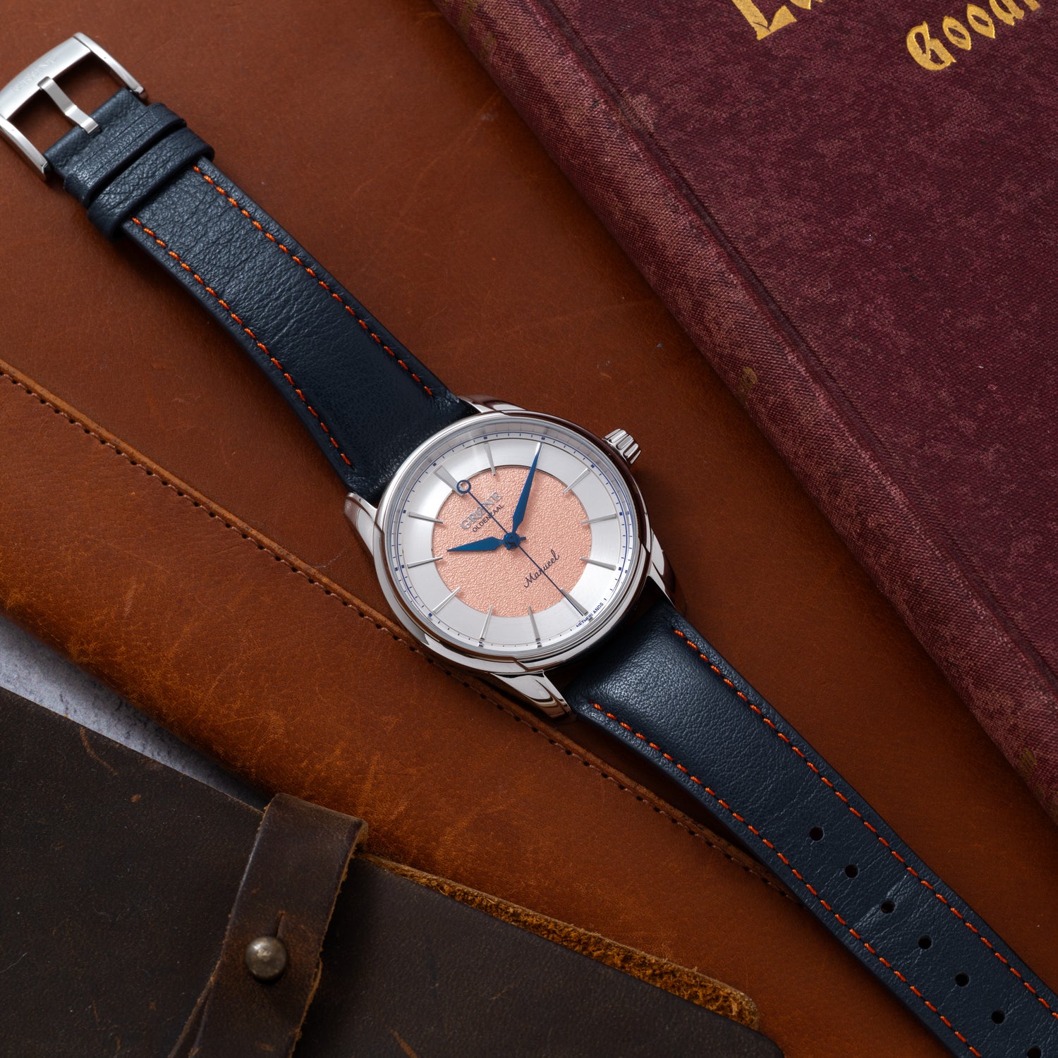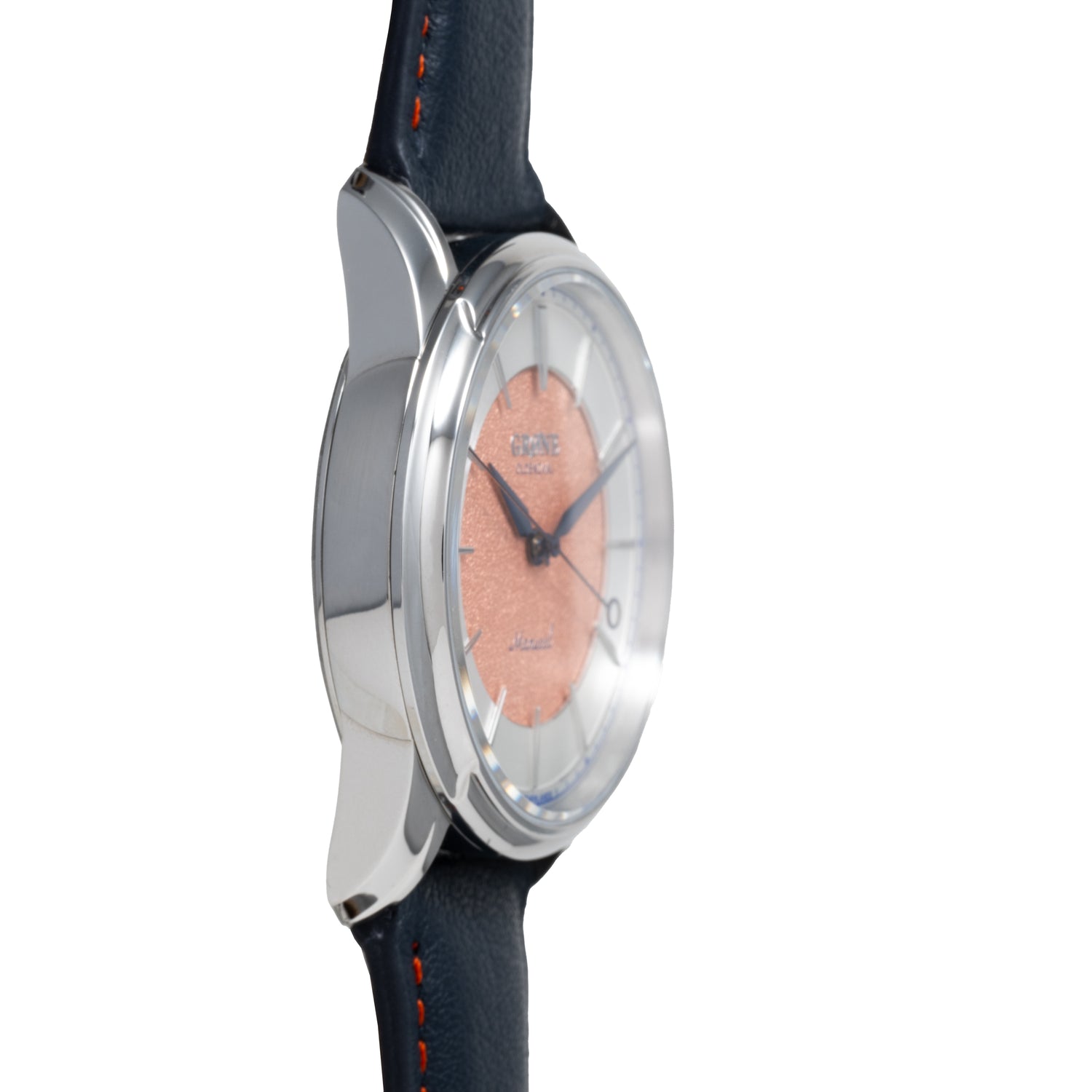 The Grönefeld brothers possess a true love for horology, and decided to create a second brand to support a more accessible side of the market. the Grøne brand was thus conceived. This Grøne Manueel One. Offered at a very affordable price point, this piece packs a serious punch with a gorgeous tremblage salmon dial surrounded with a silver outer rings and a variety of other refinements.