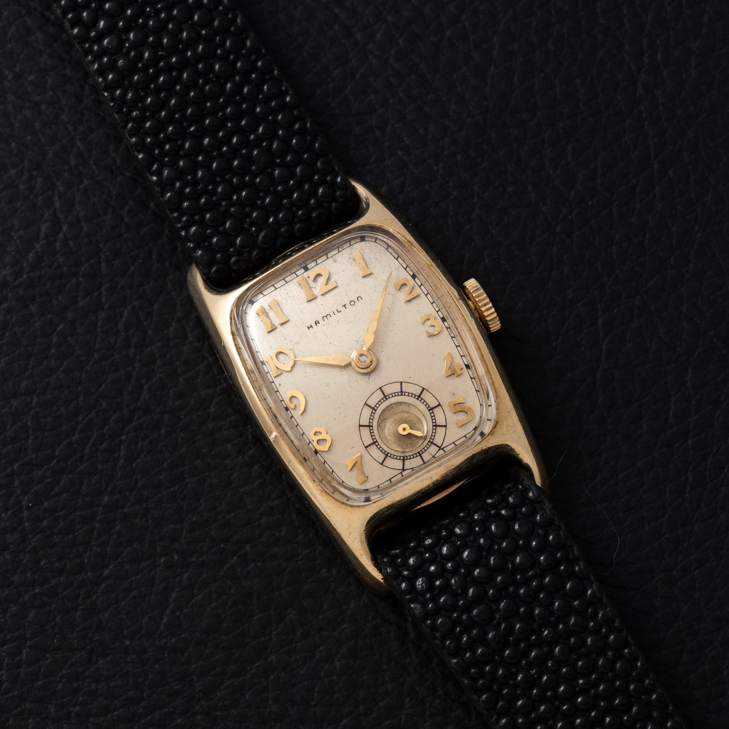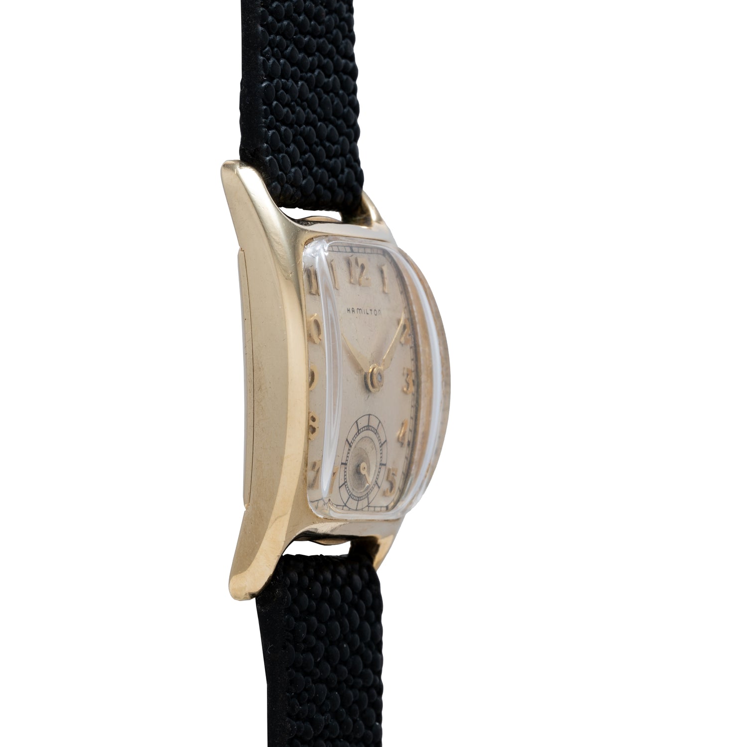 This particular piece, a Hamilton Boulton, is one of the unsung heroes of the Hamilton archive. Featured in the Indiana Jones franchise, the Boulton captures the aesthetic of American fine watchmaking with its rounded case flanks, stylized applied numerals, a 'lance; handset, and subsidiary seconds upon a non-luminous silver dial. Housed in a 23mm gold-filled case, it's powered by a manually-wound Hamilton movement and comes paired to a black leather strap with a pebbled finish.