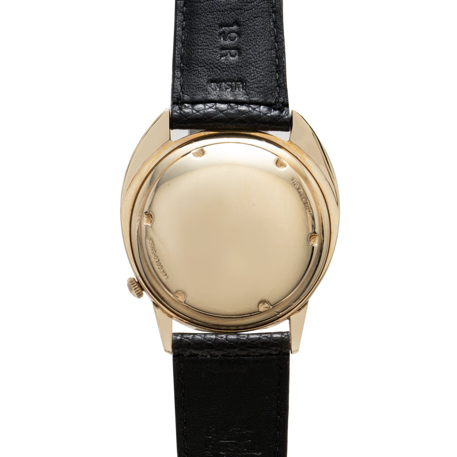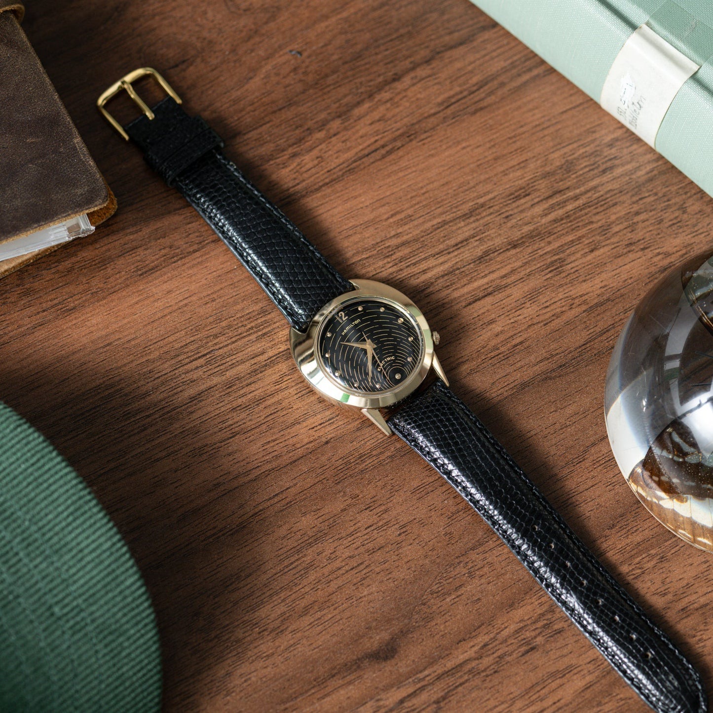 This piece features a classic 50s space age cushion case with a futuristic dial with dot indices. The dial features concentric circling revolving around the 6 o'clock index. The crown is placed at the 4 o'clock position, which further emphasizes the ahead-of-its-time aesthetic of this unique watch.