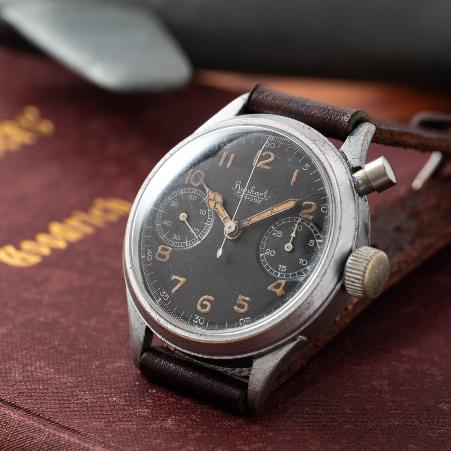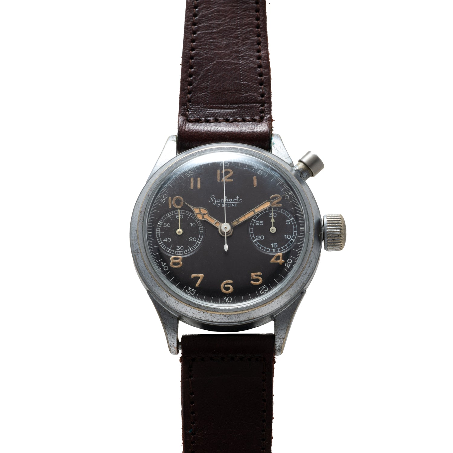 This peice is an excellent representation of 1940s Hanhart--- patinaed, beautiful, and utilitarian. Featuring a charcoal dial with lovely cakey Radium hands and numerals, and a single punchy pusher at 2 o'clock to control the chronograph functions.